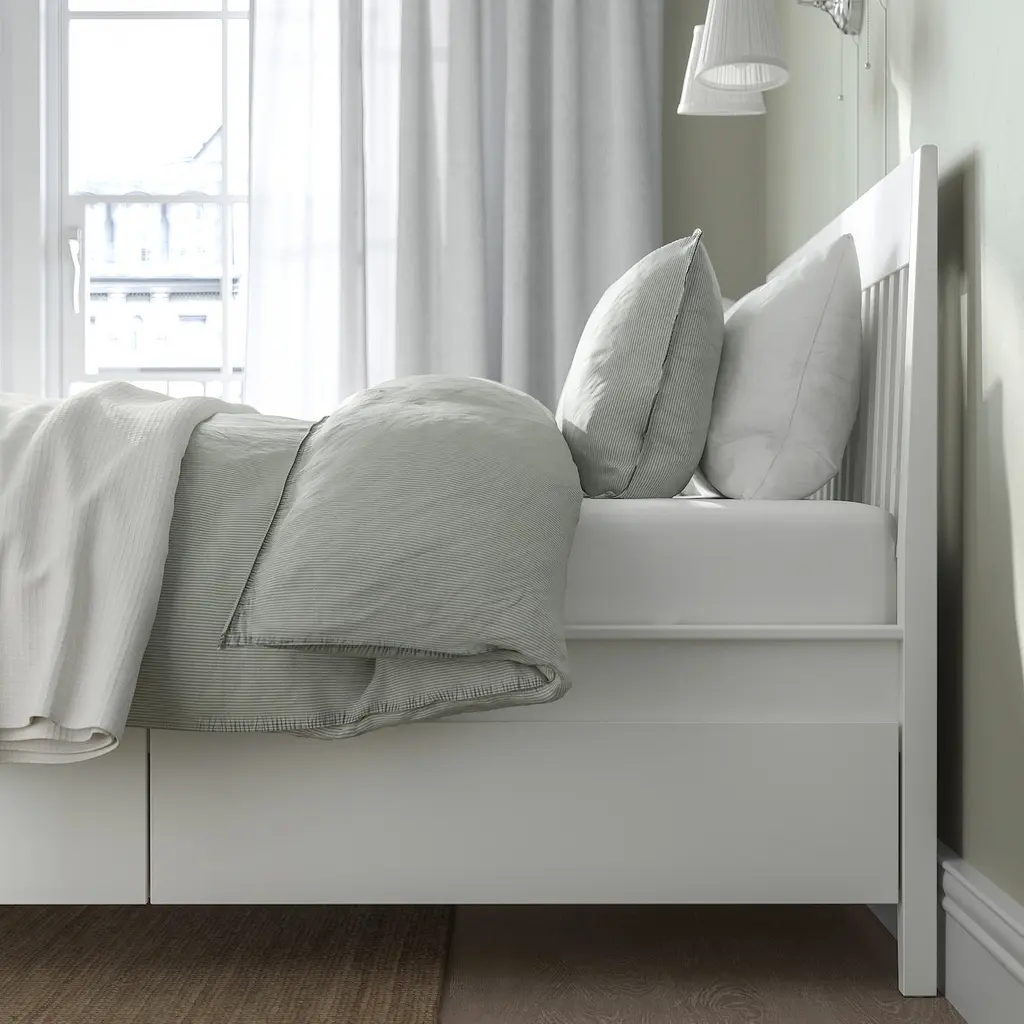 IDANÄS Bed frame with storage - white Queen. 4 spacious drawers under the bed make the best use of the space. They are great for storing extra duvets, pillows and bed linens – or your clothes. The drawers close silently and softly, thanks to the integrated soft-closing function.
