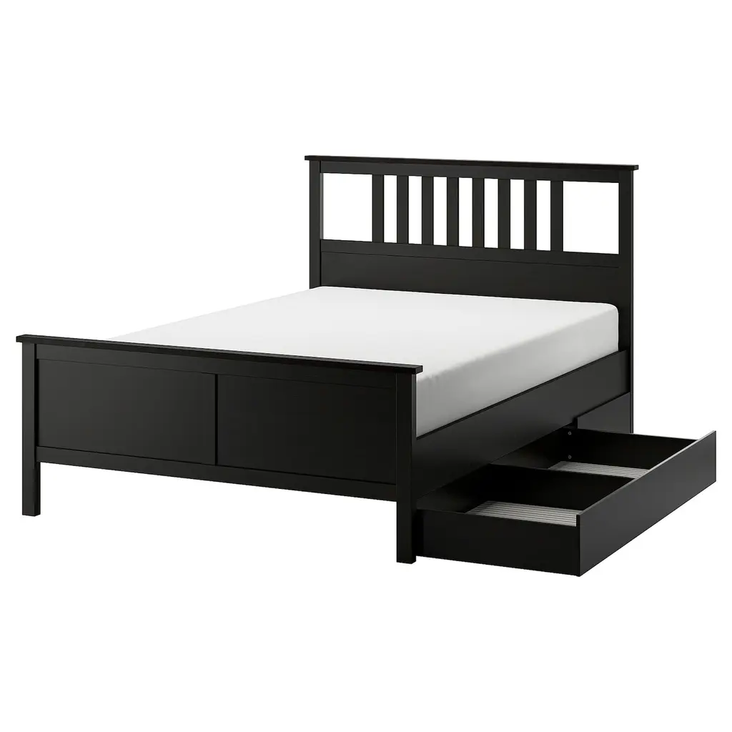 IDANÄS Bed frame with storage - white/Lönset Full/Double. 4 spacious drawers under the bed make the best use of the space. They are great for storing extra duvets, pillows and bed linens – or your clothes. The drawers close silently and softly, thanks to the integrated soft-closing function.