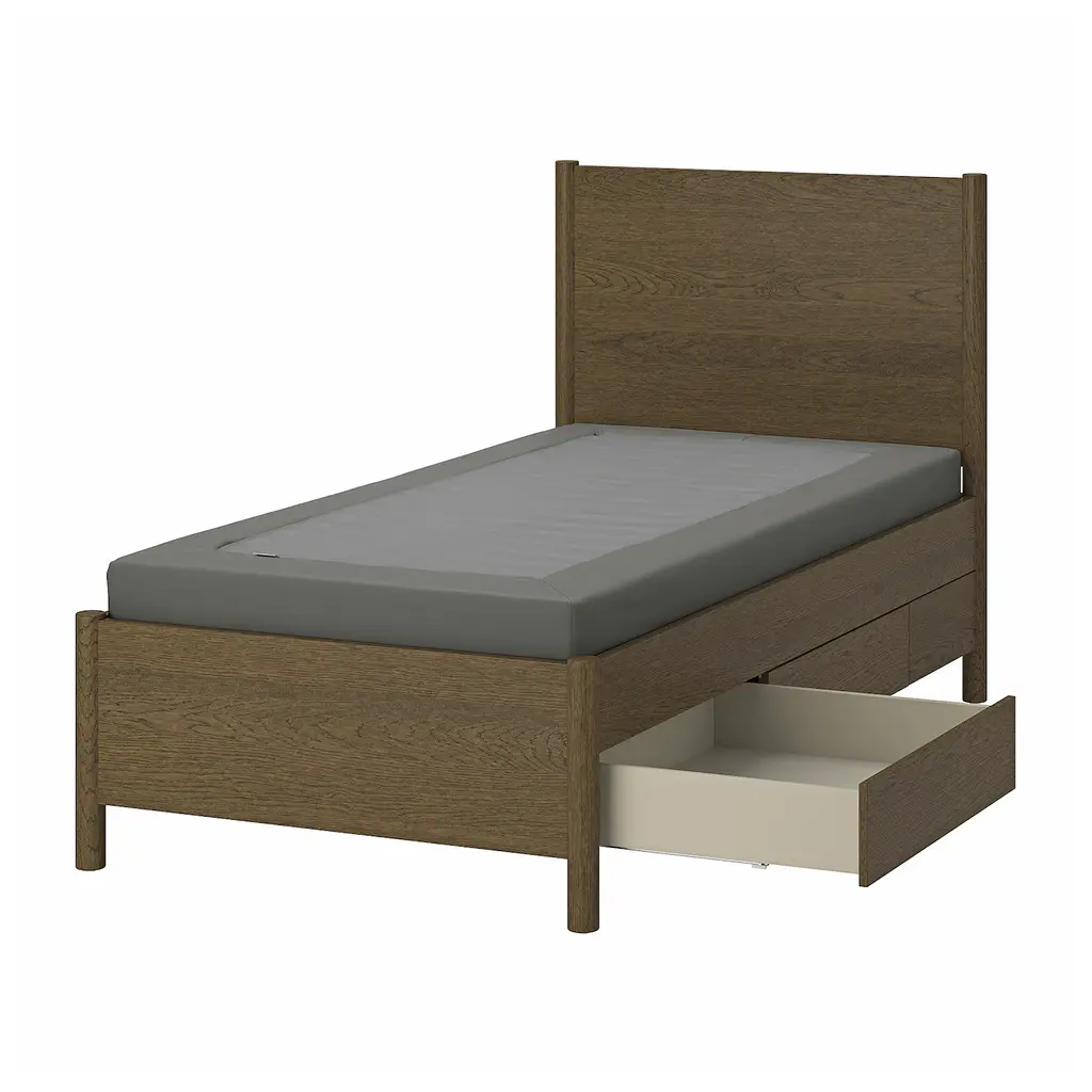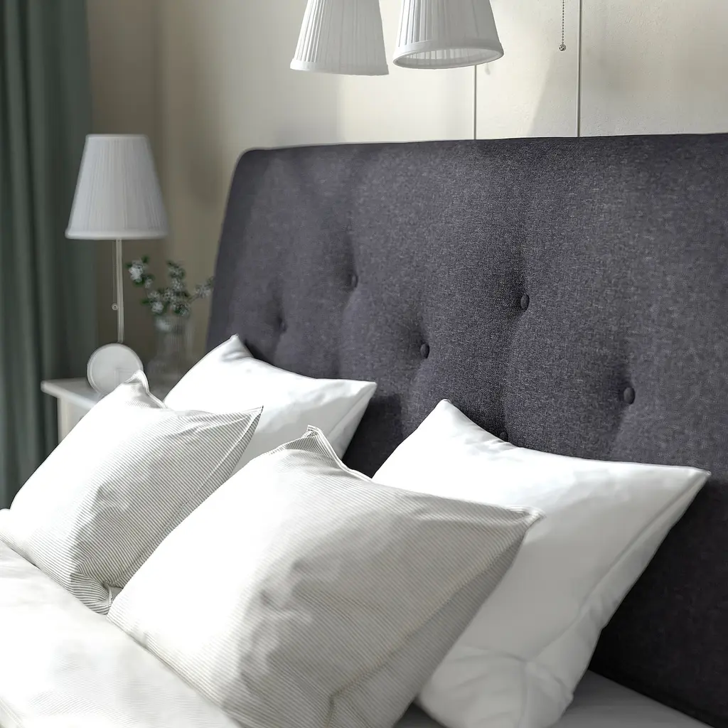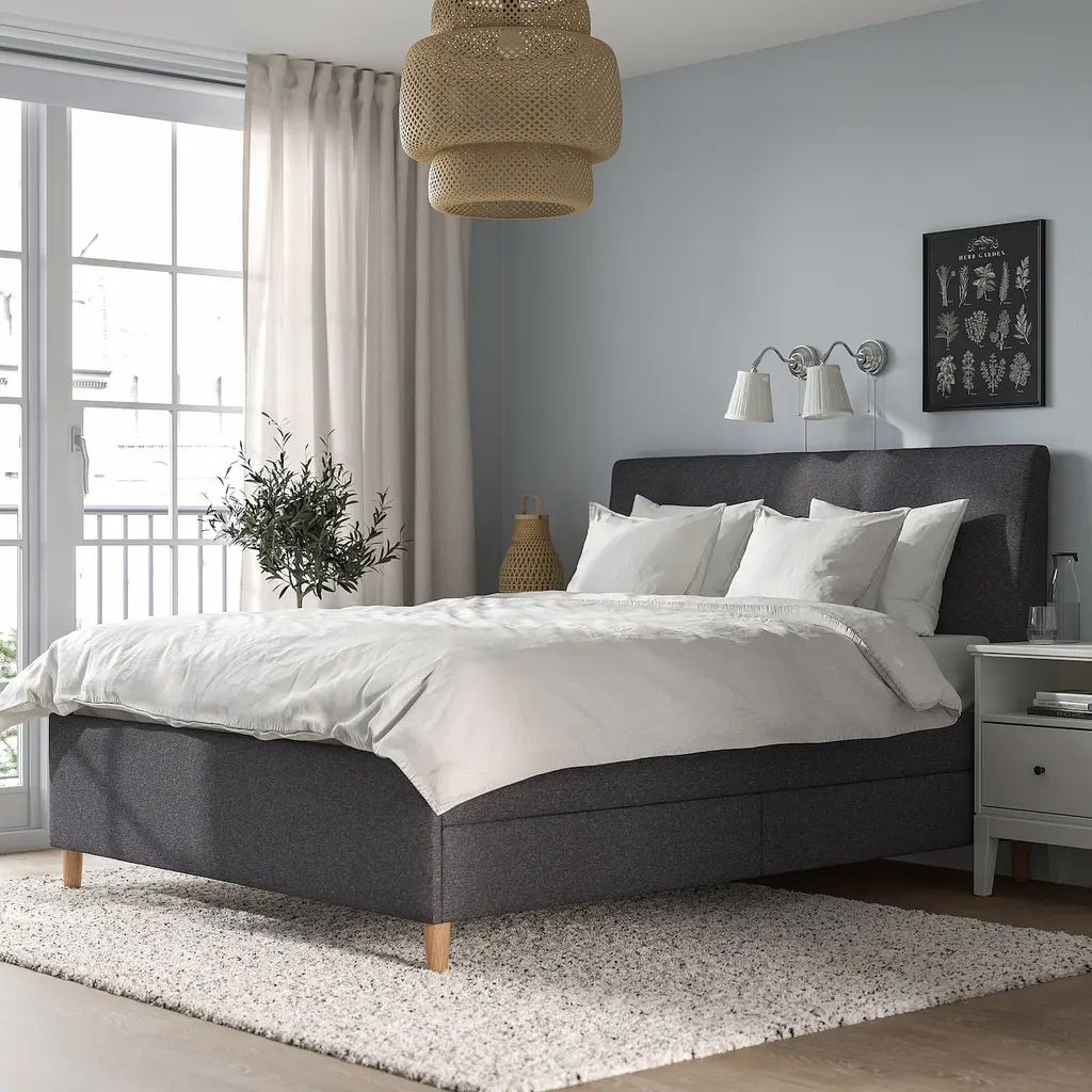 IDANÄS Upholstered storage bed - Gunnared dark gray Queen. IDANÄS upholstered storage bed has a thick, sloping headboard that provides comfortable support for your back - perfect for lazy mornings and long evenings when reading a newspaper or a book in bed.