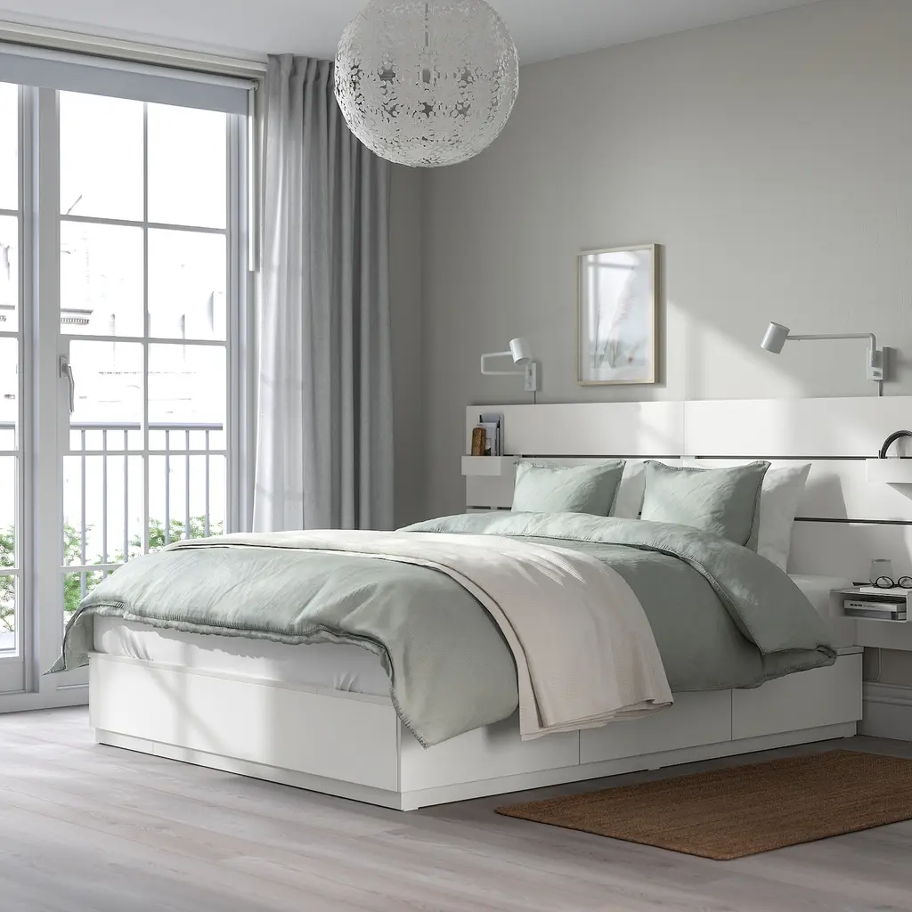 NORDLI Bed with headboard and storage - white King. Ample storage space is hidden neatly under the bed in 6 large drawers. Perfect for storing duvets, pillows and bed linen. Soft-closing drawers run smoothly, slowly and silently. Easy to bring home since the headboard is divided into two pieces.