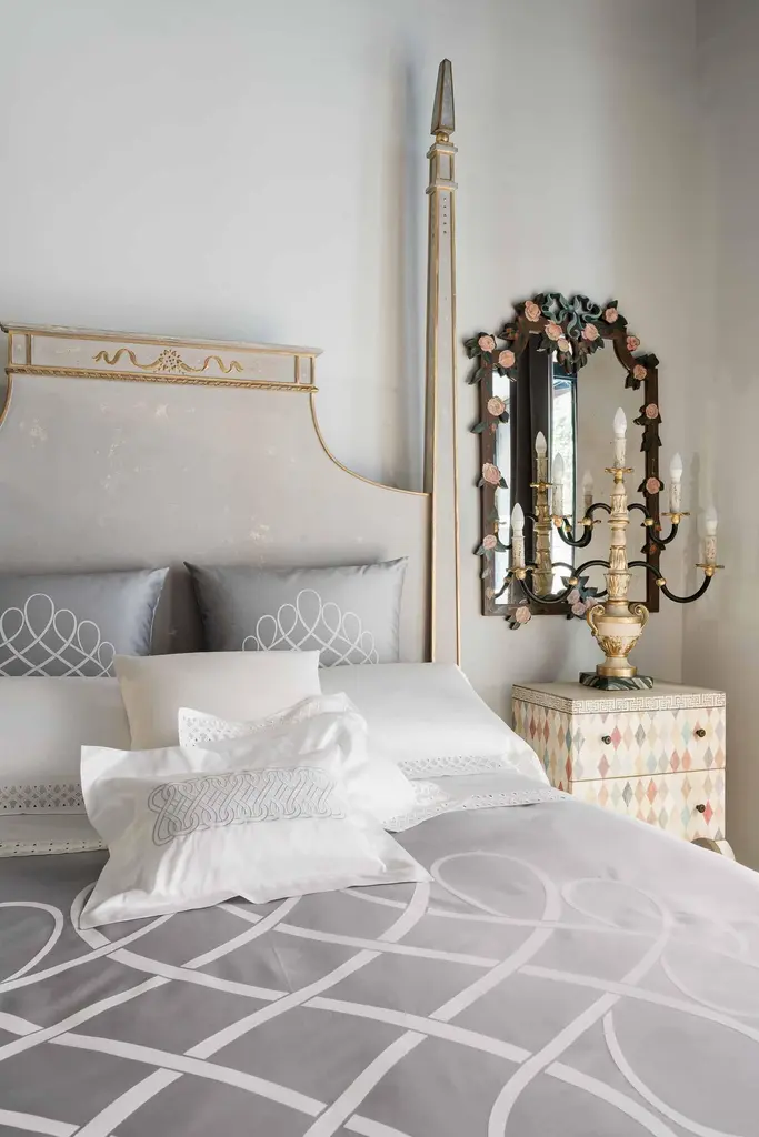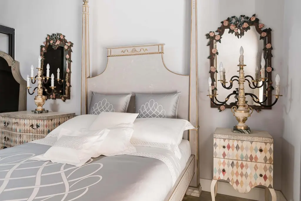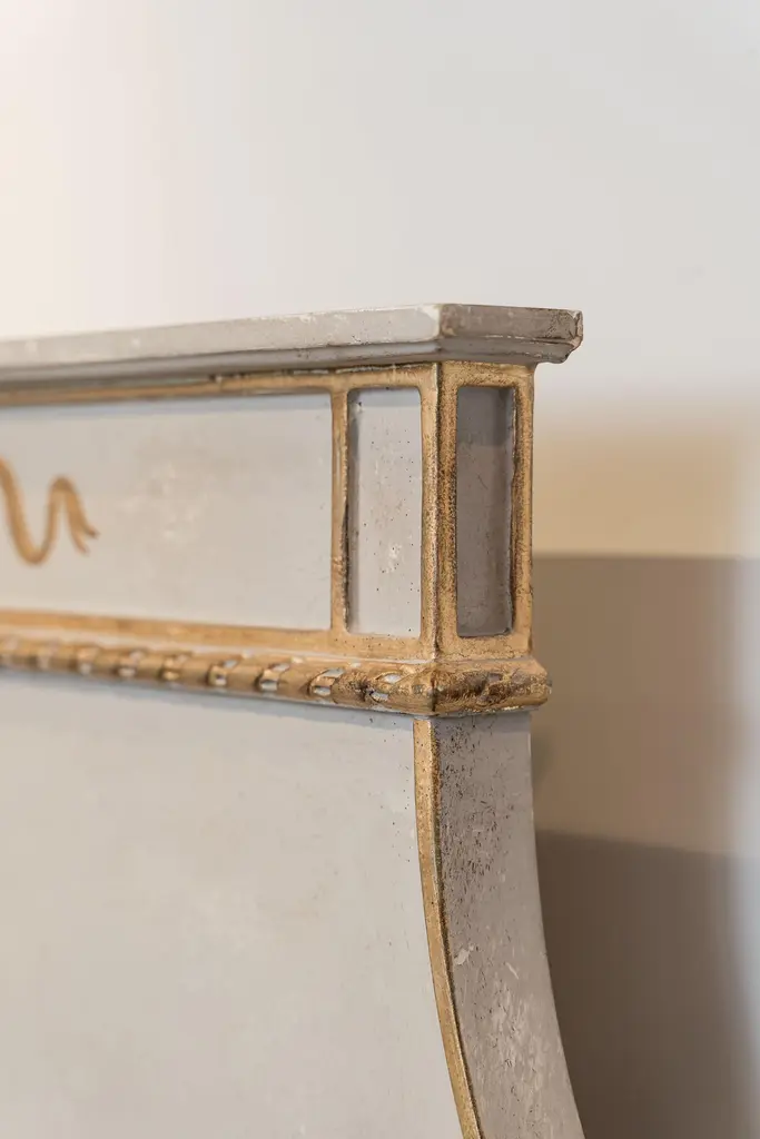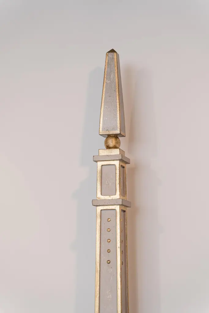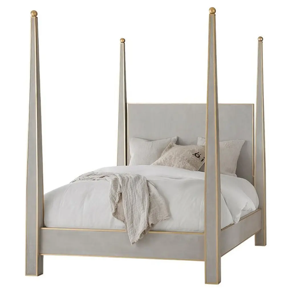 From our hand-painted furniture collection, we are pleased to introduce you to our queen size, light grey Tintoretto Bed with full posts and obelisc finials.This Tintoretto Bed is finished with our Argento (light grey) main color, contrasting gold-leaf decors and carvings. Lastly, it is finished with our traditional venetian agings that add a unique flavour to all of our hand-painted furniture pieces. The soft color palette may very well fit both a traditional home and a totally modern environment, with a timeless juxtaposition. Like everyone of our pieces, this Tintoretto Bed is gracefully hand-Painted with 18th Century Venetian Techniques, passed down through the generations of artists from our land. We aim to create pieces that will stand the test of time and will grow together with your homes and families. Customisations of size and design available on request.