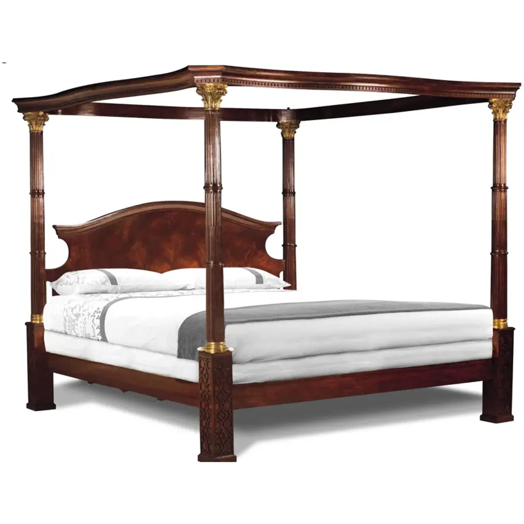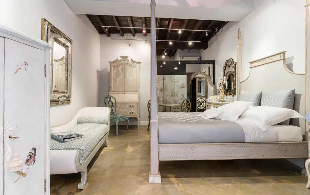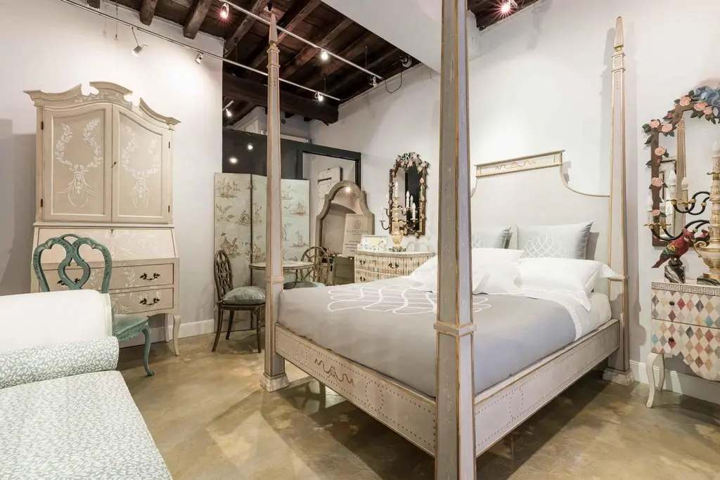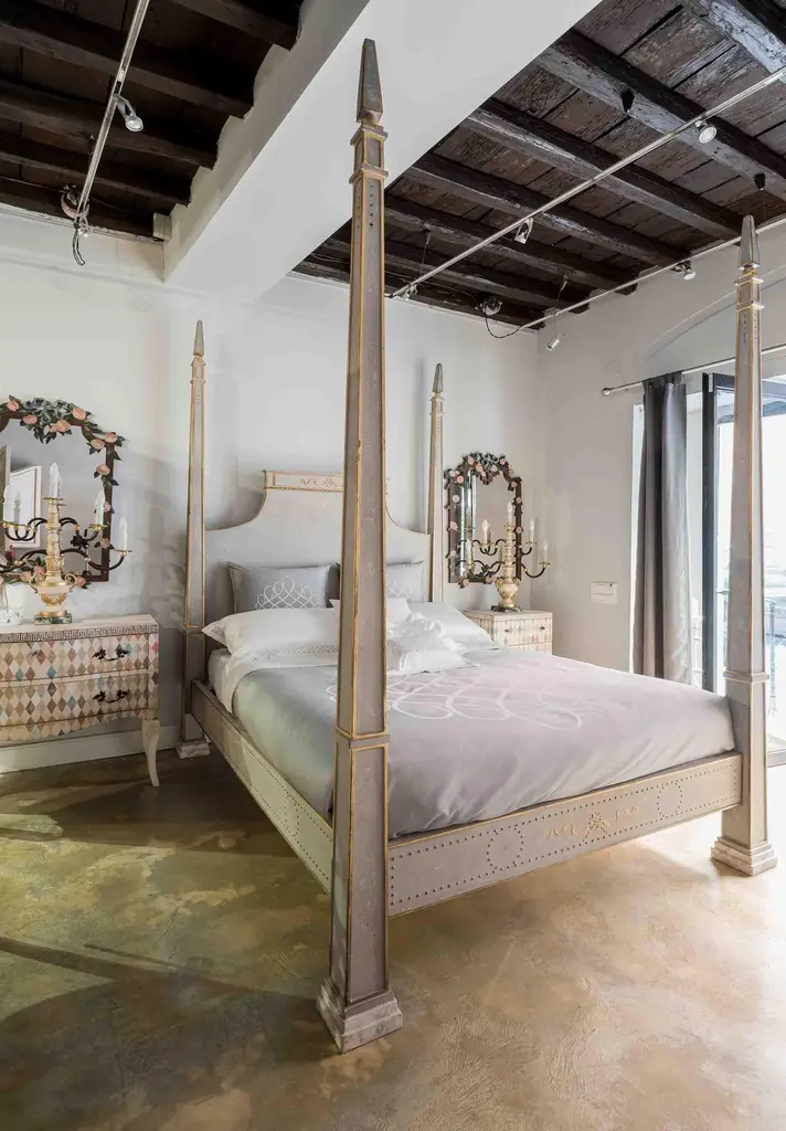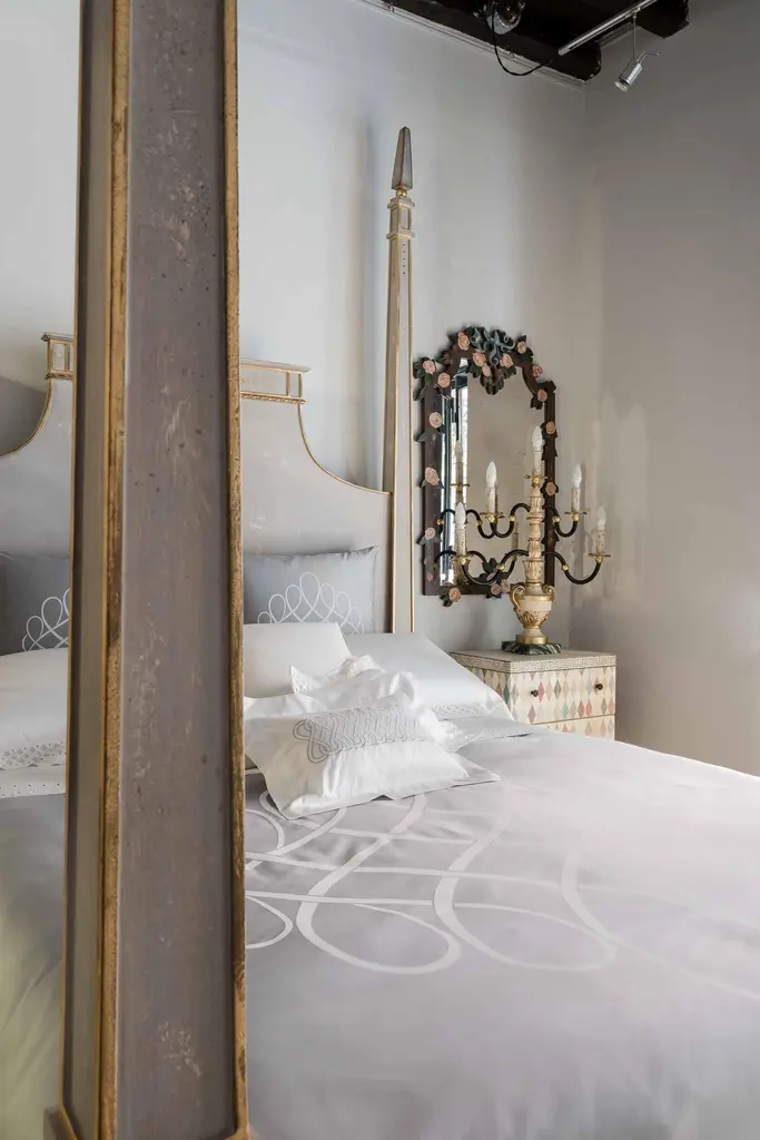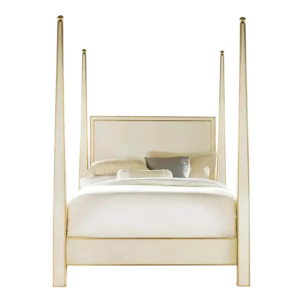 From our hand-painted furniture collection, we are pleased to introduce you to our queen size, light grey Tintoretto Bed with full posts and obelisc finials.This Tintoretto Bed is finished with our Argento (light grey) main color, contrasting gold-leaf decors and carvings. Lastly, it is finished with our traditional venetian agings that add a unique flavour to all of our hand-painted furniture pieces. The soft color palette may very well fit both a traditional home and a totally modern environment, with a timeless juxtaposition. Like everyone of our pieces, this Tintoretto Bed is gracefully hand-Painted with 18th Century Venetian Techniques, passed down through the generations of artists from our land. We aim to create pieces that will stand the test of time and will grow together with your homes and families. Customisations of size and design available on request.