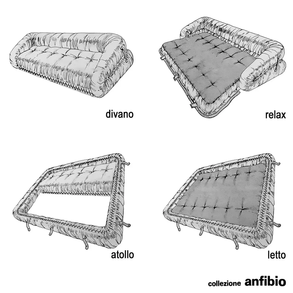 The bed-sofa, designed by Alessandro Becchi together with the Giovannetti staff ha recently celebrated its 50 years.Its history is full of important events and participations. A piece considered a “Classic” of Italian Design, interpreting all-over the world an example and a synonym of “Made in Italy”.New York first of all, where it was exposed at the first significant exhibition of “Design made in Italy”, the fair “The new domestic landscape”, showing to the American public the revolutionary characteristics of Italian design.In this occasion the MoMa itself bought a piece for its permanent exhibition and, in the same year, it was selected and awarded for the prestigious “Compasso d’Oro”.Anfibio sofà is exhibited in 13 museums worldwide. Measure: 190 cm.
