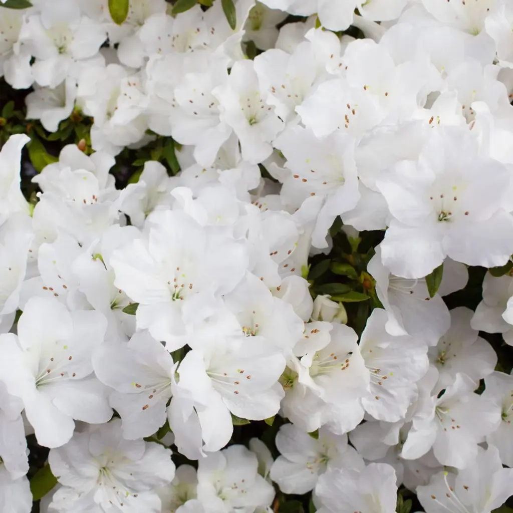 Known as “The Royalty of the Garden,” azaleas light up the spring landscape with a glorious display of lovely blooms year after year. Their vivid colors, profusion of flowers, and adaptability to a wide range of soils and climates make them one of the most popular flowering shrubs amongst gardeners. Boasting delicate, showy white flowers atop deep green foliage, featured azalea variety ‘Pleasant White’ lends a look of sophistication and understated elegance to your landscape. Azaleas are ideal for gardens beds, containers, shrub borders, hedges, foundation plants and mass plantings.