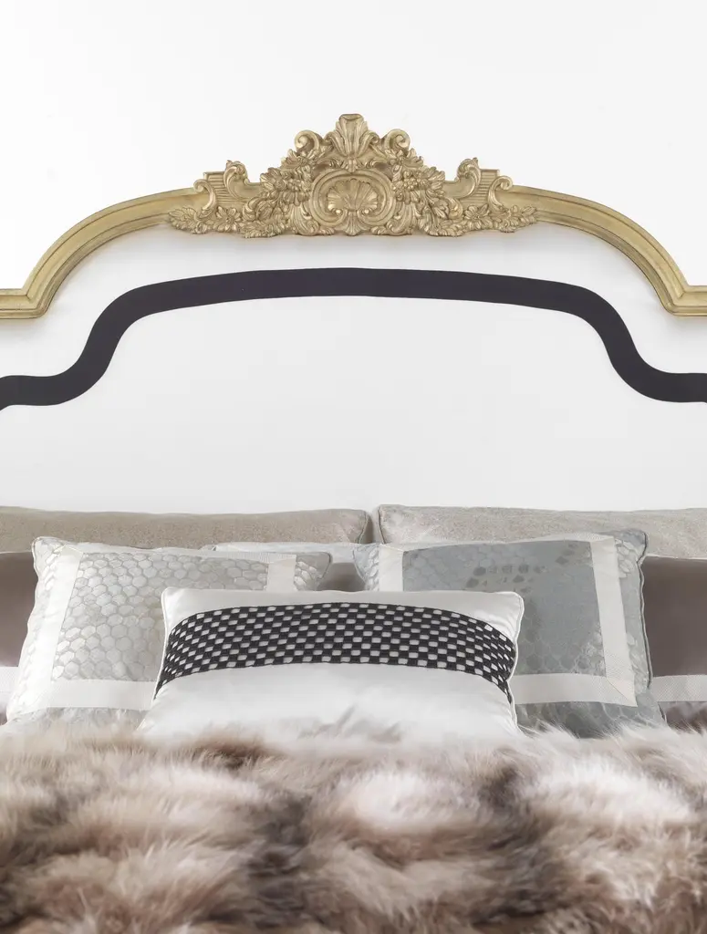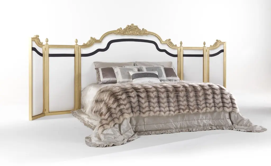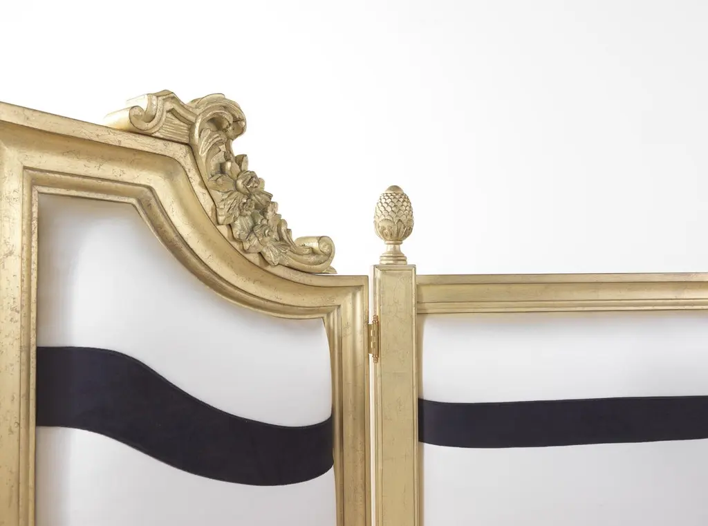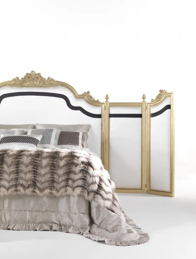 An impactful bed characterized by mobile panels embracing the night tables and the headboard. The refined game of lines created by the contrasting black strip adds movement to the movable panels, embellished by hand-carved wood decorations with antique gold finishing.Orpheus Bed with headboard with lateral swiveling screens in hand-carved beechwood finished in gold J288O. Upholstery in fabric MIL.18.01 with black velvet band. Wooden slat for mattress: 180 x 200 cm.Mattress and bedcover set not included.