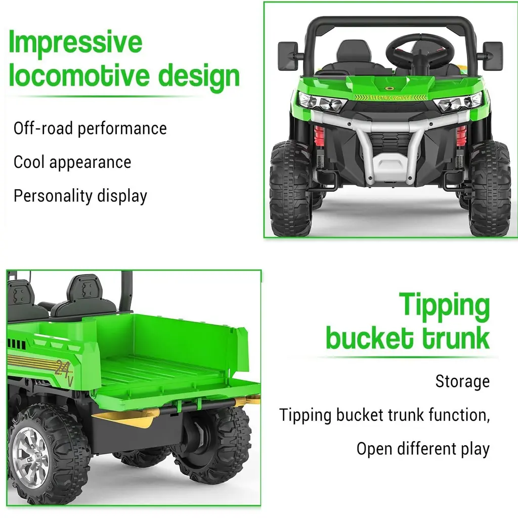 24v Kids Ride On Dump Truck,4wd 2 Seater Ride On Truck With Dump Bed/tailgate/shovel - Green