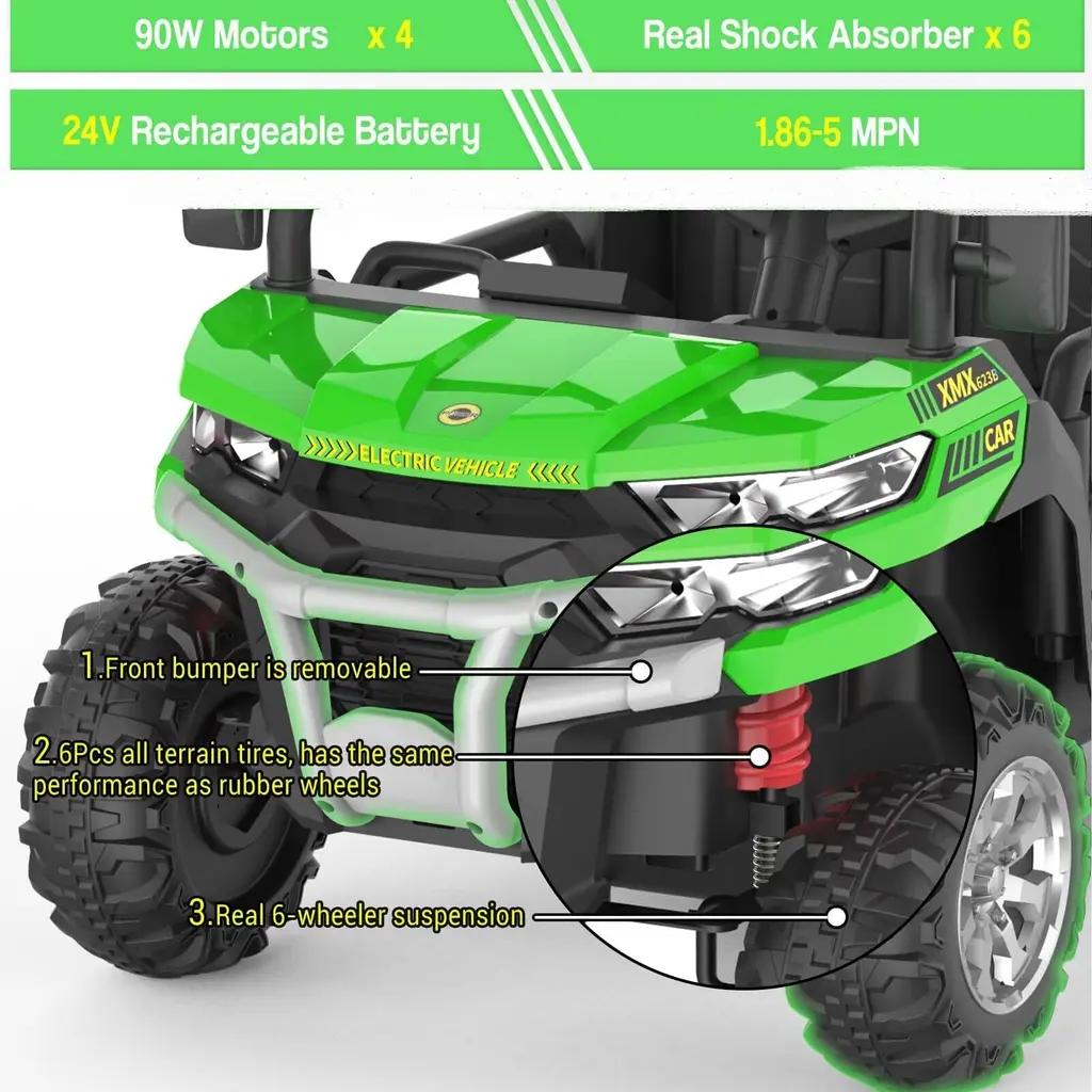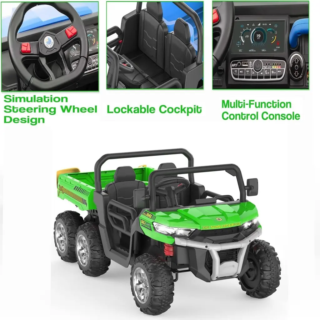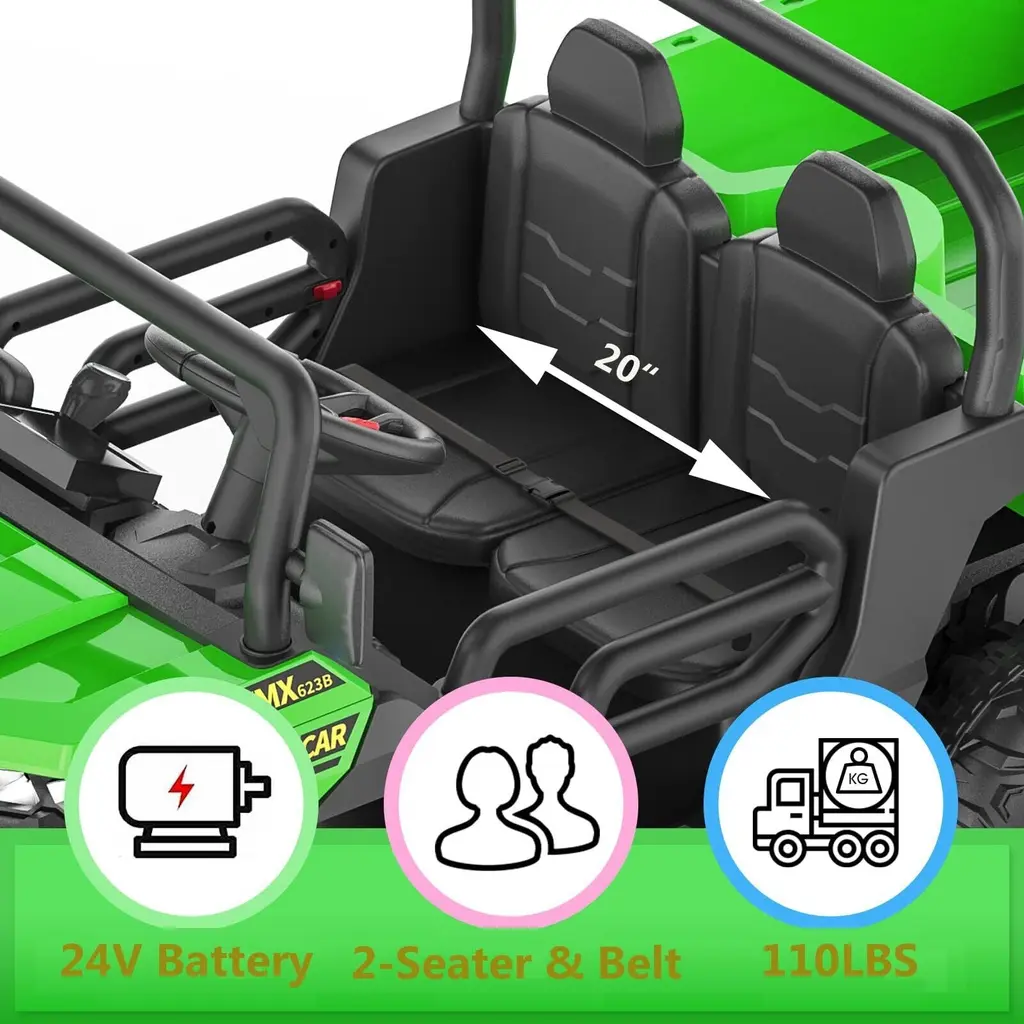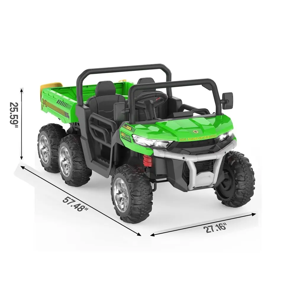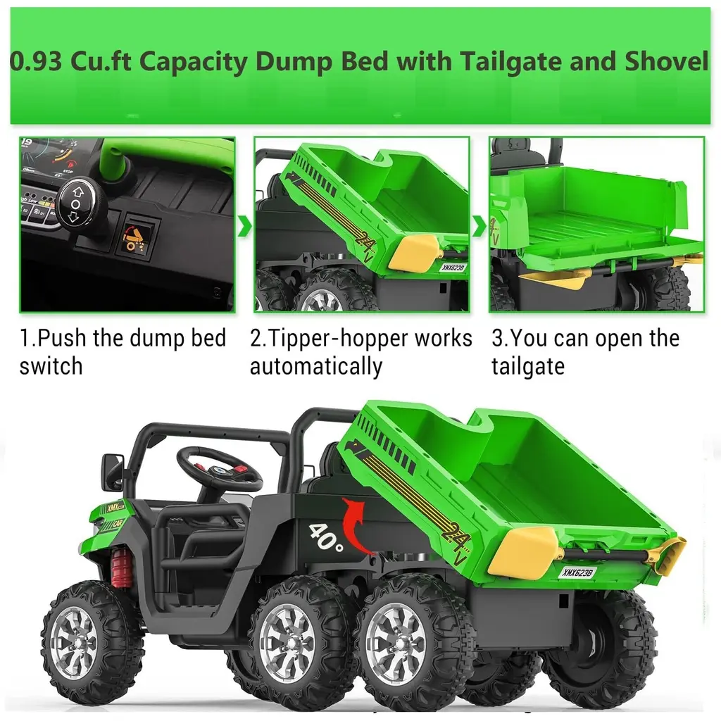 【24V Kids Ride On Dump Truck】The Kids Ride On Dump Truck is equipped with a 24-volt powerful battery, driven by 4 75W motors, and can reach a top speed of 5 mph. Equipped with an electric automatic lifting dump bed, it can be easily controlled by a switch, allowing children to experience real loading and unloading fun! 【2 control methods】The dump truck has two driving modes, equipped with a steering wheel, easy to start with one button, so that children can enjoy the fun of driving by themselves; at the same time, we are also equipped with a remote control, for younger children, parental control is safer, and you can also Increase parent-child interaction 【2 Seats, 4WD, 6 Wheels】This Kids Ride On Dump Truck has a 20-inch ultra-wide 2-seater design for 2 kids to play together, equipped with 6 anti-skid wheels, more stable, with a maximum load capacity of 110 lbs, 4WD , easily ride on various terrains such as grass, brick roads, asphalt roads, etc. 【MORE ENTERTAINMENT FUNCTIONS】This electric dump truck has music, horn, headlights, high/low speed function and phone connection function, which can provide extra fun for your kids, let your kids enjoy their favorite while driving songs, and we have included a toy shovel so kids can enjoy transporting with this dump truck! 【Gift for Kids】The overall size of this electric dump truck is 57.48(L)x27.16(W)x25.59(H) inch, equipped with multiple functions, which can enrich your little one's life and enhance parent-child Relationship, a perfect gift for children on birthdays, Thanksgiving, Christmas, New Year, etc.