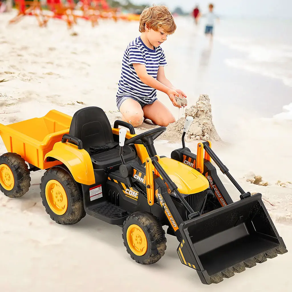 Versatile 2-Seater Design:This 24V ride-on dump truck features a spacious 2-seater configuration, allowing two children to enjoy adventures together. The comfortable seating promotes cooperative play, making it perfect for siblings or friends to experience the thrill of construction-themed fun side-by-side.Remote Control for Parental Guidance:Equipped with a user-friendly remote control, parents can oversee their child’s driving experience, ensuring safety while allowing younger kids to explore. This feature provides peace of mind, enabling parents to in the fun while maintaining control over the vehicle’s movements.Functional Electric Dump Bed and Extra Shovel:Designed for realistic play, this dump truck comes with an electric dump bed that allows kids to easily lift and unload materials. The included extra shovel adds to the interactive play experience, encouraging creativity and imaginative construction projects both indoors and outdoors.Selectable 2WD/4WD Options:This ride-on vehicle offers the flexibility of switching between 2WD and 4WD, allowing kids to tackle various terrains with confidence. Whether cruising on smooth surfaces or navigating rougher paths, this feature enhances the adventurous spirit of outdoor exploration.Exciting Features with Music Player and Speed Control:With a maximum speed of up to 4.35 mph, this ride-on truck provides a thrilling yet safe driving experience for kids. The built-in music player adds an entertaining element, allowing children to enjoy their favorite tunes while driving, making every adventure more enjoyable and engaging. Perfect for kids ready to dig into action!