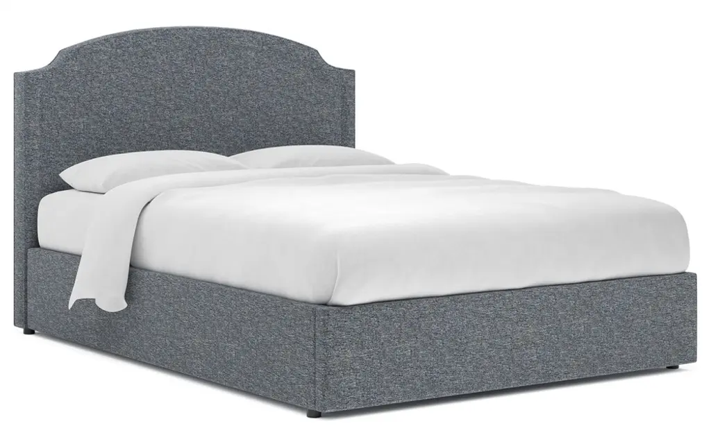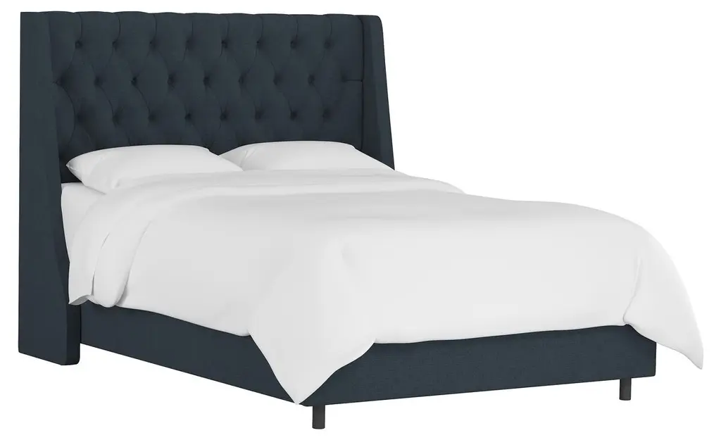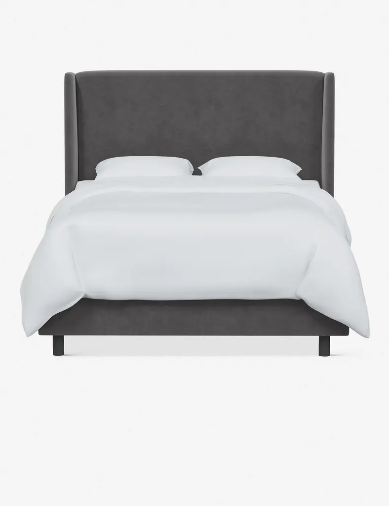 A stately bed frame made to fit a serene space. Its subtle winged headboard and trim lines offer crisp sophistication. Bring a bespoke touch to your bedroom with this upholstered bed that suits and elevates a tailored environment.