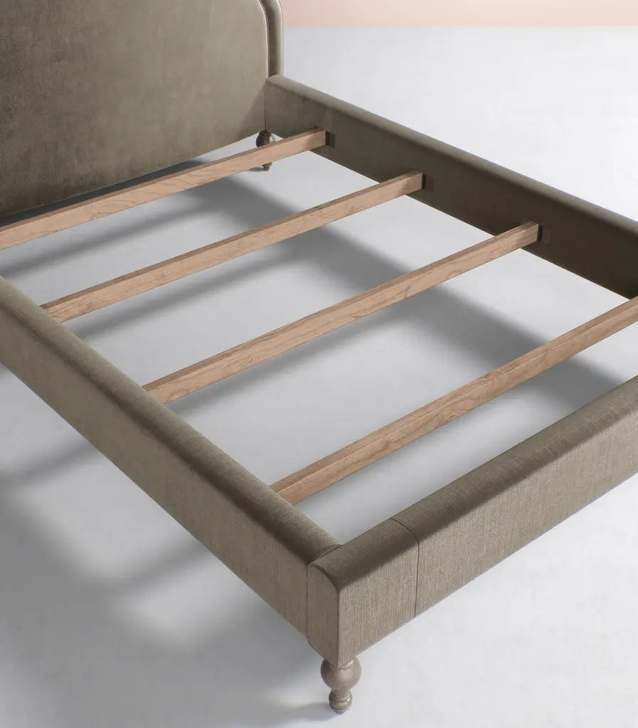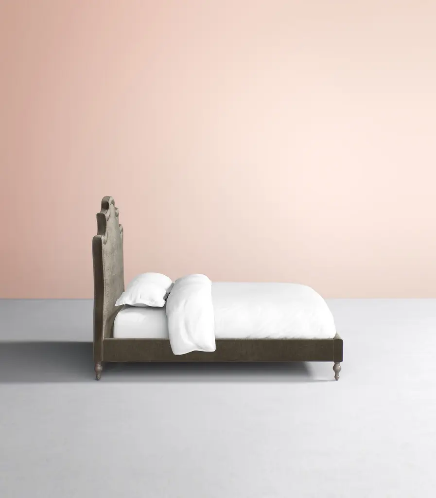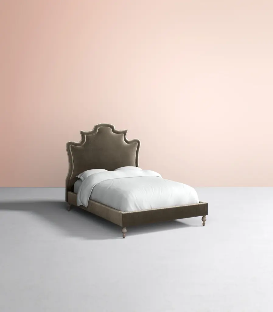 A dramatic, exquisitely upholstered frame features a tall, sculptural headboard that turns this handcrafted piece into a delight for the eyes.