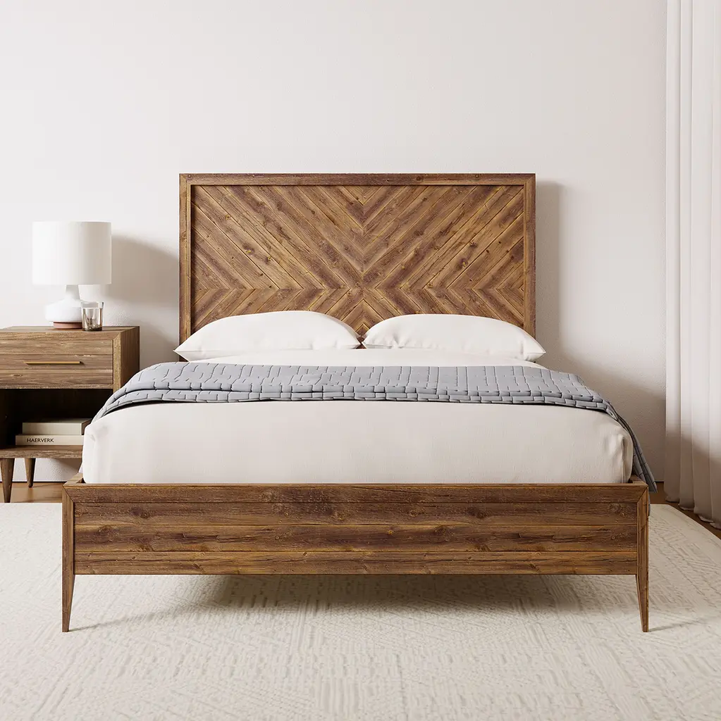 Unique chevron pattern brings natural sophistication to your space. Its sky-high headboard makes a statement. Made from sustainably sourced wood. Contract Grade, so you know it's built to last.