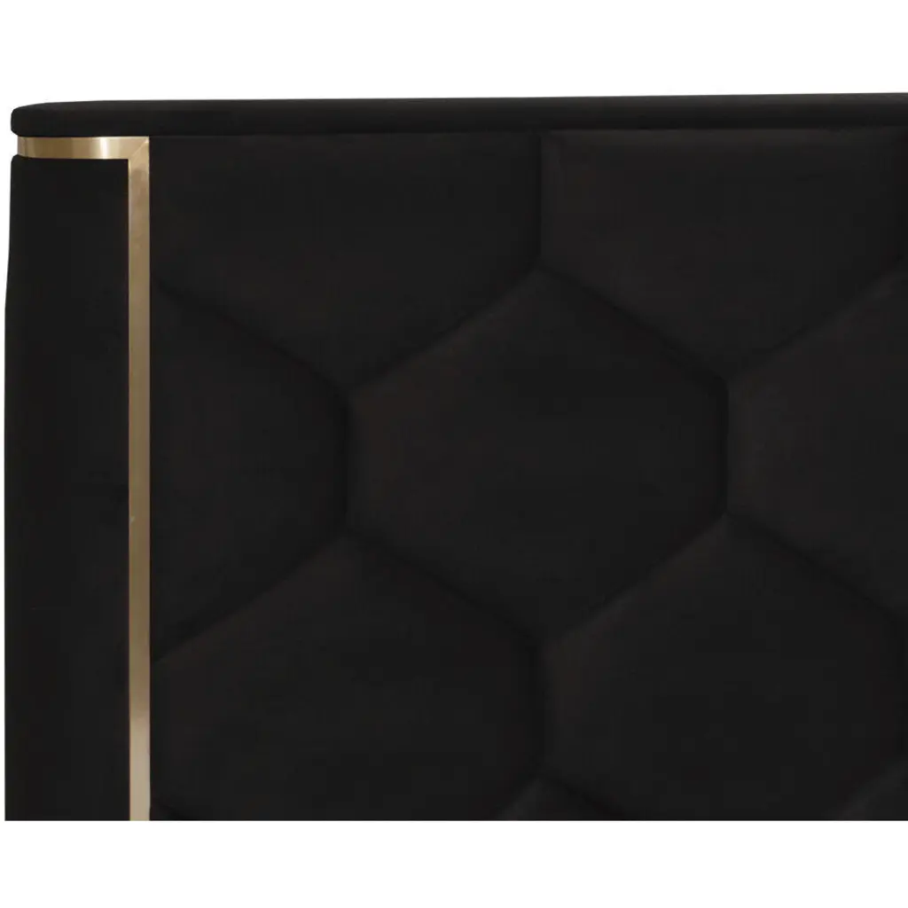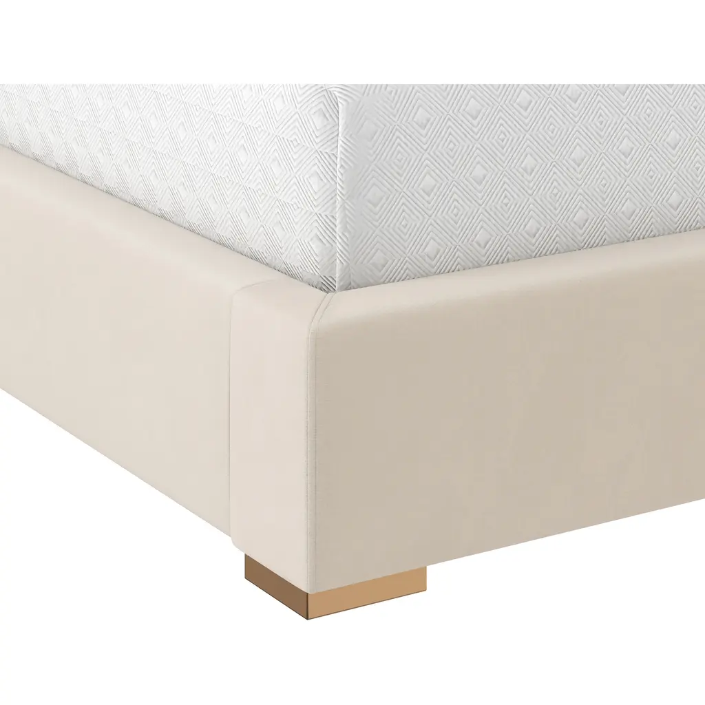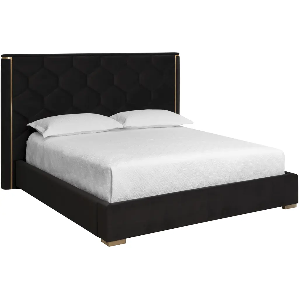With a classic design that boasts opulence and supreme comfort, this luxurious bed will transform any bedroom space into a dreamy oasis. Upholstered in meg taupe fabric and features hexagonal tufting on the headboard. Completed with gold stainless steel accents. No box spring is required and slats are included. Due to the reflective nature of metal, some images on our website may not capture the artisanal characteristics of a product accurately.