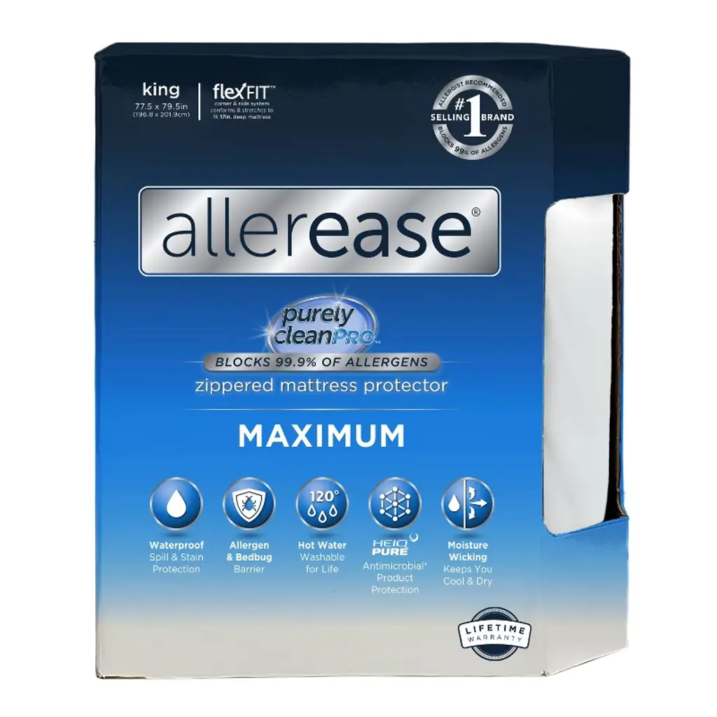 From the #1 selling allergy bedding brand, the AllerEase Platinum Zip-Off Mattress Protector combines premium comfort, protection, and convenience to create the most comprehensive allergy solution on the market. Platinum completely covers your mattress to block bedbugs and 99.9% of allergens—like dust mites, pollen, pet dander, and other household allergens that can trigger an allergic response. The luxurious, plush top fabric features temperature-balancing technology that continuously adjusts to your body temperature, keeping you comfortable throughout the night. Platinum’s waterproof layer protects your mattress against damage and contamination from liquids, spills, and stains. Installing Platinum is easy: it features a fully removable top that zips on and off for easy laundering, and a base with anchor bands and FlexFit™ corner elastic that ensures the protector’s snug fit on a variety of mattress depths—twin and full up to 14” and queen, king, and California king up to 17”. Platinum is perfect for those who want total allergy protection, ease of use and cleaning, and premium comfort. All AllerEase products come with our Lifetime Warranty, for peace of mind that you’ve made a clean, healthy choice for you and your family!