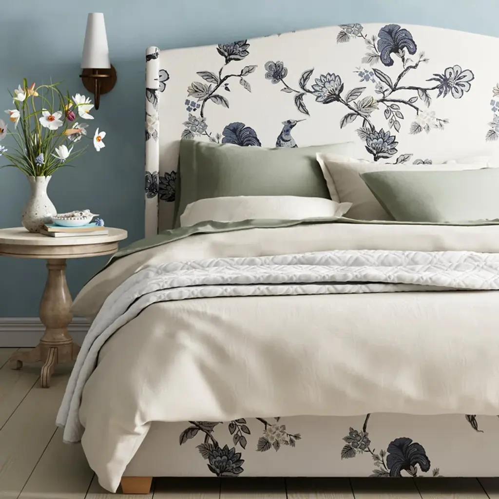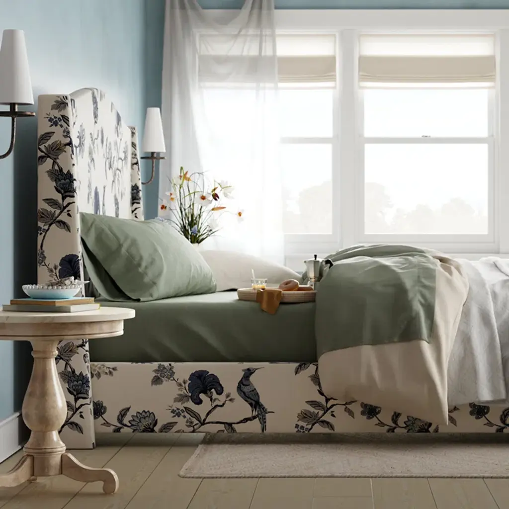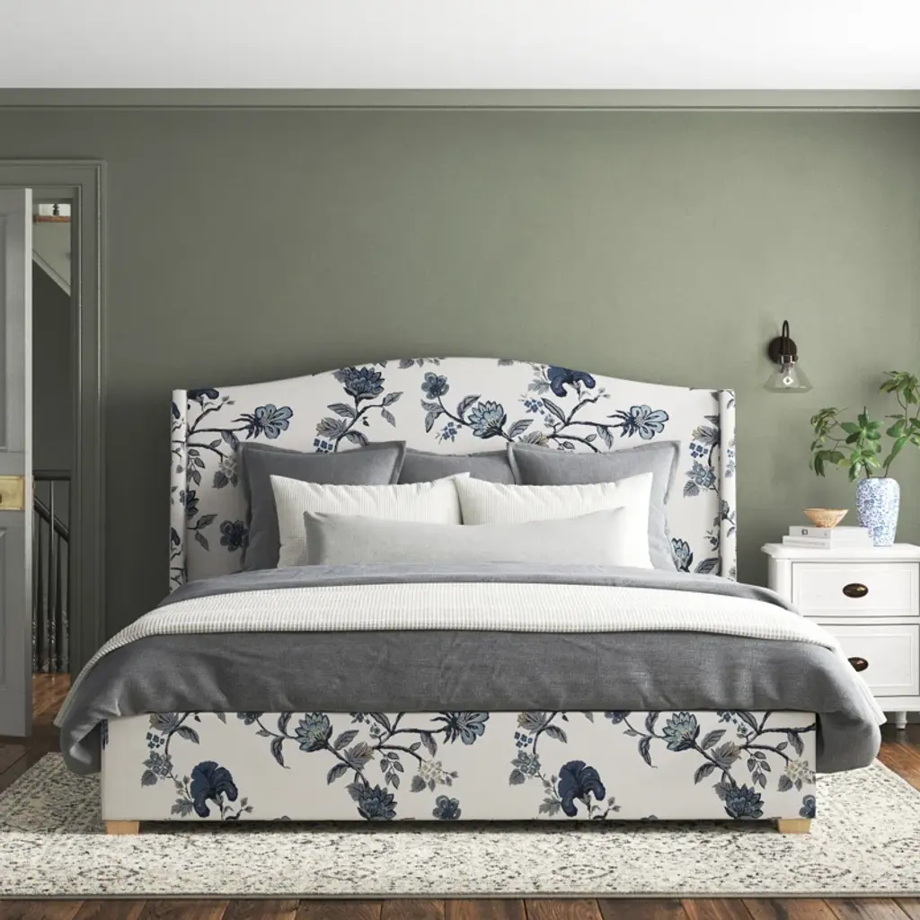 This upholstered bed has a solid wood frame and an arched headboard with a wingback silhouette that invites propping up against with a good book. Wrapped in a variety of print and color options, it is made to order in Illinois in your choice of size and fabric, to fit your specific needs. Center legs and a system of slats support your box spring and mattress of choice (both sold separately).