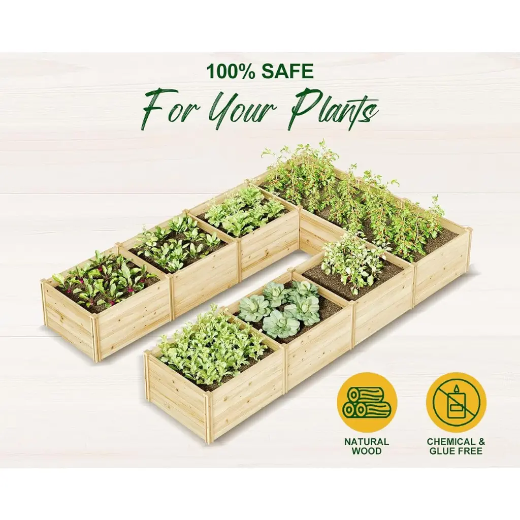 The Daisy U-Shaped Raised Bed is built from high-quality natural fir wood, ensuring long-lasting durability and stability. Its open base design promotes proper drainage and healthy root growth for your plants. With a spacious planting area divided by a transom for stability, this bed helps keep soil nutrients intact. The four corner legs allow you to rearrange and combine sections to fit your garden space, patio, or balcony perfectly. Easy to assemble in just 30 minutes, this garden bed features a simple slot-and-tab construction for quick setup.