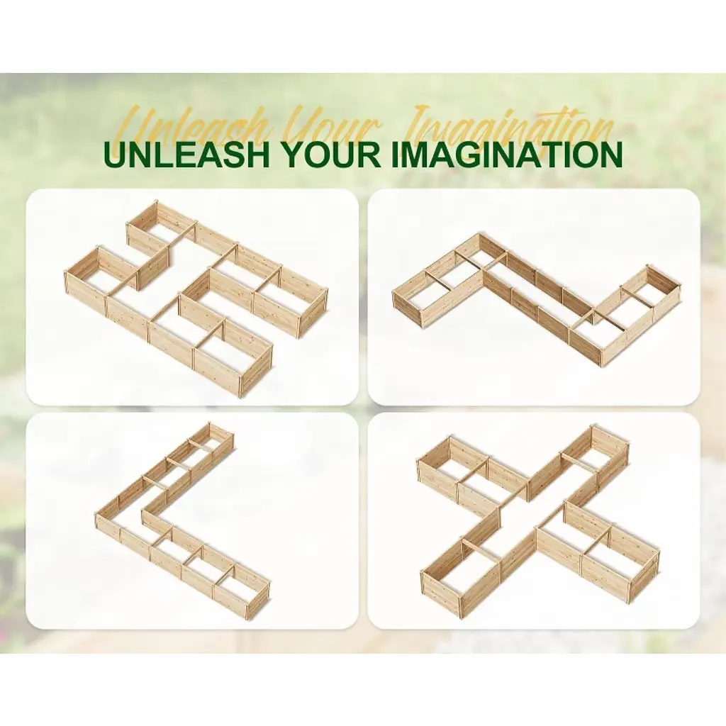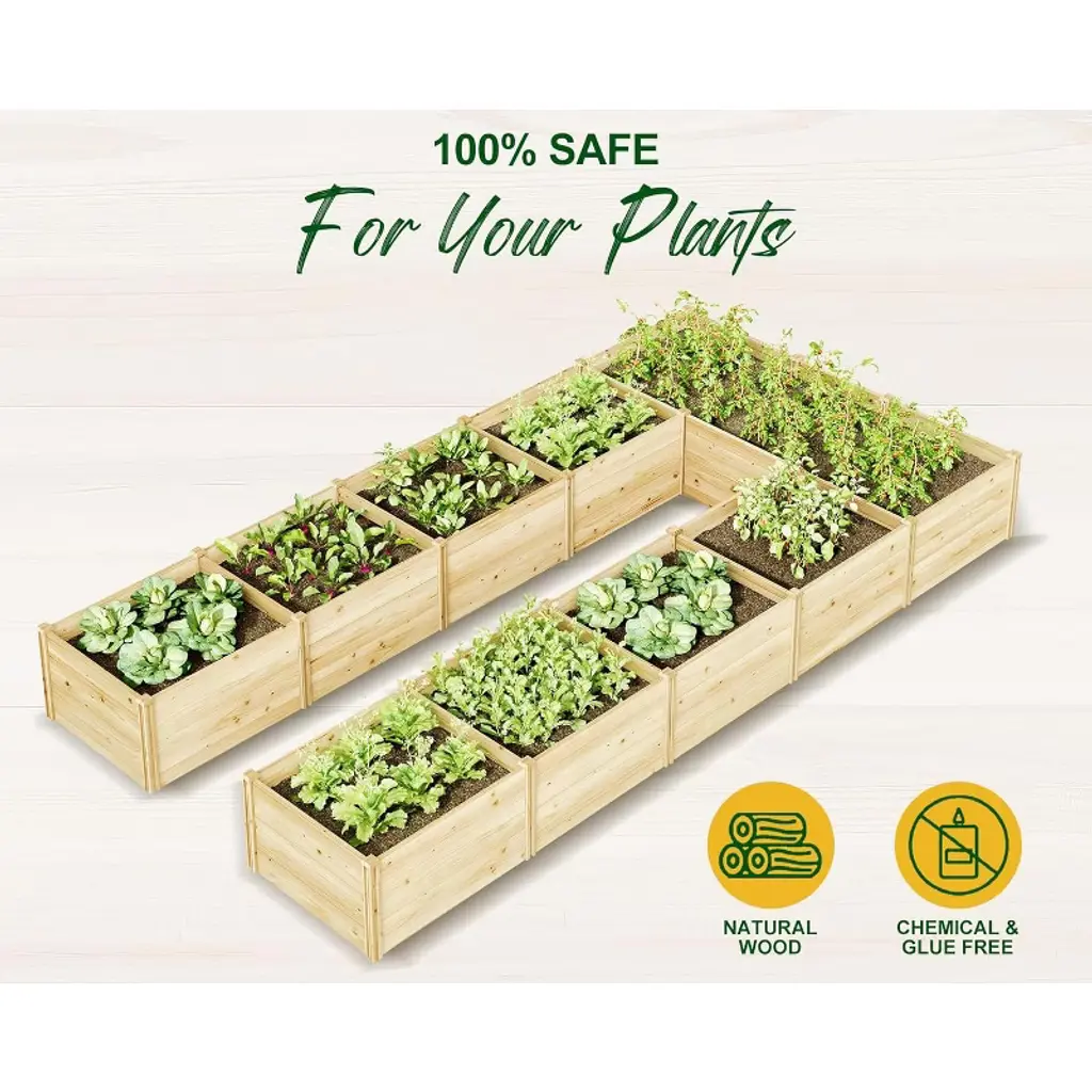 The Daisy U-Shaped Raised Bed is built from high-quality natural fir wood, ensuring long-lasting durability and stability. Its open base design promotes proper drainage and healthy root growth for your plants. With a spacious planting area divided by a transom for stability, this bed helps keep soil nutrients intact. The four corner legs allow you to rearrange and combine sections to fit your garden space, patio, or balcony perfectly. Easy to assemble in just 30 minutes, this garden bed features a simple slot-and-tab construction for quick setup.