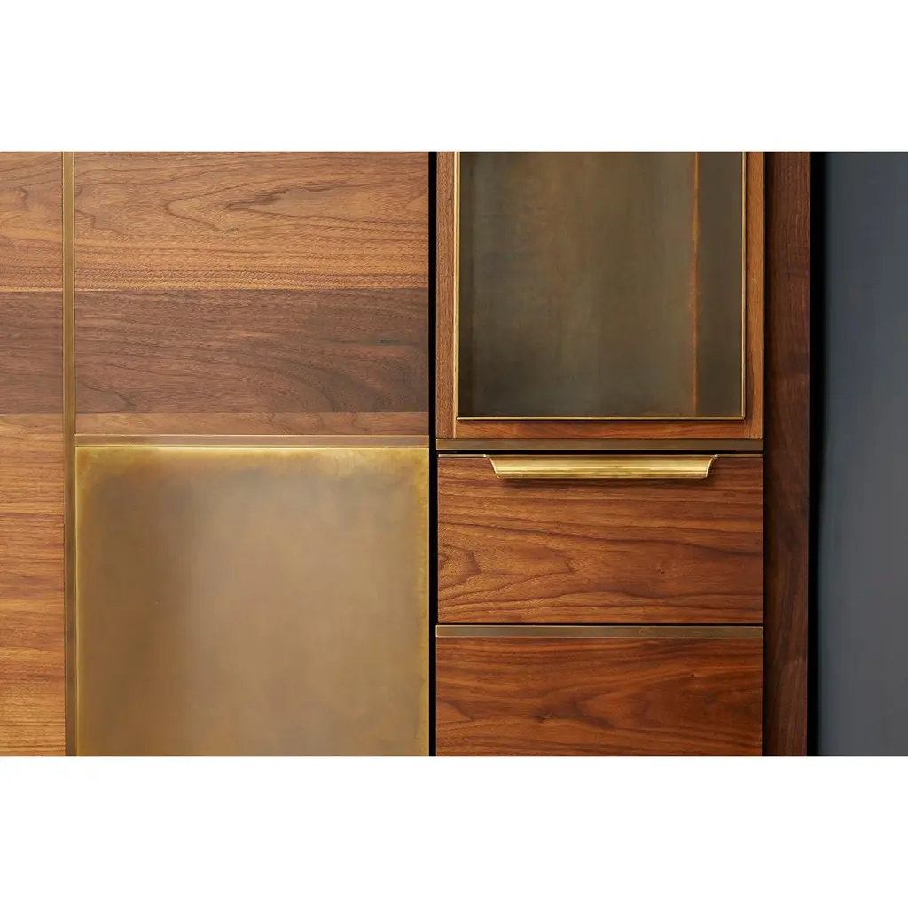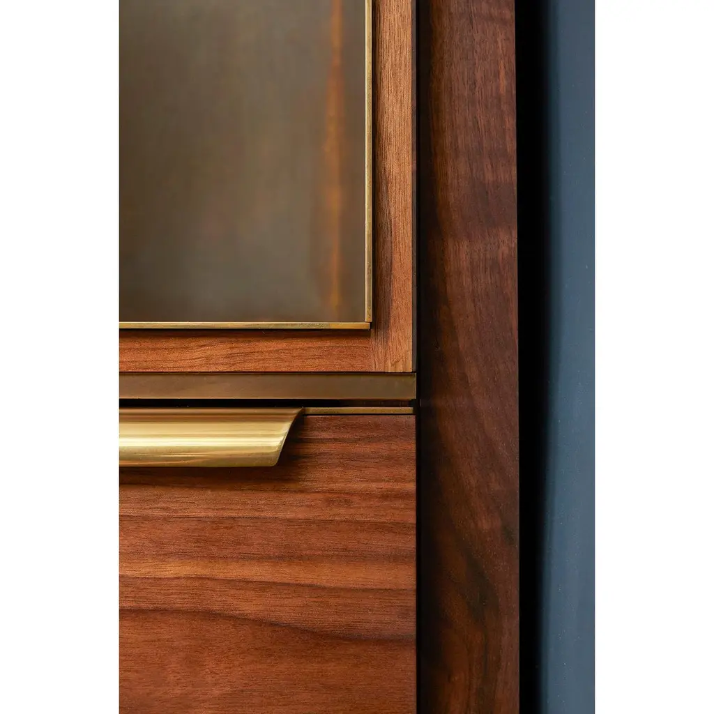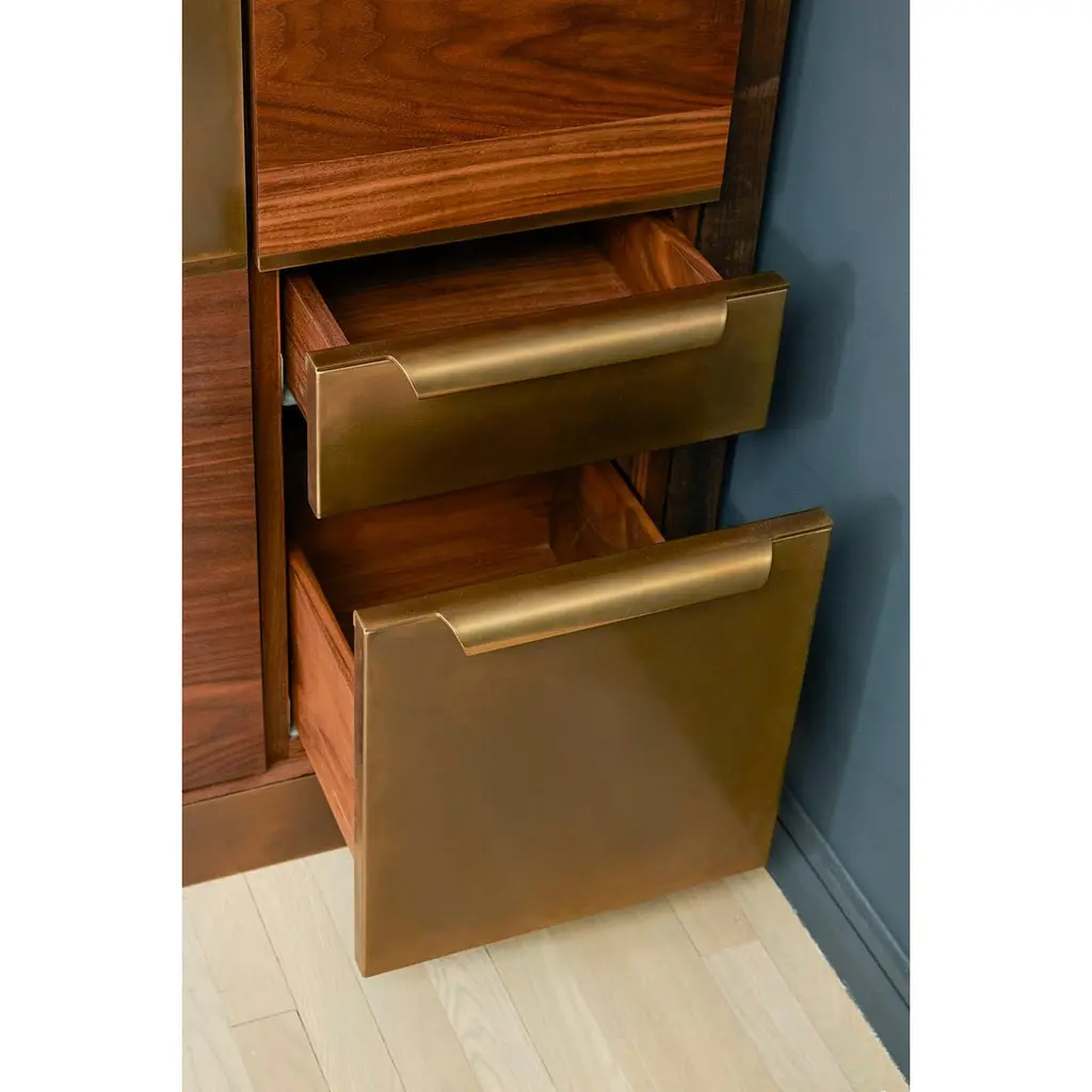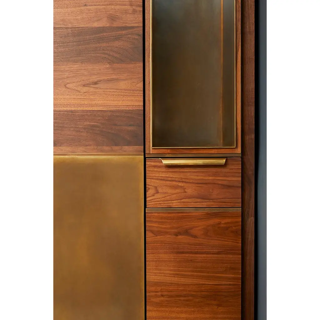 Amuneal’s Murphy Bed in Silvered Walnut and Oxidized Bronze is designed to feel like a built-in piece of millwork, concealing a queen-sized mattress behind panels of silvered walnut with oxidized bronze inlays. With the bed closed, the walnut and brass panels work with brass clad cubbies and integral lighting to create special illuminated display niches for your favorite items. A series of brass and walnut clad drawers and cubbies provide additional visual interest and storage space that can be used for bedding or to help make your guests feel more at home. When the bed is open a full-sized, hand-lacquered headboard and walnut clad nightstand cubbies reveal a welcoming space for your guests. Amuneal’s Murphy beds are produced in our Philadelphia-based furniture studio and are available in a range of finishes and sizes to accommodate different spaces and different mattress sizes.