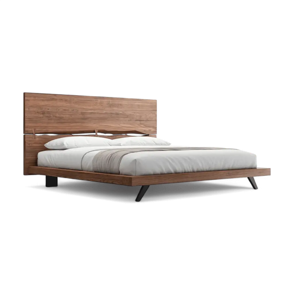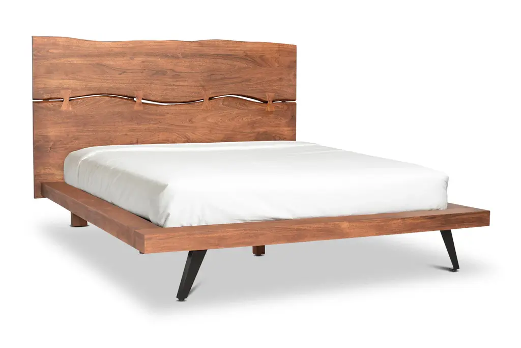 Our Anaho Bed is the perfect combination of classic Japanese structural design and modern influence. The headboard is formed from two slats of live wood. The two headboard slats are supported by three unique hourglass shaped pieces to add flair while aiding in the sound structure. The flat sideboard is long enough to rest your feet on, and four black metal legs keeps the bed suspended in air. If you’re looking to sleep peacefully while adding modern refinement to your space, then the Anaho Bed is for you. Many of our pieces are hand-crafted from natural materials. The beauty is in the natural variations, and will make your piece timeless, authentic, and unique. Many of our pieces are hand-crafted from natural materials. The beauty is in the natural variations, and will make your piece timeless, authentic, and unique.