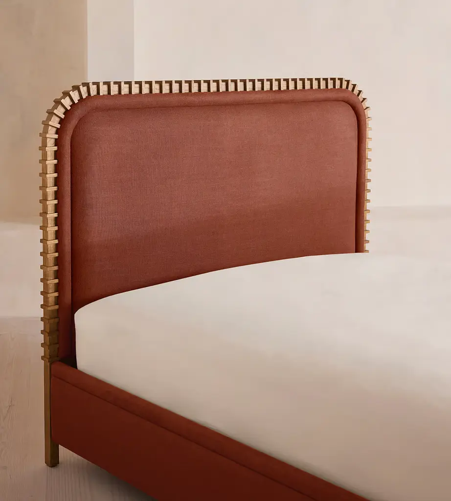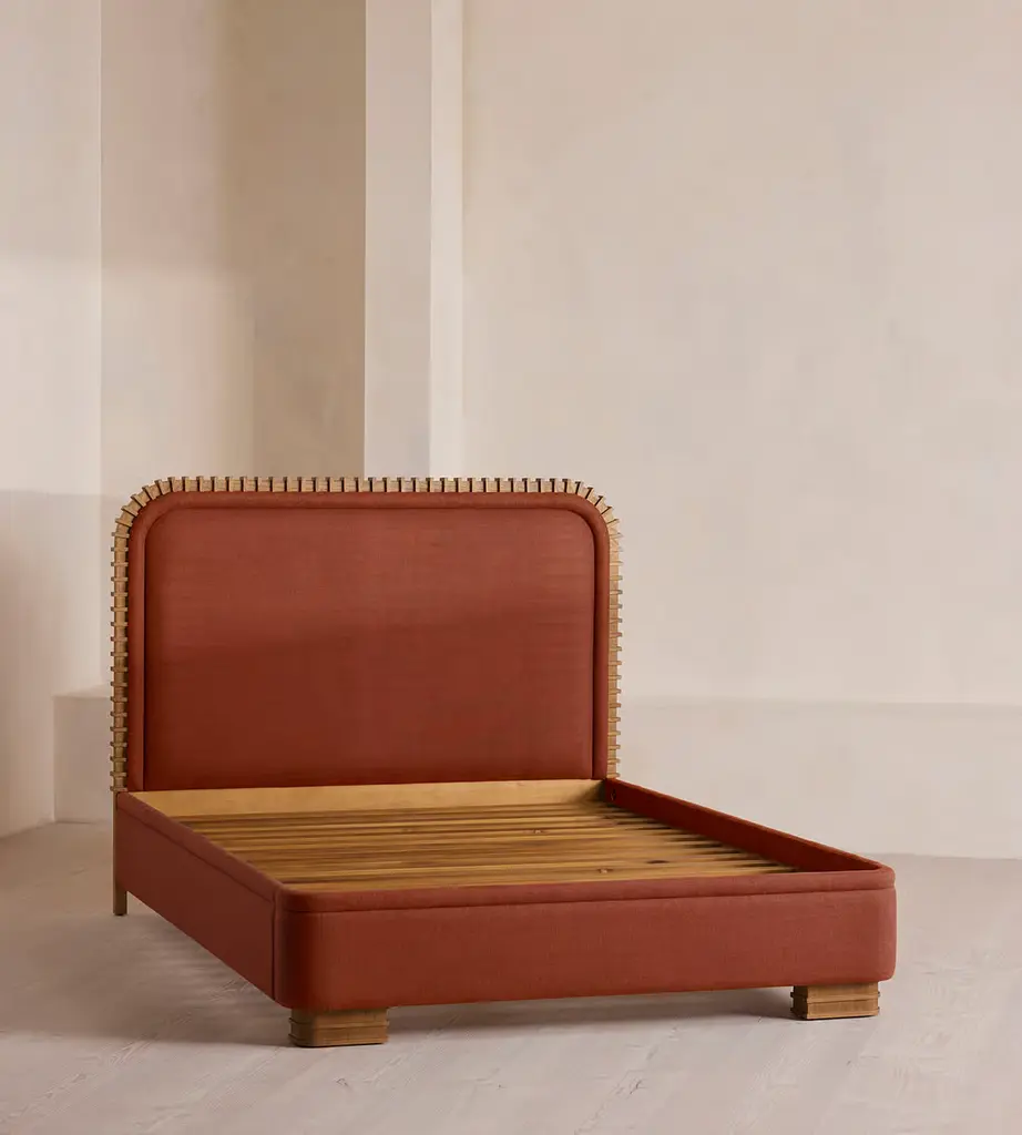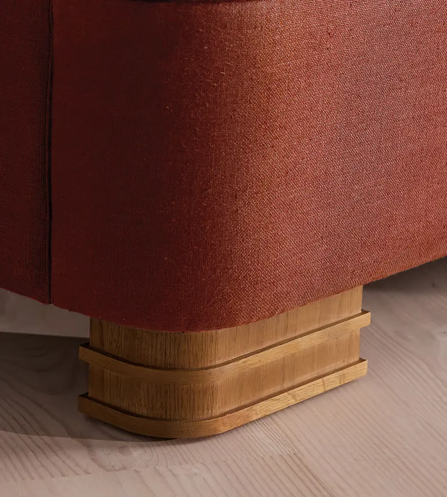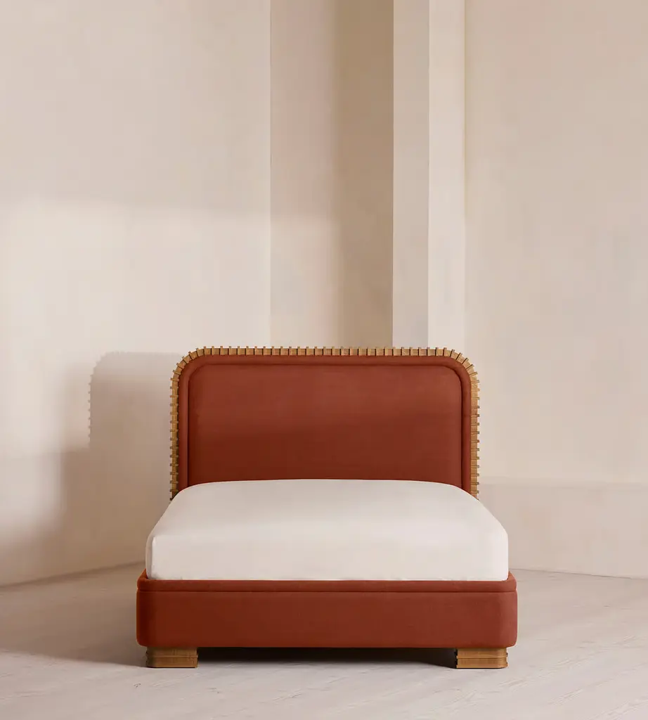 Made from solid oak, an oversized, curved headboard is characterised by intricate carved detailing. Inspired by the calming bedrooms of Soho House Rome, the Angus bed is fully upholstered in soft velvet in a variety of bespoke colour options. Made from solid oak, its frame is characterised by an oversized, intricately carved headboard that creates a statement design piece for your room.
