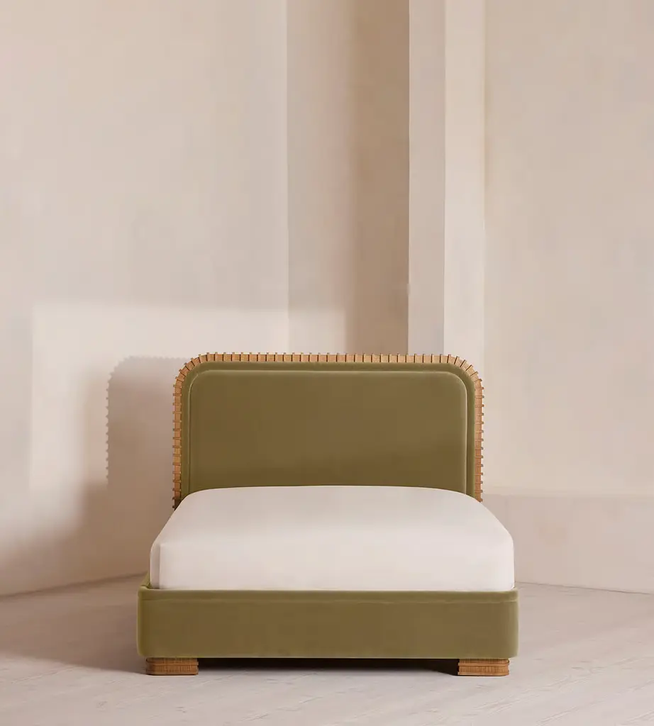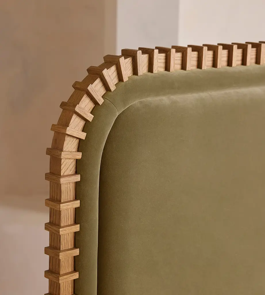 Made from solid oak, an oversized, curved headboard is characterised by intricate carved detailing. Inspired by the calming bedrooms of Soho House Rome, the Angus bed is fully upholstered in soft velvet in a variety of bespoke colour options. Made from solid oak, its frame is characterised by an oversized, intricately carved headboard that creates a statement design piece for your room.