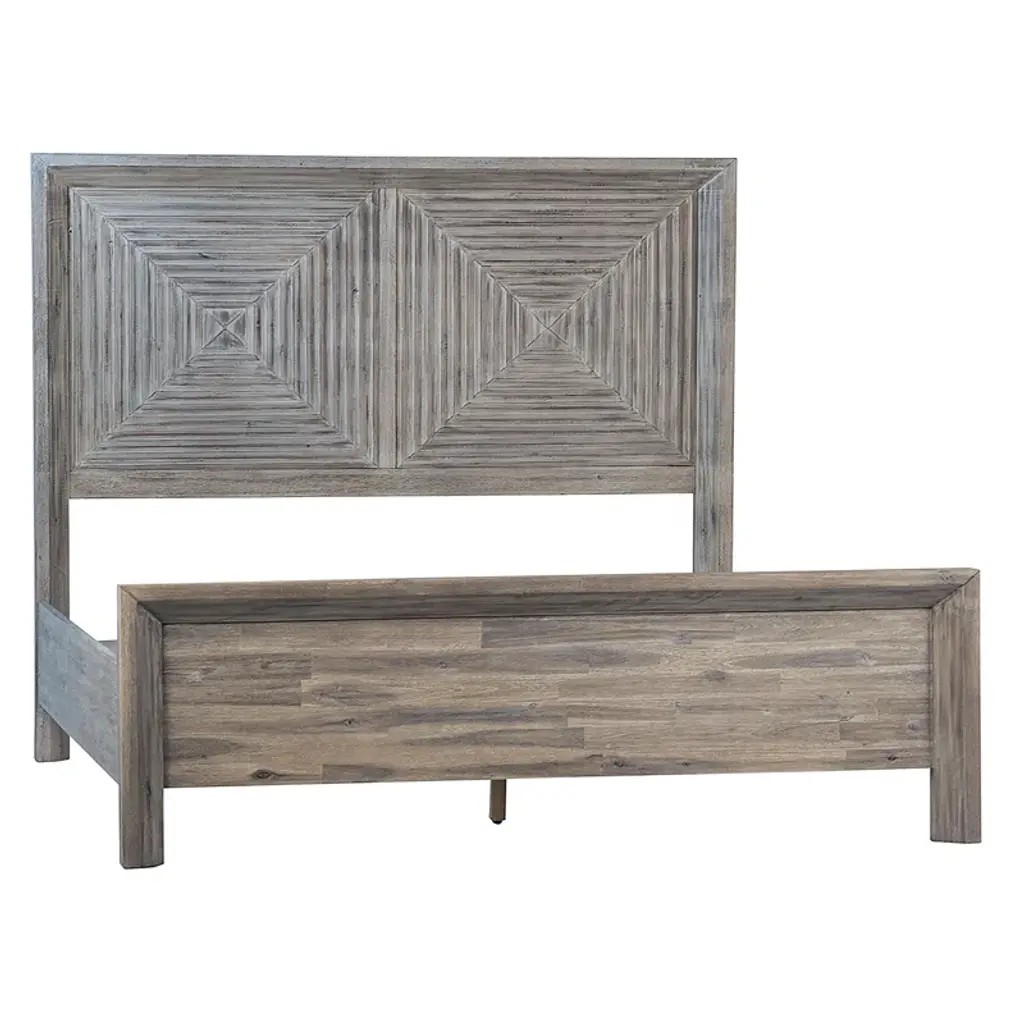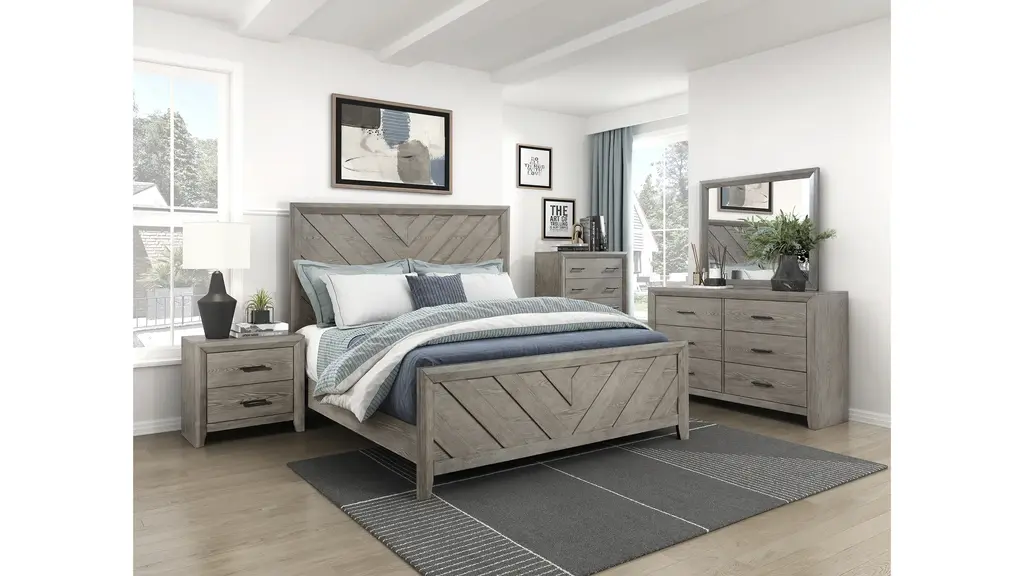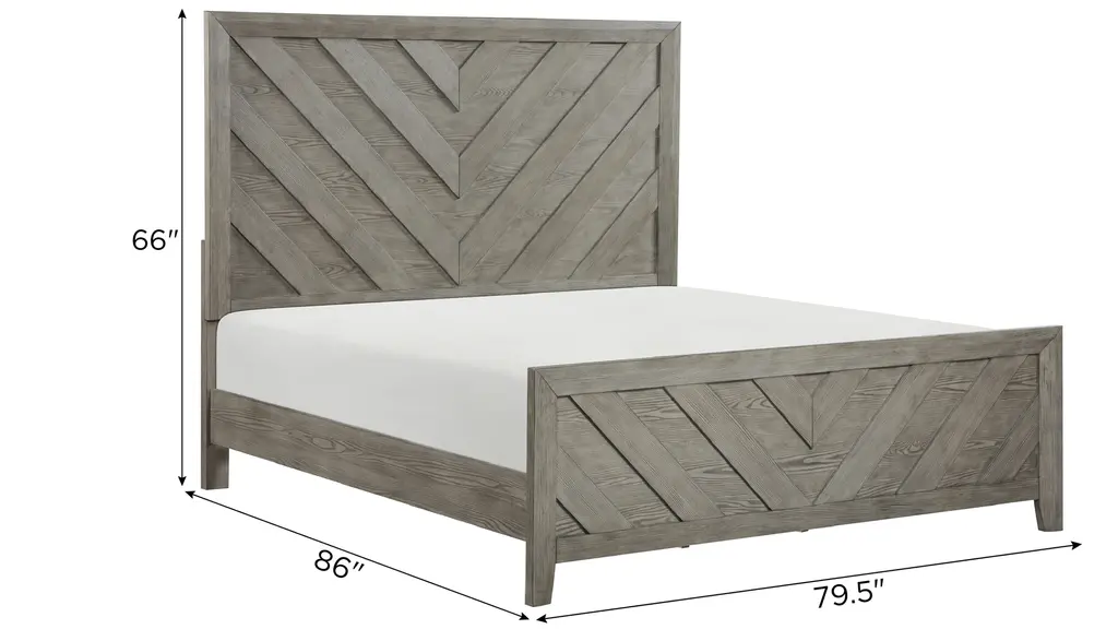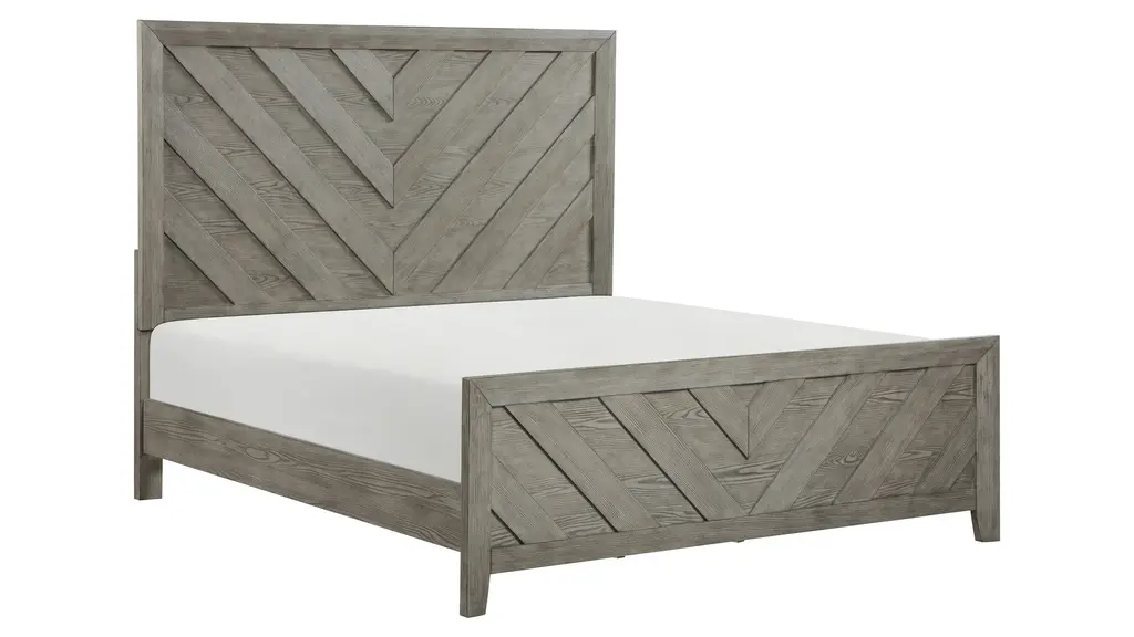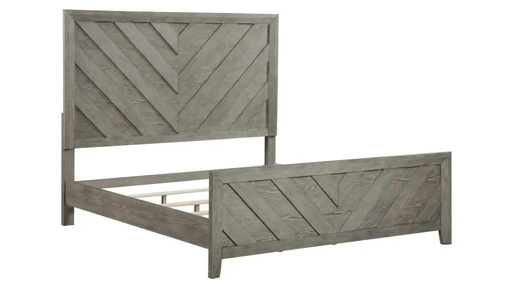 Bring a modern, rustic touch to your bedroom with this Anson Bed. Crafted from durable acacia wood and selected hardwoods, the bed features a striking chevron design on the headboard and footboard, adding texture and character to your space. The sleek finish enhances the natural wood grain while the matte black drawer pulls on the coordinating pieces adds an elegant touch to any d_cor.