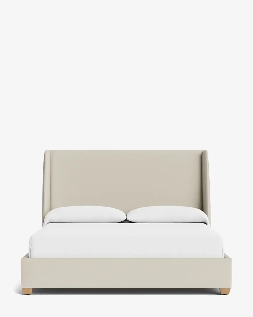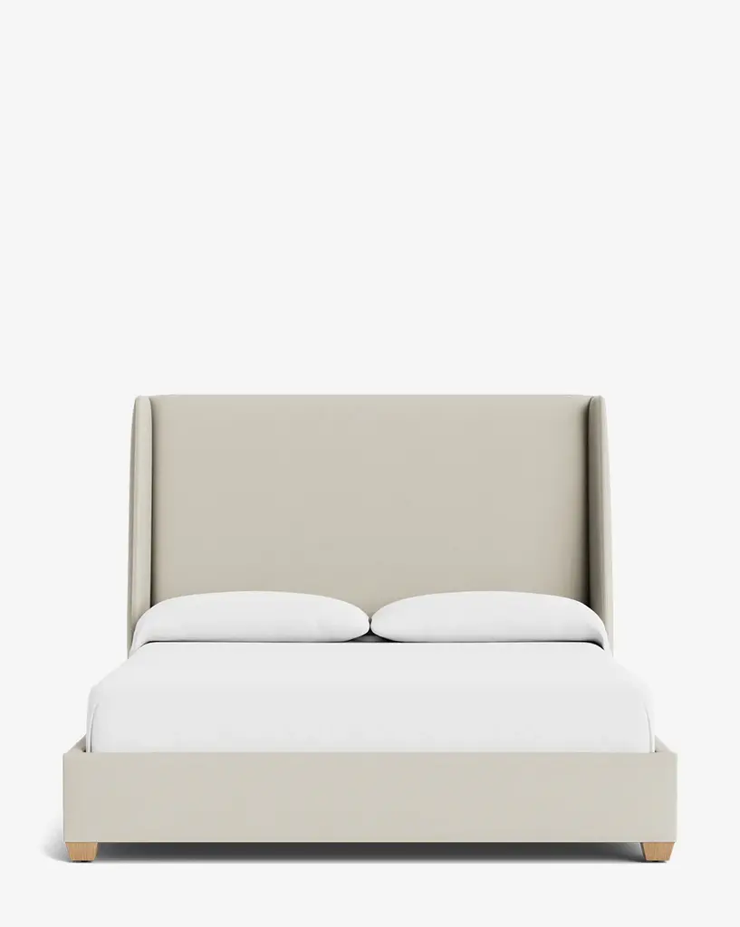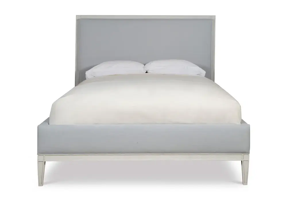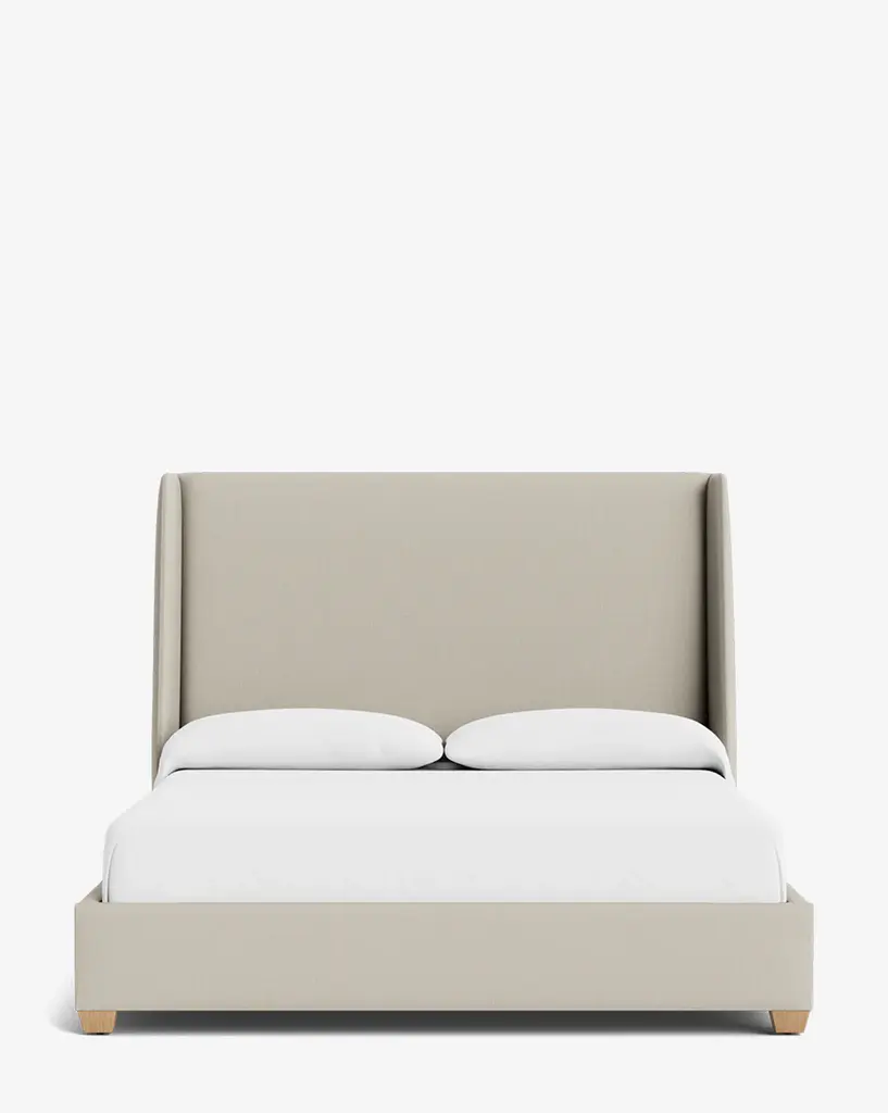 A storied collective of material and form, this classic bed introduces a calming neutral palette that is warm and inviting. Framed in koto veneers with a subtle chevron pattern inspired by early Greek motifs, its parsons-style headboard is dressed in a wool-like flannel that is soft yet durable and capped on all three sides in glinting metal. Seemingly floating on a plinth base, its sophisticated silhouette brings effortless elegance to bedroom interiors and guest suites.