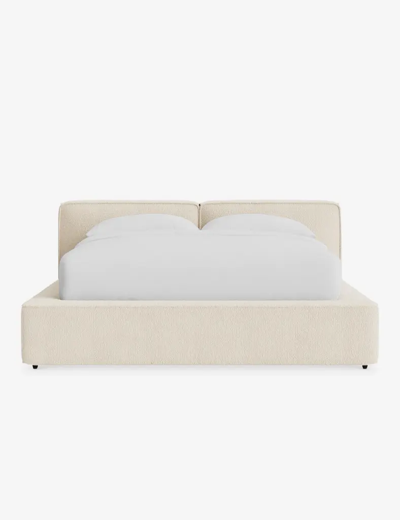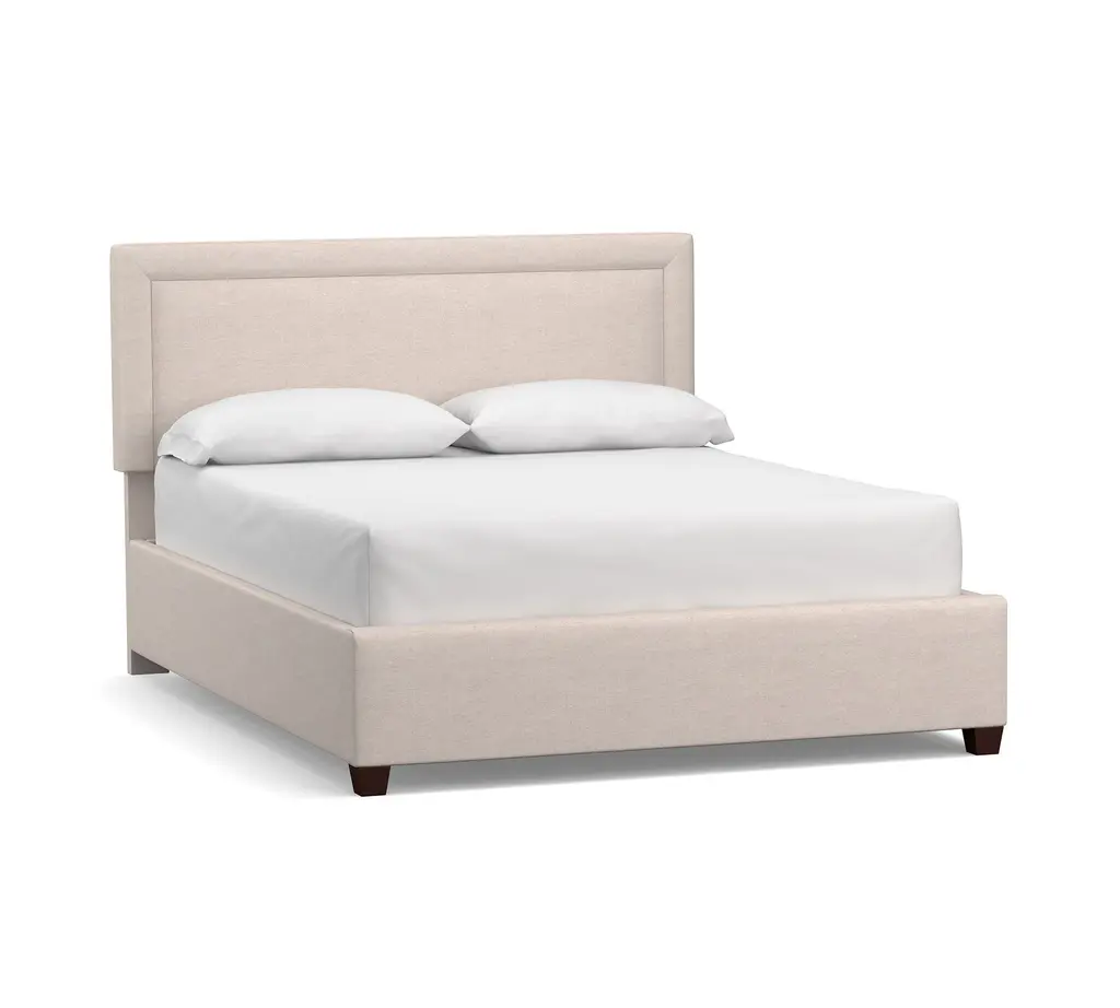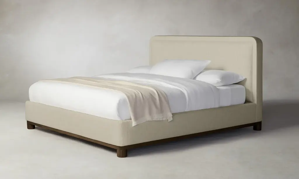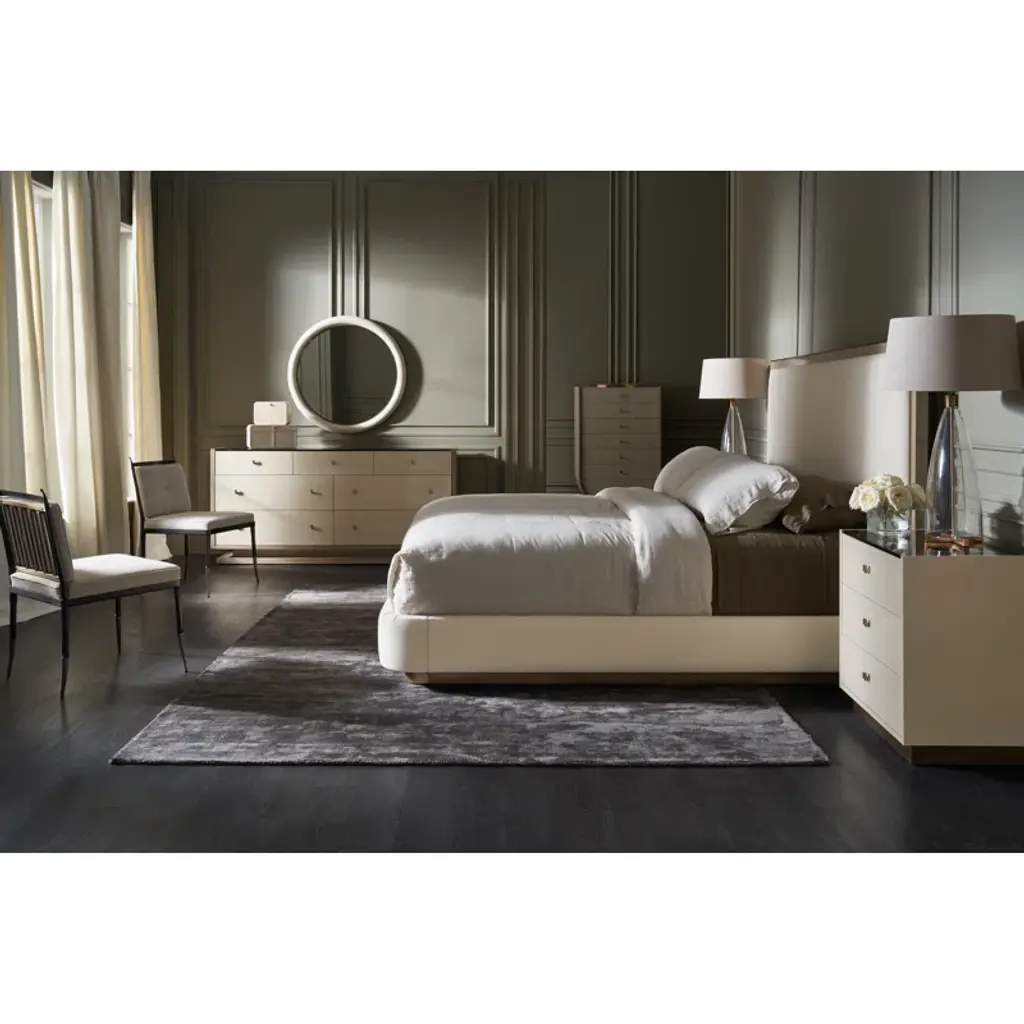 A storied collective of material and form, this classic bed introduces a calming neutral palette that is warm and inviting. Framed in koto veneers with a subtle chevron pattern inspired by early Greek motifs, its parsons-style headboard is dressed in a wool-like flannel that is soft yet durable and capped on all three sides in glinting metal. Seemingly floating on a plinth base, its sophisticated silhouette brings effortless elegance to bedroom interiors and guest suites.