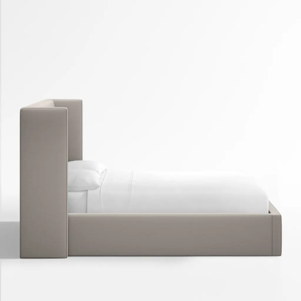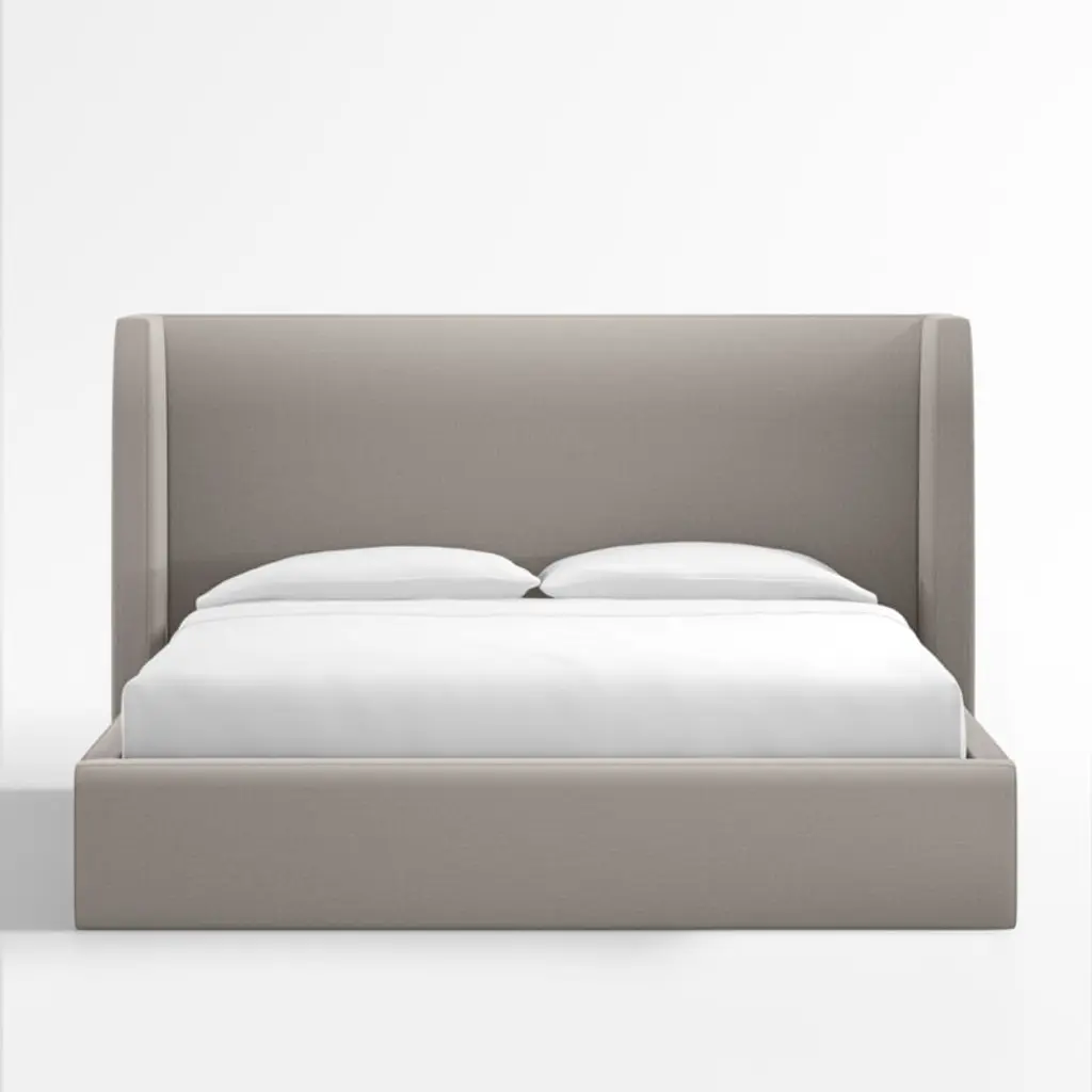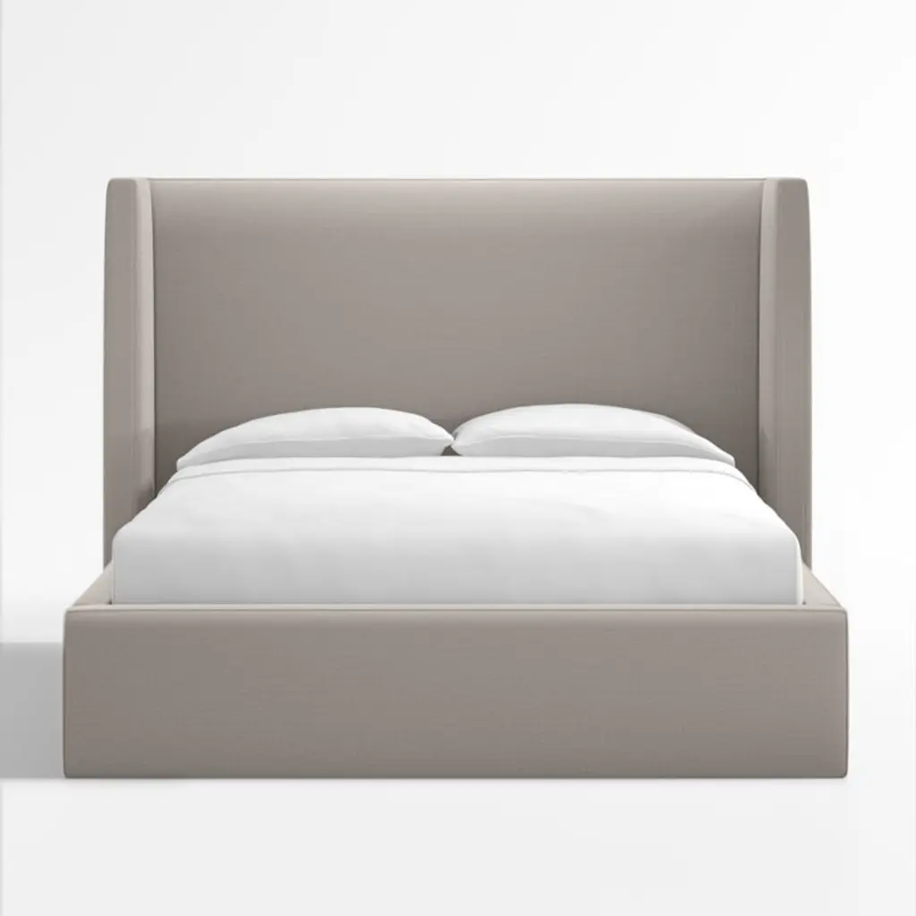 Our Arden bed shelters you within its luxe, fully upholstered contours. The tall headboard squares the traditional wingback silhouette with right angles, accentuating the bed's eye-catching proportions and clean lines. Topstitching lends a tailored look to the poly-linen fabric in graphite grey. The Arden upholstered bed is a Crate & Barrel exclusive.