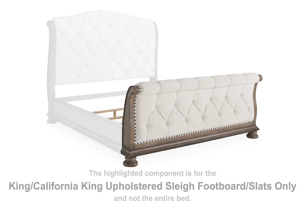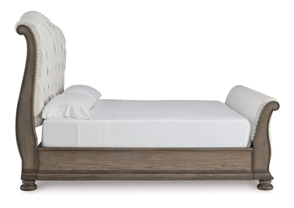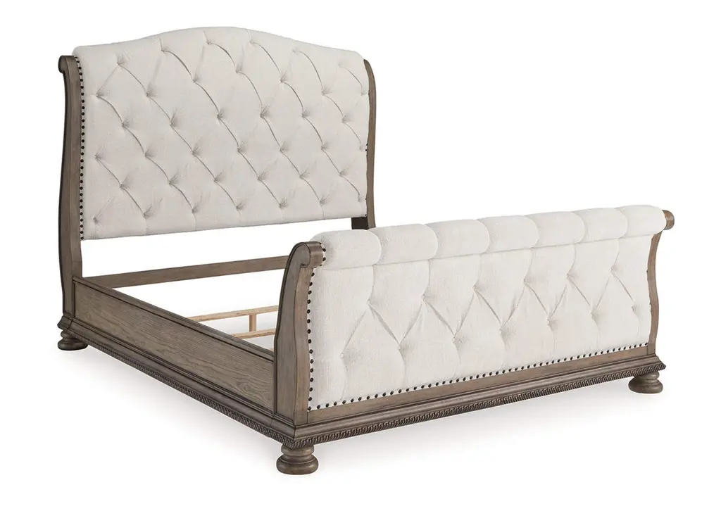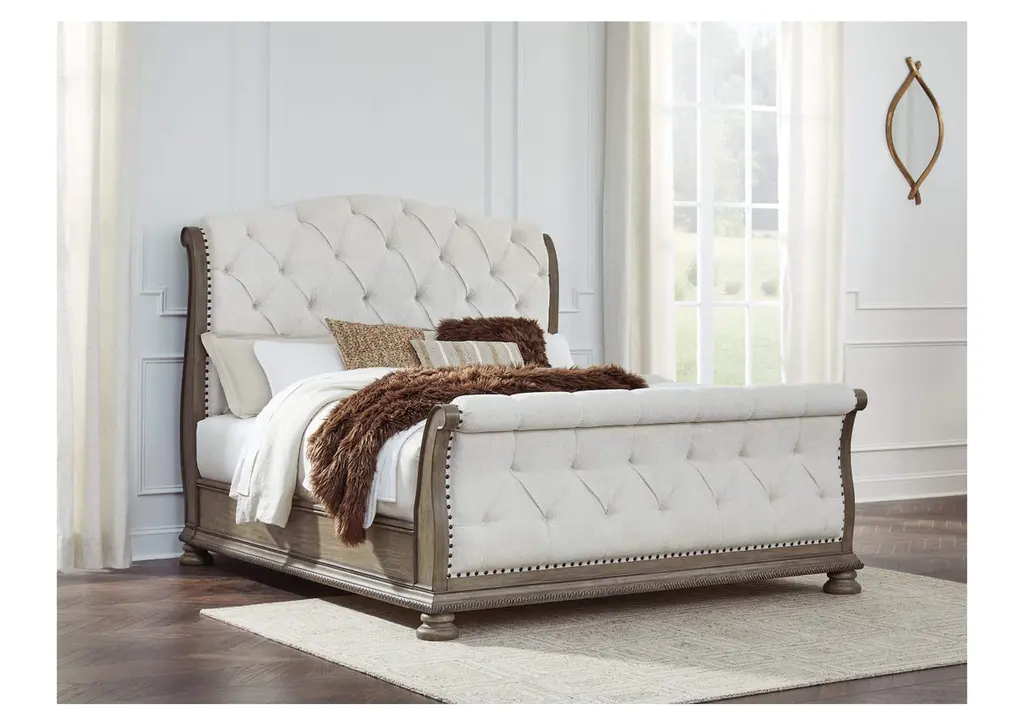Merging traditional elegance with modern comfort, the Ardenfield California king upholstered sleigh bed takes your bedroom retreat to the next level. It radiates timeless sophistication with its shapely curves, glazed antiqued-look finish and tufted cushions. Talk about stunning refinement. Weight 340.750 lbs. (153.34kgs.)