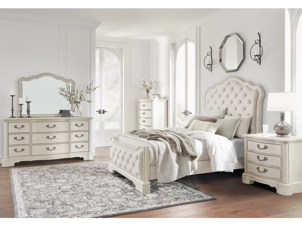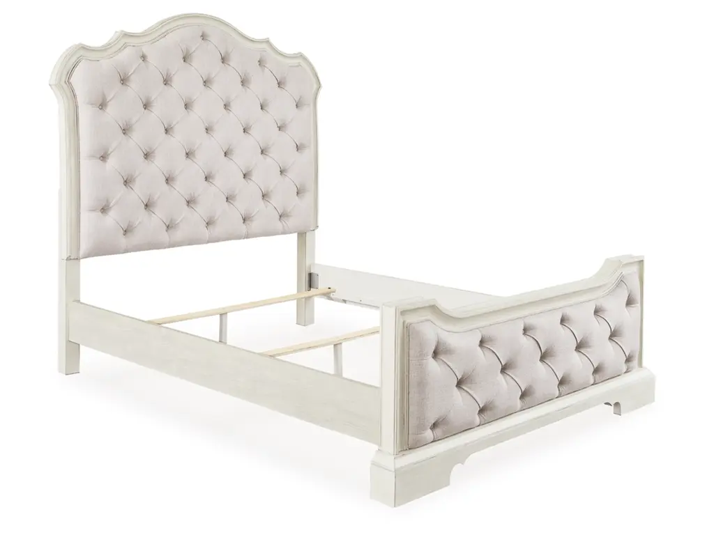 Add a touch of romance to your home with the Arlendyne queen upholstered bed. The antiqued white painted finish and serpentine-shaped silhouette details are the picture of easy elegance. Indulge your love of luxury with decadent button-tufted cushioning from head to toe.