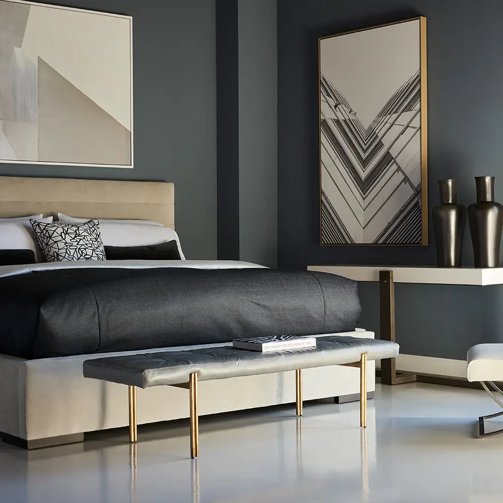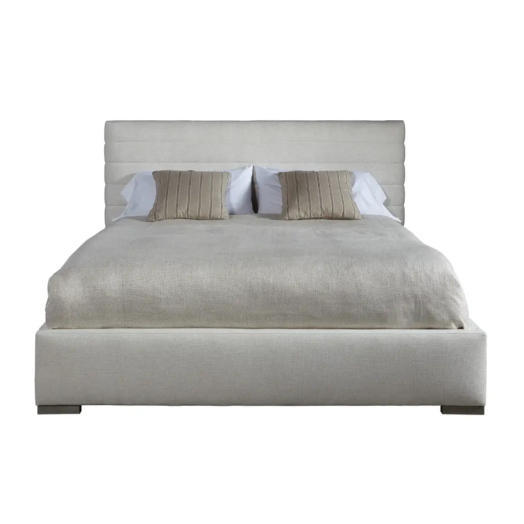 Calm and welcoming, the fully upholstered Arno Bed features a horizontally channeled headboard and exposed blocky wooden legs. The perfect retreat for any transitional space. Includes a bunkie board base. Ships In 8-10 Weeks Bunkie board base included 16.5" footboard and rail Chaneled fabric headboard Fully upholstered As Shown Fabric: Dolce Ivory As Shown Finish: Mineral If you choose to purchase COM, once you have placed your order a customer service rep will contact you regarding where to send your fabric. Please note that current lead time is 17-19 weeks once your fabric arrives at the factory, and if unused fabric is under 1.5 yards, it cannot be sent back to you.This product can be special ordered in additional fabrics, leathers, finishes, and cushion fillings. Click here to email us for for additional information about special ordering.This image is for illustrative purposes only. The colors shown are accurate within the constraints of lighting, photography, and the color accuracy of your screen.
