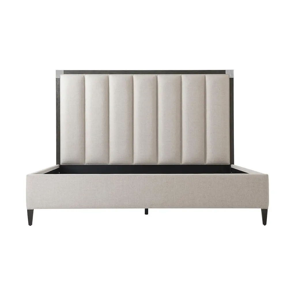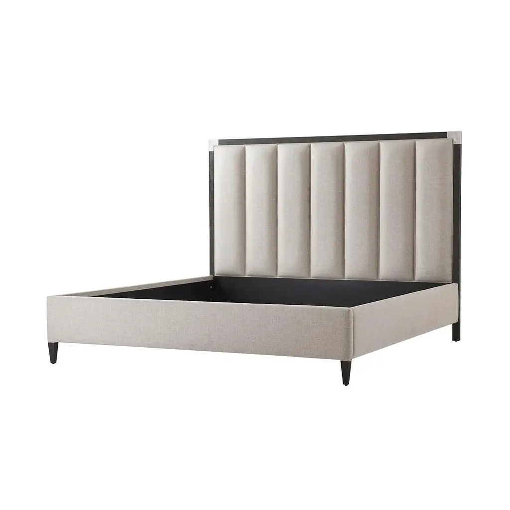 Art Deco Style bed with our Anise finish frame and brushed nickel finish corner mounts with a vertically channeled upholstered headboard, upholstered rails and raised on tapered legs.Dimensions: 81" W x 89.25" D x 59" HShown in draper performance-UP5409 Fabric.For US King mattress - 76 x 80".