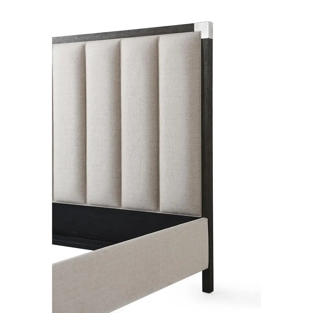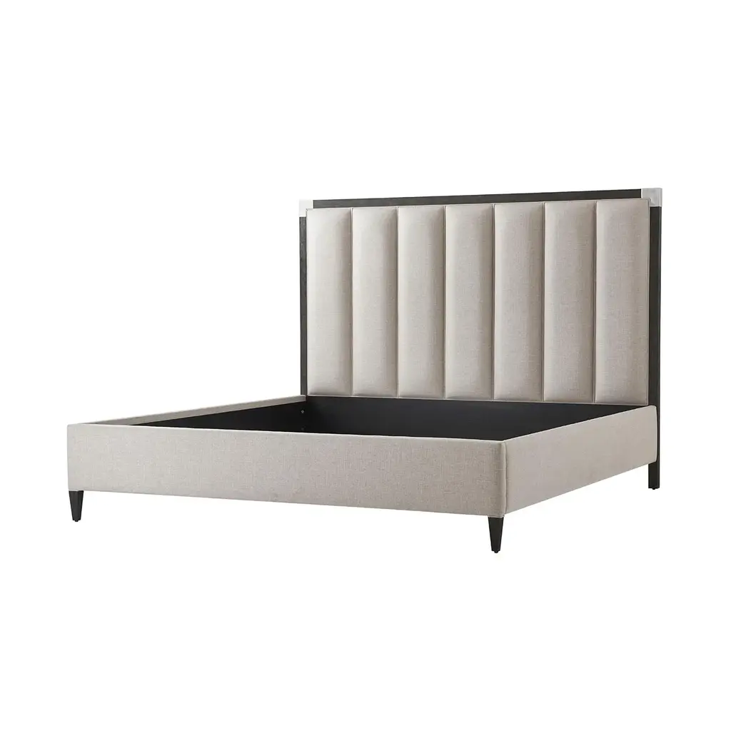 Art Deco Style bed with our Anise finish frame and brushed Nickel finish corner mounts with a vertically channeled upholstered headboard, upholstered rails and raised on tapered legs. Dimensions: 81" W x 89.25" D x 59" H Shown in Draper Performance-UP5409 Fabric For US King mattress - 76 x 80"