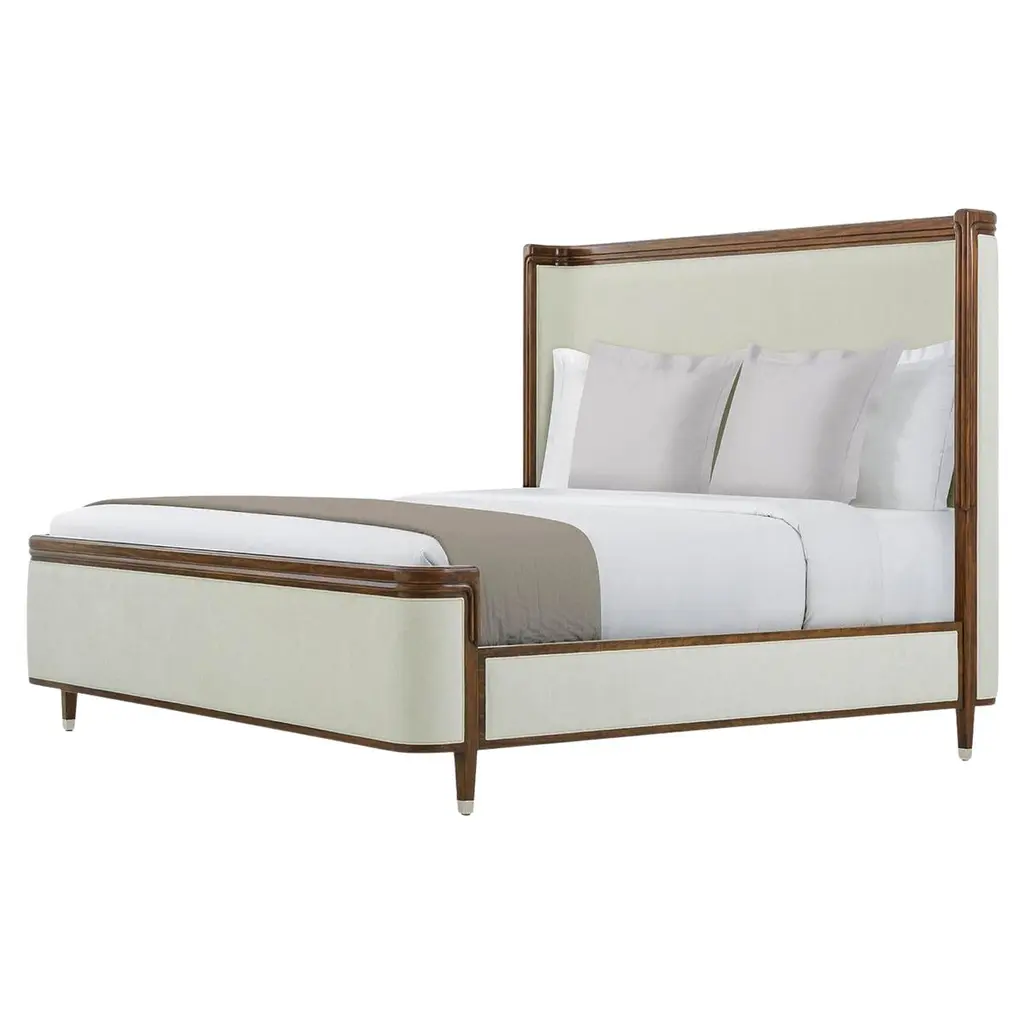 Inspired by the luxurious craftsmanship of the Art Deco period. The decorative stepped motif, a hallmark of early Art Deco design, is elegantly showcased throughout the frame, paying homage to timeless architectural influences. Crafted and finished in a rich walnut, this bed captures the allure of vintage glamour while seamlessly fitting into modern interiors.The headboard and footboard are upholstered in Marshmallow Performance fabric, offering both a plush feel and lasting durability. The contrast between the smooth, polished walnut and the soft, neutral upholstery enhances the bed’s opulent appeal. Designed as a statement piece, bed is perfect for those who appreciate a blend of historical grandeur and contemporary refinement, bringing an air of timeless elegance to any bedroom setting.Dimensions: US King: 81.5" W x 86.25" D x 64" H
