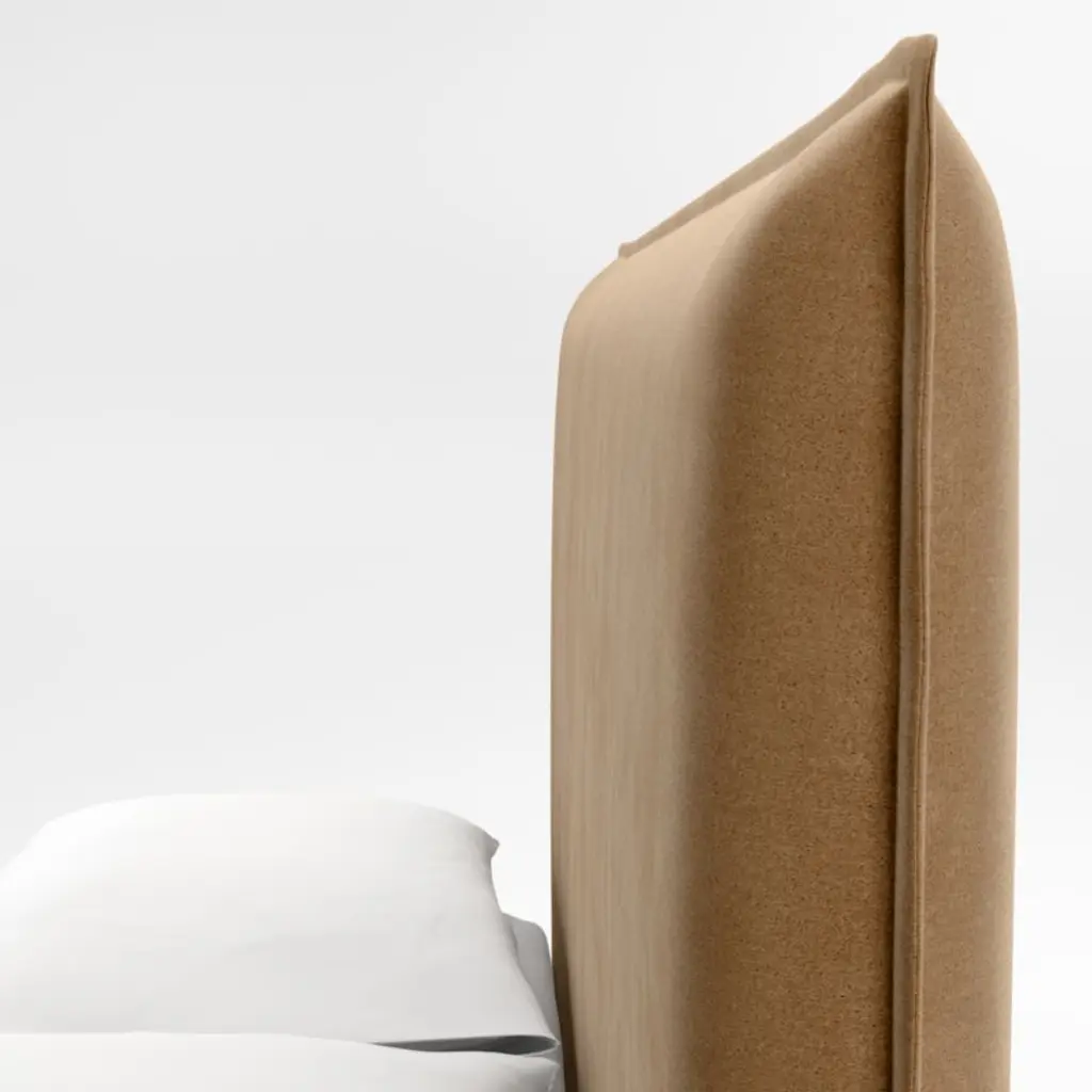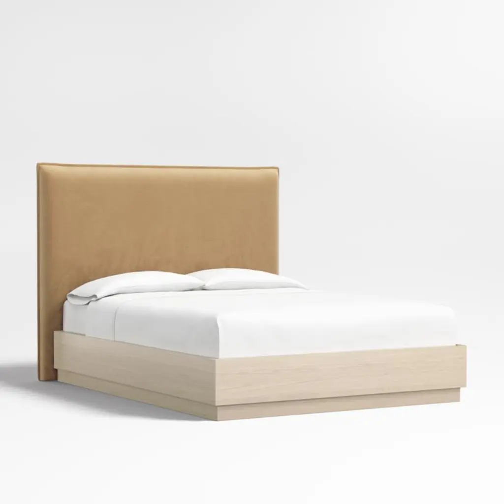 Our custom bed collection lets you mix and match our top-selling headboards and bases for a look that's truly yours. Upholstered in camel brown faux mohair with a casual flange border, our coastal-cool Arvada headboard offers pillow-like comfort. The Batten bed base complements Arvada's clean yet relaxed silhouette with a sleek plinth design and the lively grain of oak veneer enhanced with a light white oak finish.By choosing FSC ®-certified furniture, you are supporting responsible management of the world's forests.