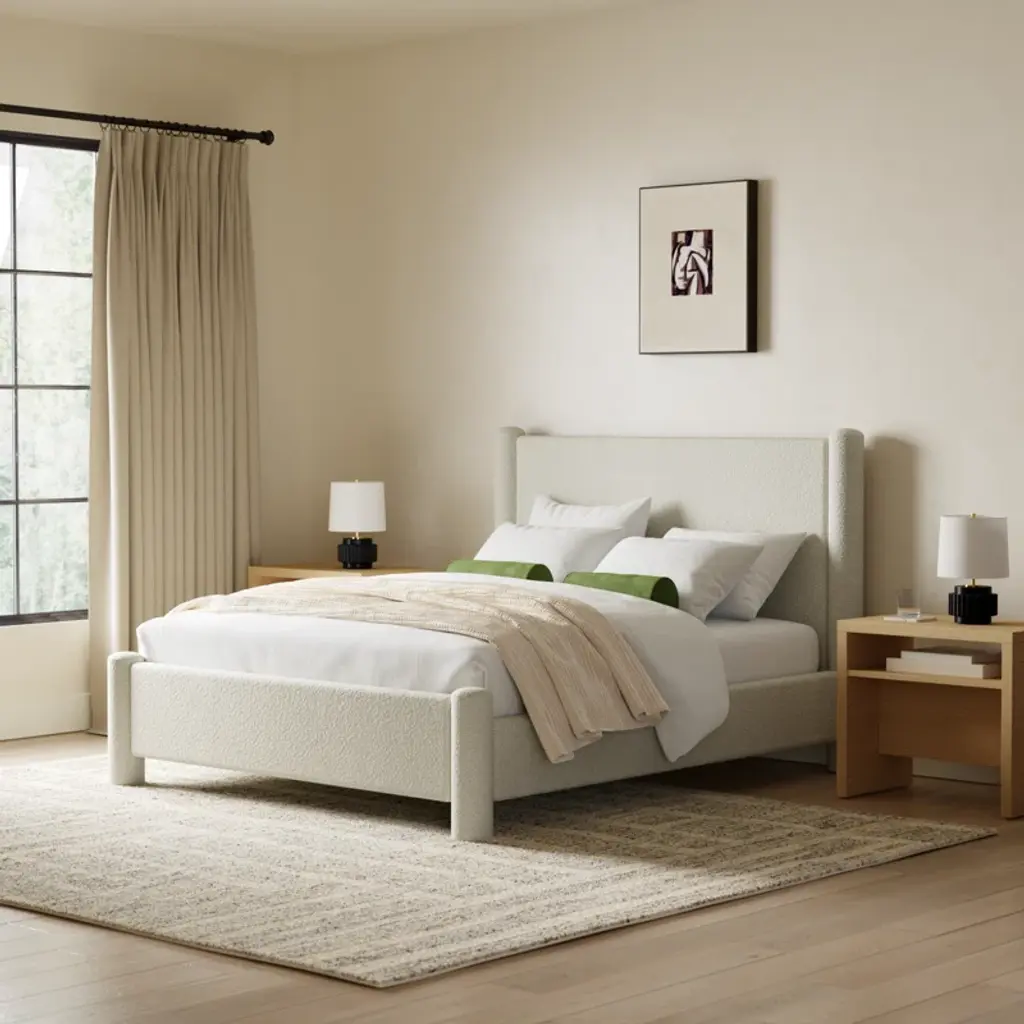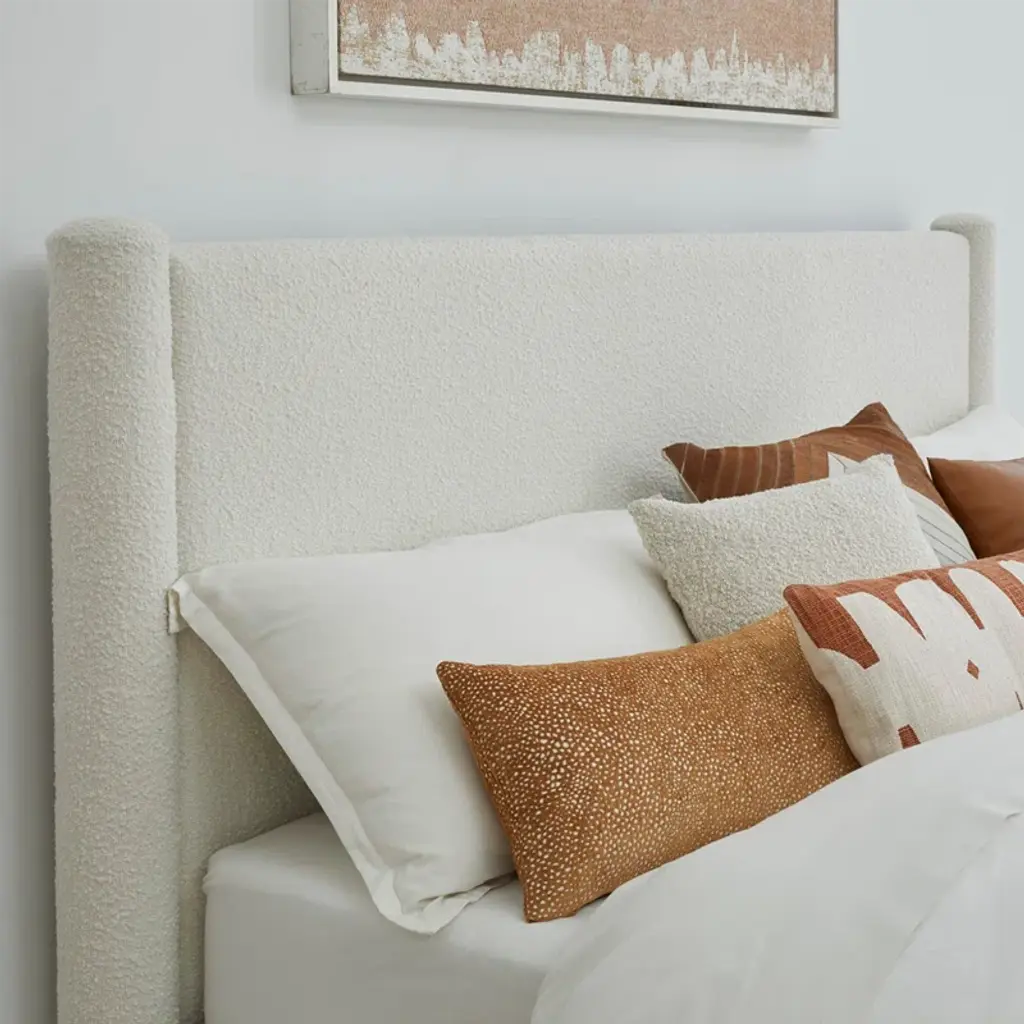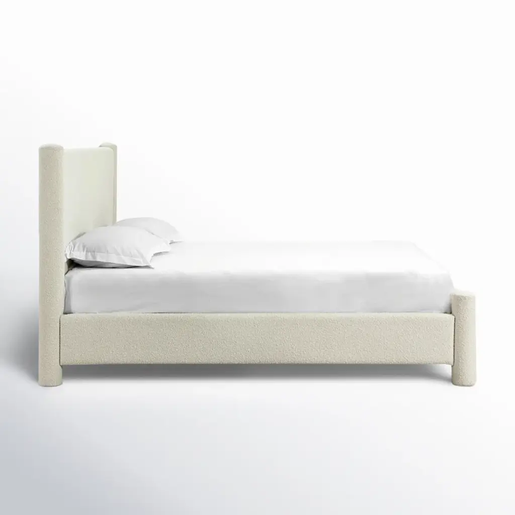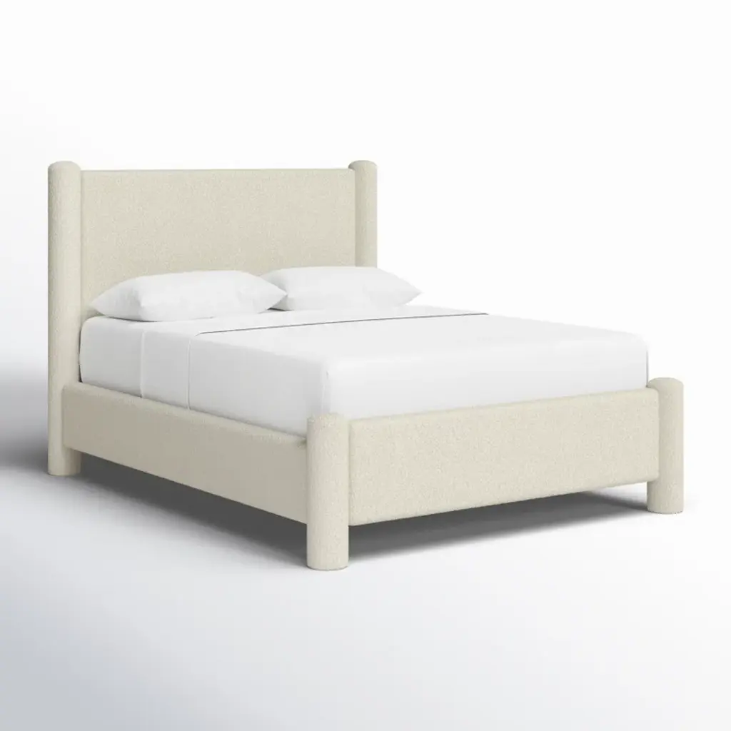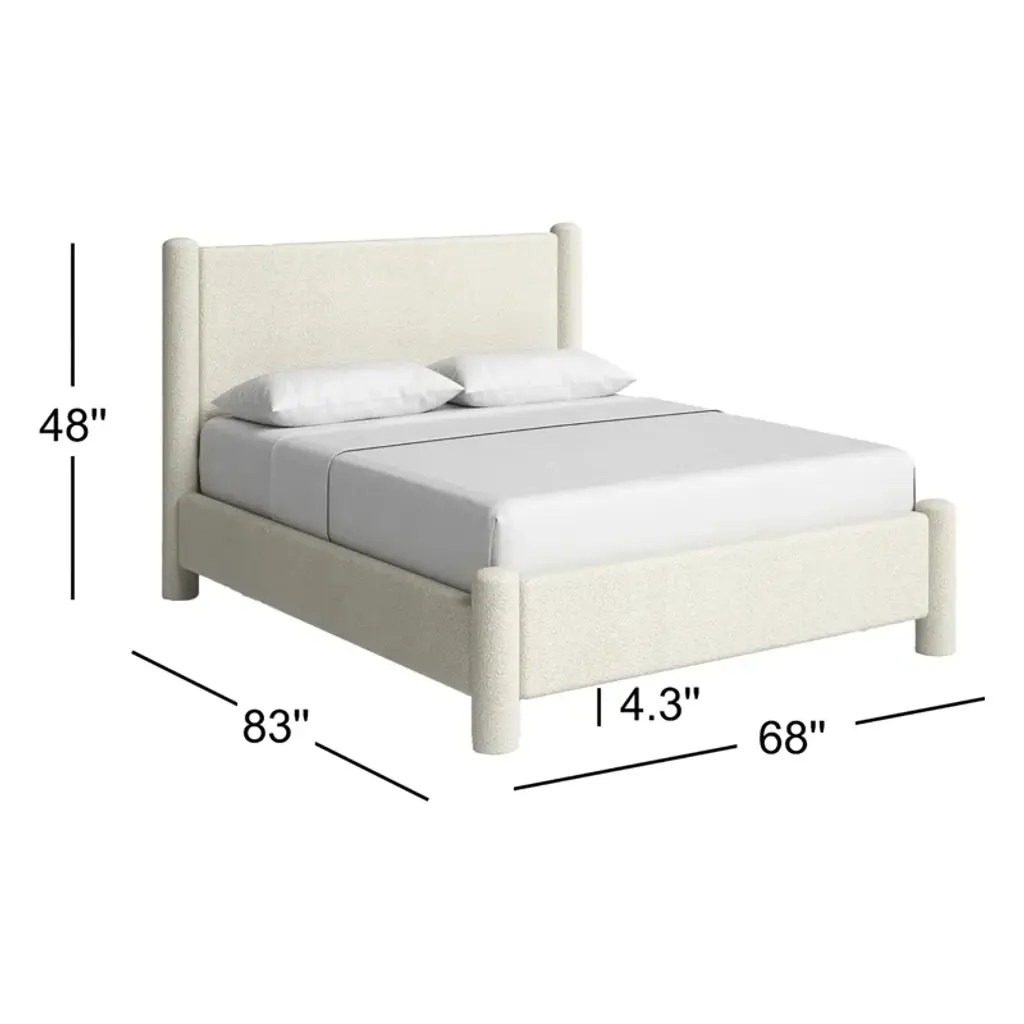 Our platform bed anchors your sleeping space with its round bed posts and tactile bouclé fabric. It has a mid-height headboard that opens up your bedroom, and it's padded for the perfect place to prop up when reading. Fully wrapped in tan upholstery, it’s easy to blend with your existing color scheme. Slats and center legs support your mattress (sold separately) – no box spring needed.