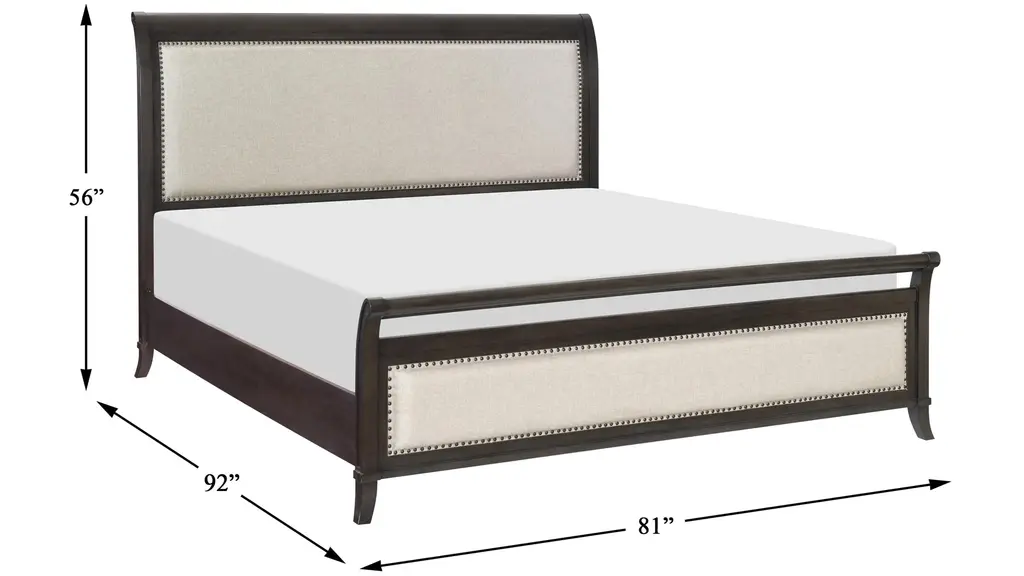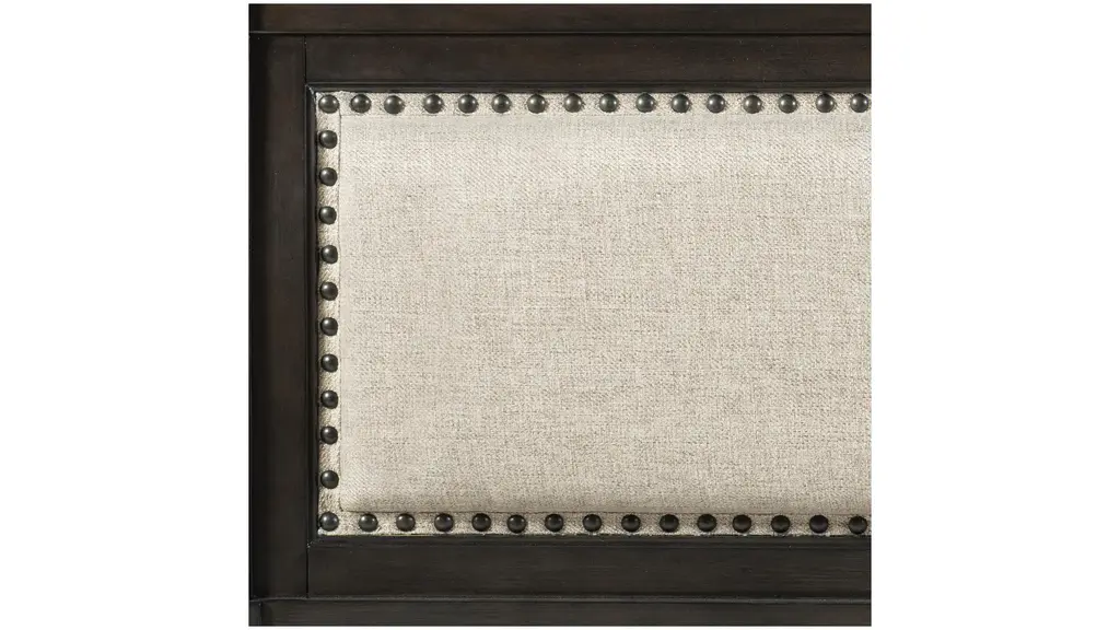 The transitional styling of the Ashden Upholstered Bed creates a versatile look for your bedroom. The bed has a subtle curve to its profile with its upholstered headboard and footboard featuring beige woven fabric and nailhead accent. A dark cherry finish accentuates the birch veneer and poplar solids of the Ashden Collection.
