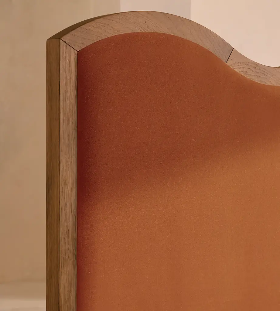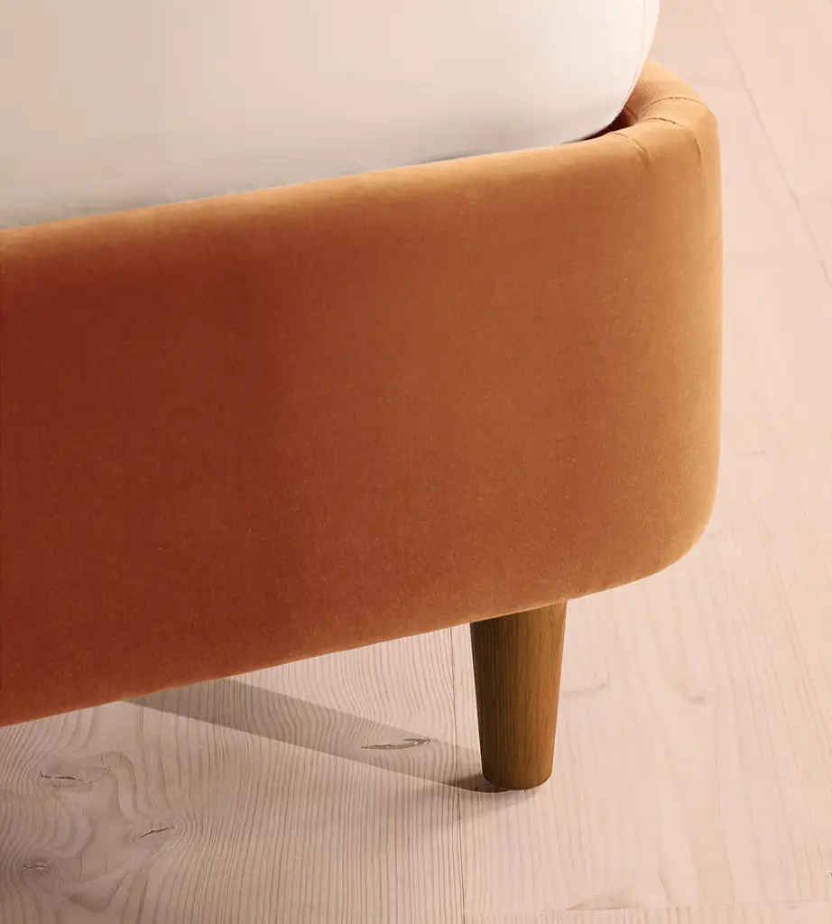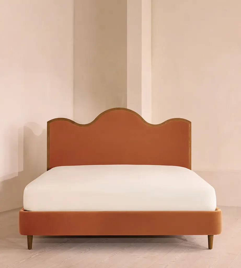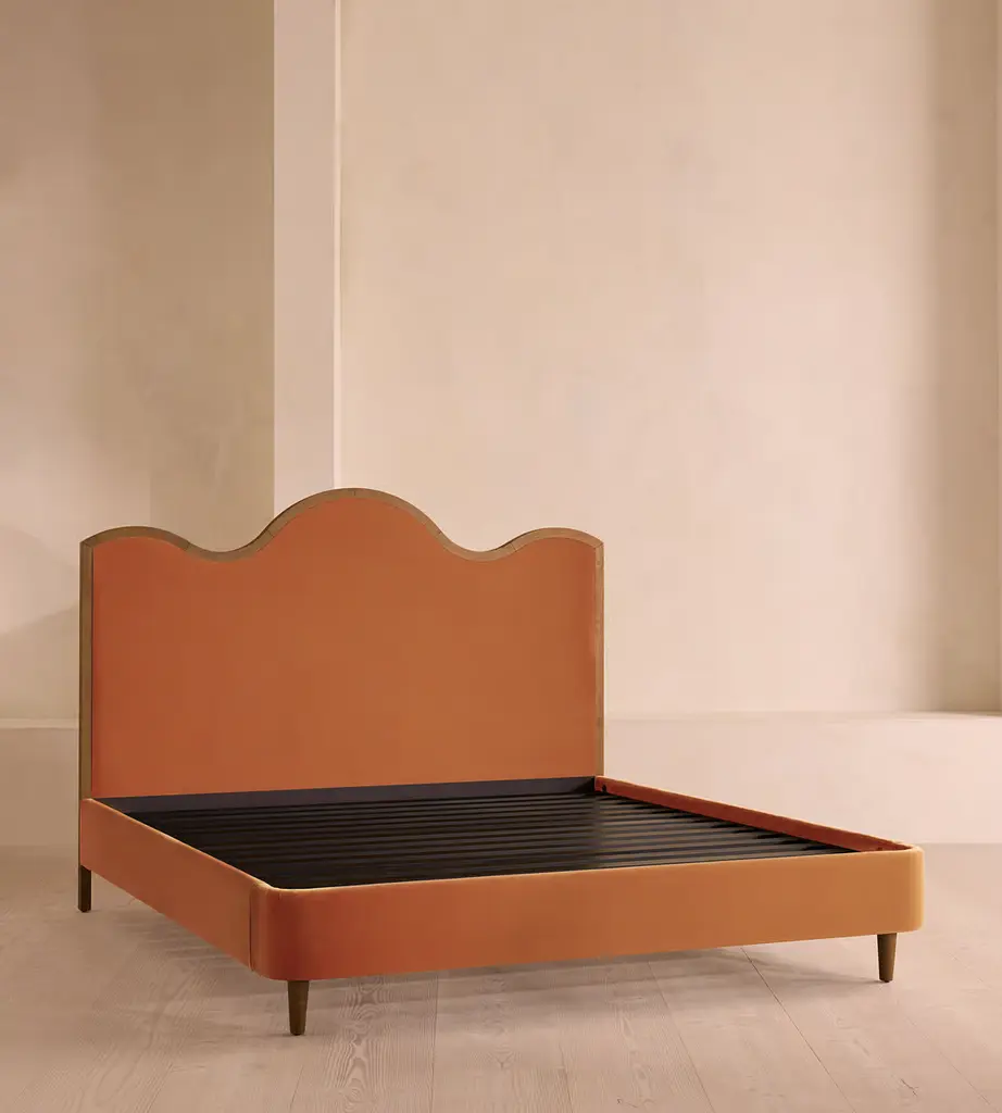 A waved headboard fully upholstered in velvet is framed with a solid oak border. The solid oak frame of our Aubrey bed creates a low, relaxed profile perched on tapered wooden legs. Characterized by its eye-catching, waved headboard, this style is upholstered in velvet designed to match back to the rest of our collection.