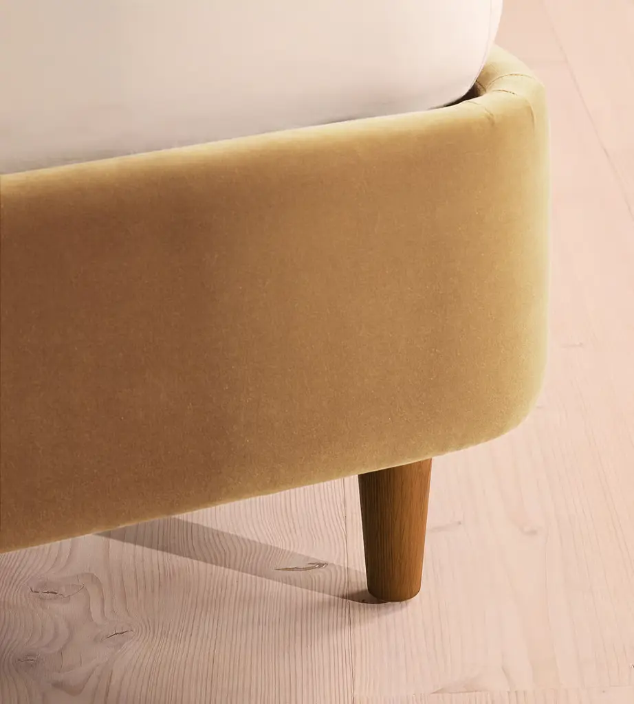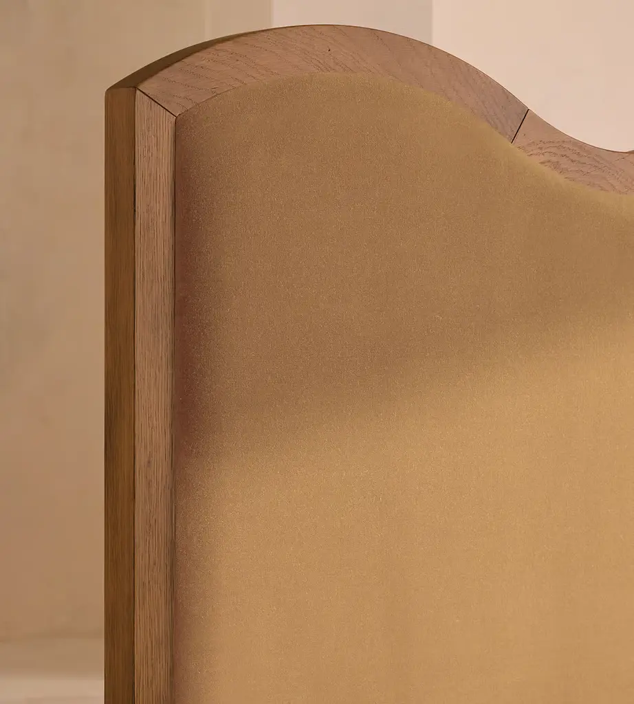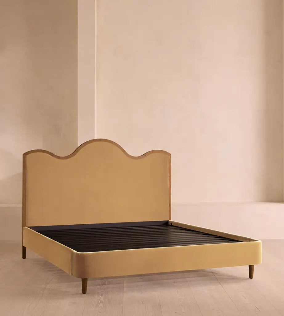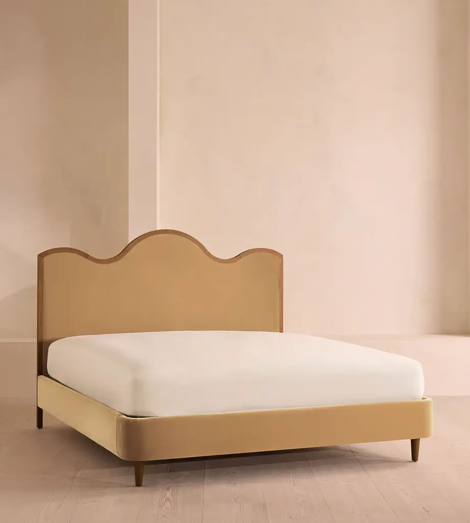 A waved headboard fully upholstered in velvet is framed with a solid oak border. The solid oak frame of our Aubrey bed creates a low, relaxed profile perched on tapered wooden legs. Characterized by its eye-catching, waved headboard, this style is upholstered in velvet designed to match back to the rest of our collection.