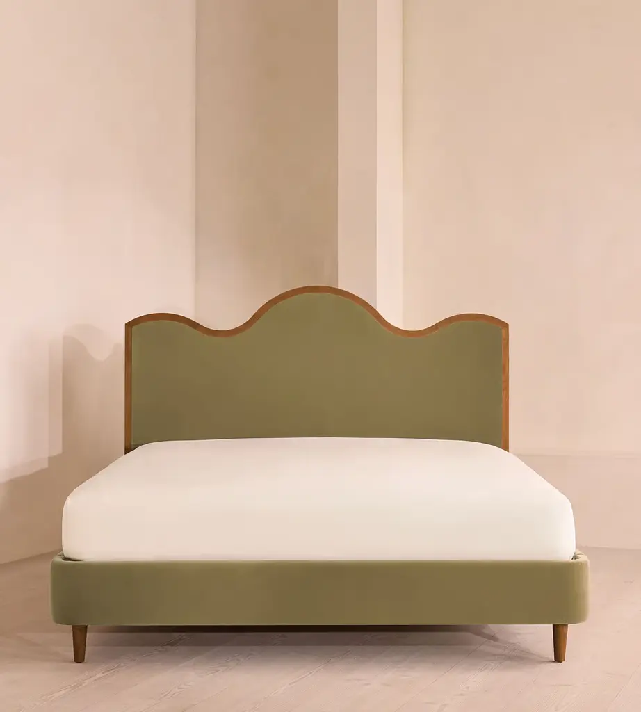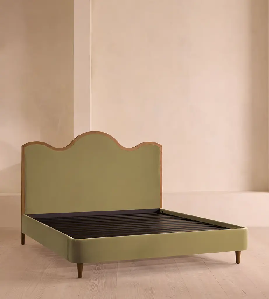 A waved headboard fully upholstered in velvet is framed with a solid oak border. The solid oak frame of our Aubrey bed creates a low, relaxed profile perched on tapered wooden legs. Characterized by its eye-catching, waved headboard, this style is upholstered in velvet designed to match back to the rest of our collection.