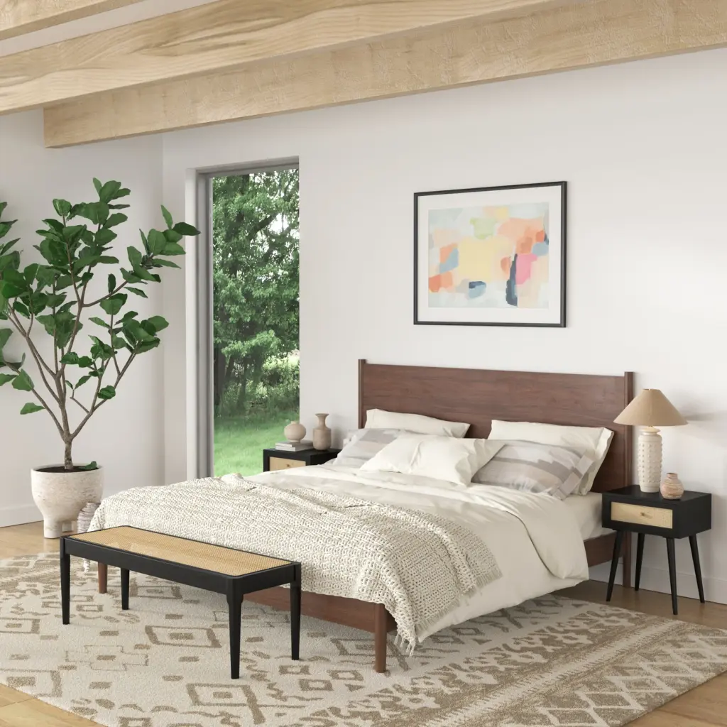 Sure to become the focal point of your bedroom, the Avalon bed features a clean, streamlined design with a rich and inviting look. Crafted on a solid wood frame with an American Walnut wood veneer headboard, this bed offers the perfect silhouette to your room. Its deep neutral tones bring a calming effect, while also allowing you to make it your own with any pop of color.