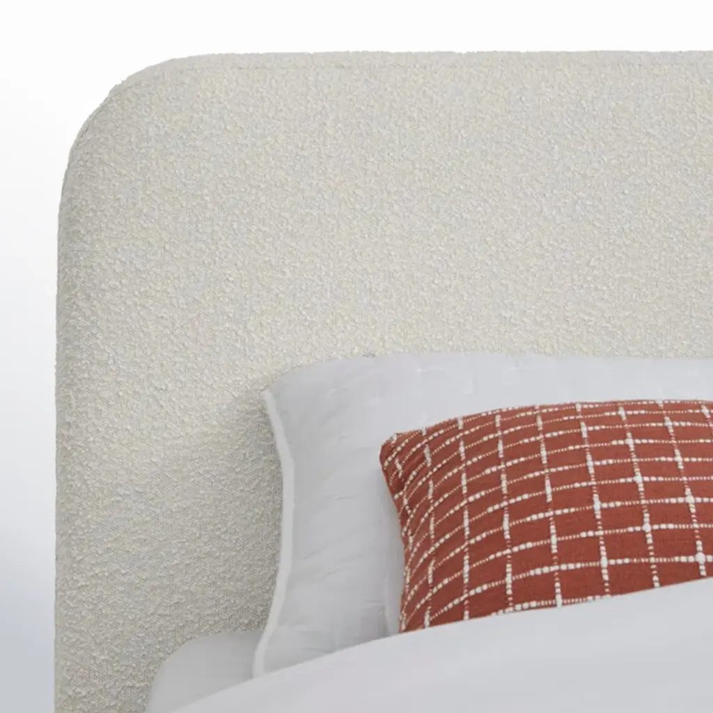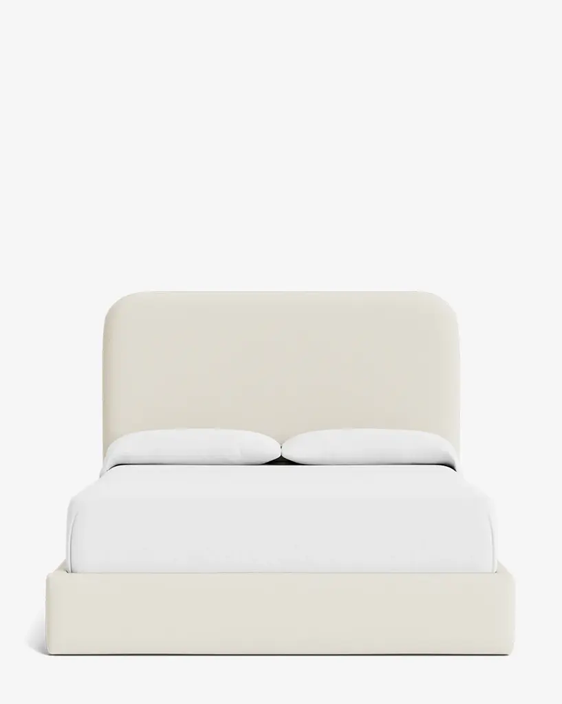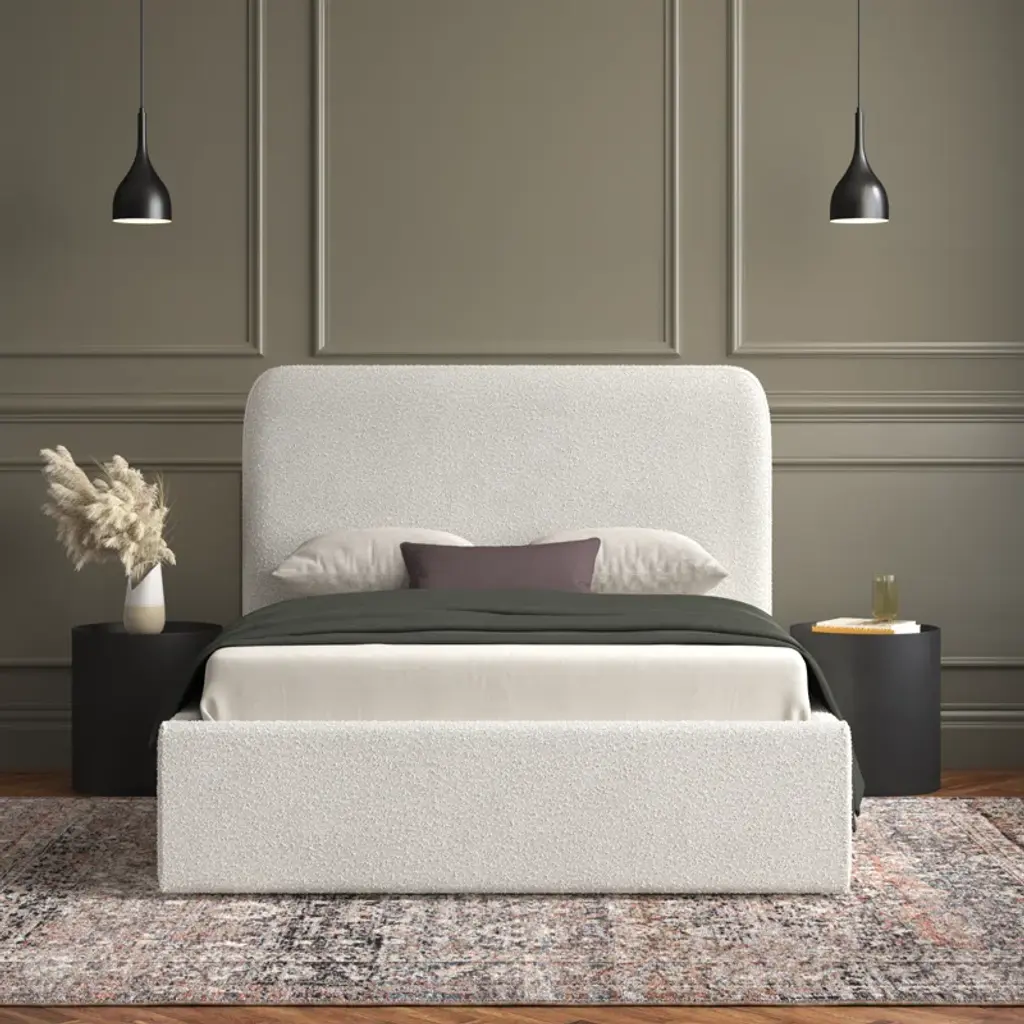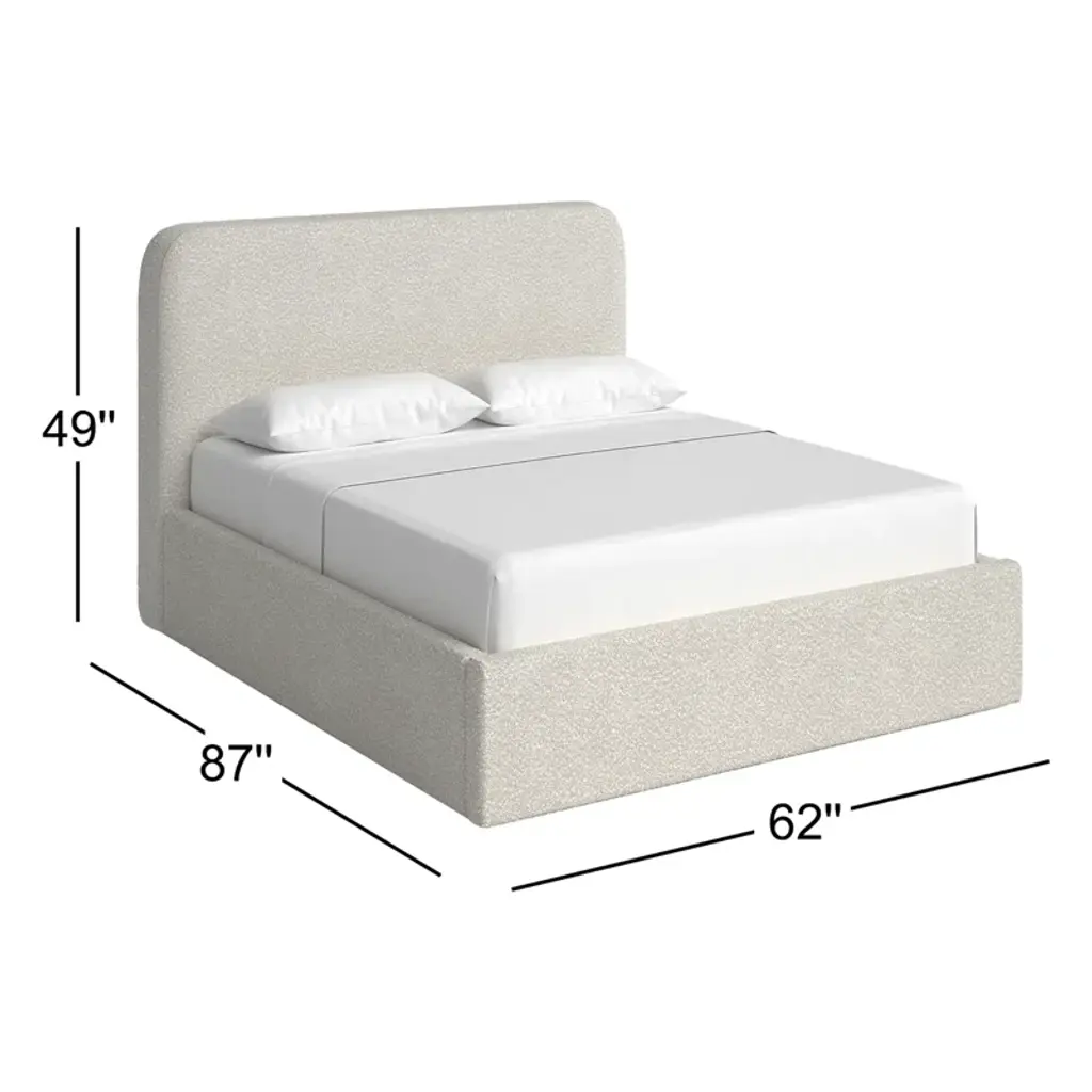 Dreamy nights await. Our upholstered bed is designed with a sturdy wooden frame that’s wrapped in a cozy bouclé fabric. The off-white hue of the upholstery adds a bit of warmth to the look, while the foam-padded, rectangular headboard offers support for those late-night reads. Bonus: No box spring is needed, thanks to the included slat kit. Just add your preferred mattress and crisp new linens.