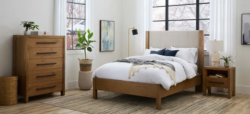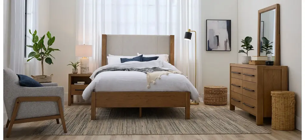 Let the beautiful oak grain and straightforward lines of the Bakersfield queen bed bring a touch of modern mission style to your home. Without unnecessary adornment, the simple design elements are the main attraction, from the large-scale posts to the vertical stitched seams on the upholstered headboard. This beautiful bed has casual, sturdy appearance thats perfect for a minimal aesthetic.
