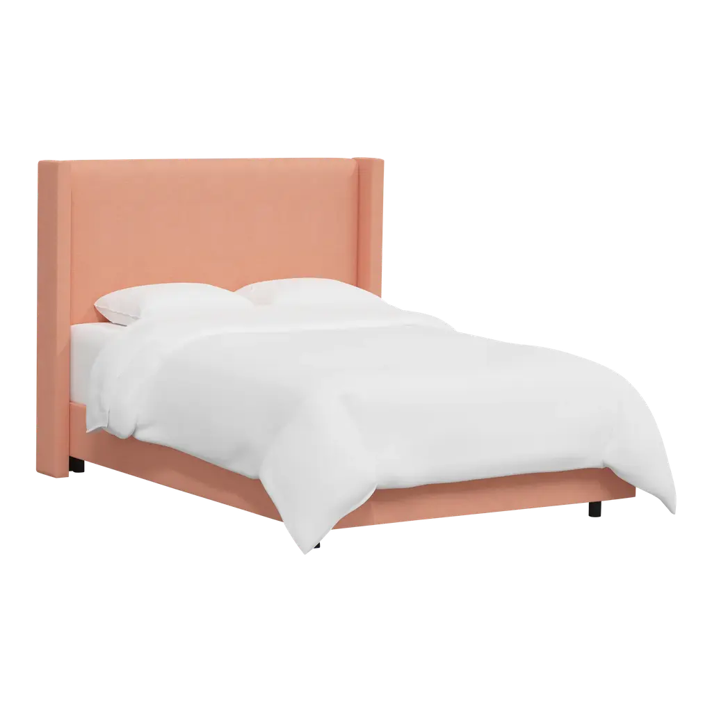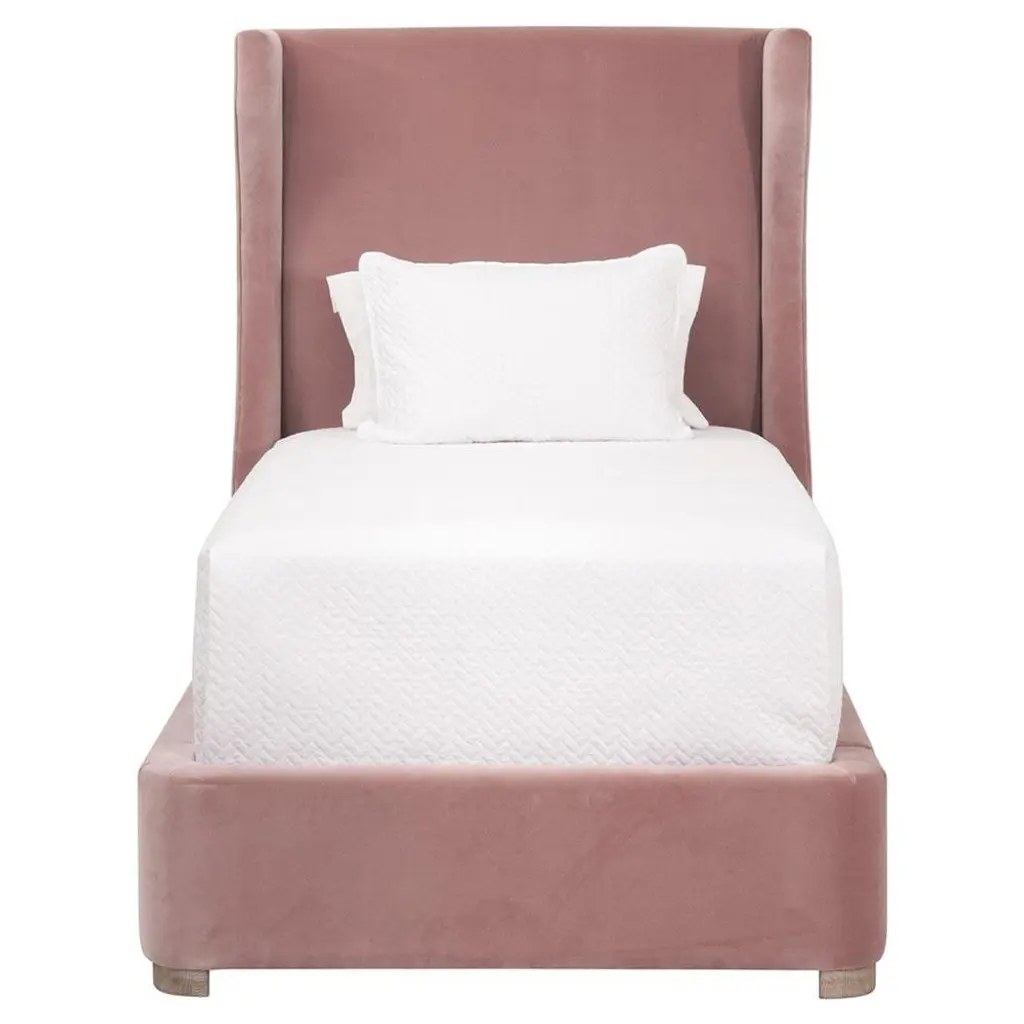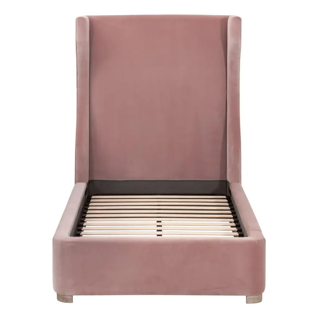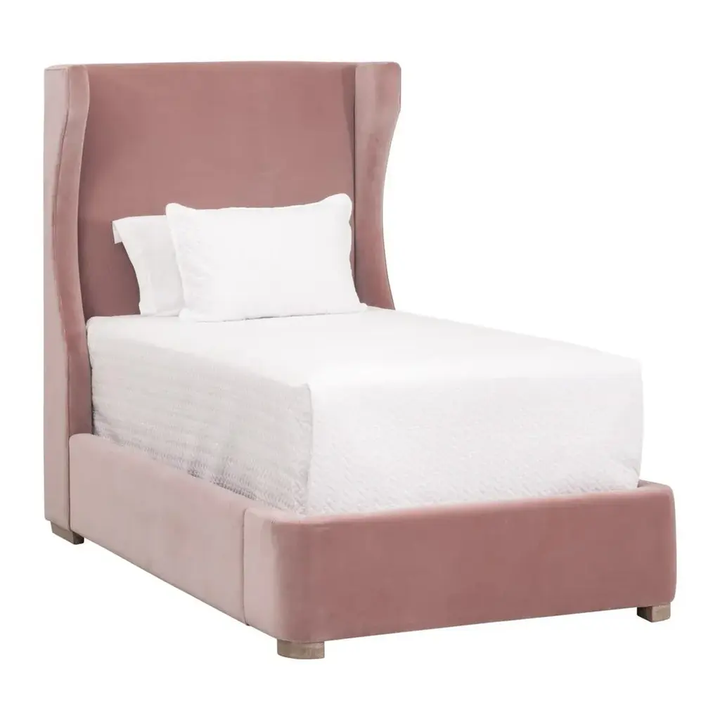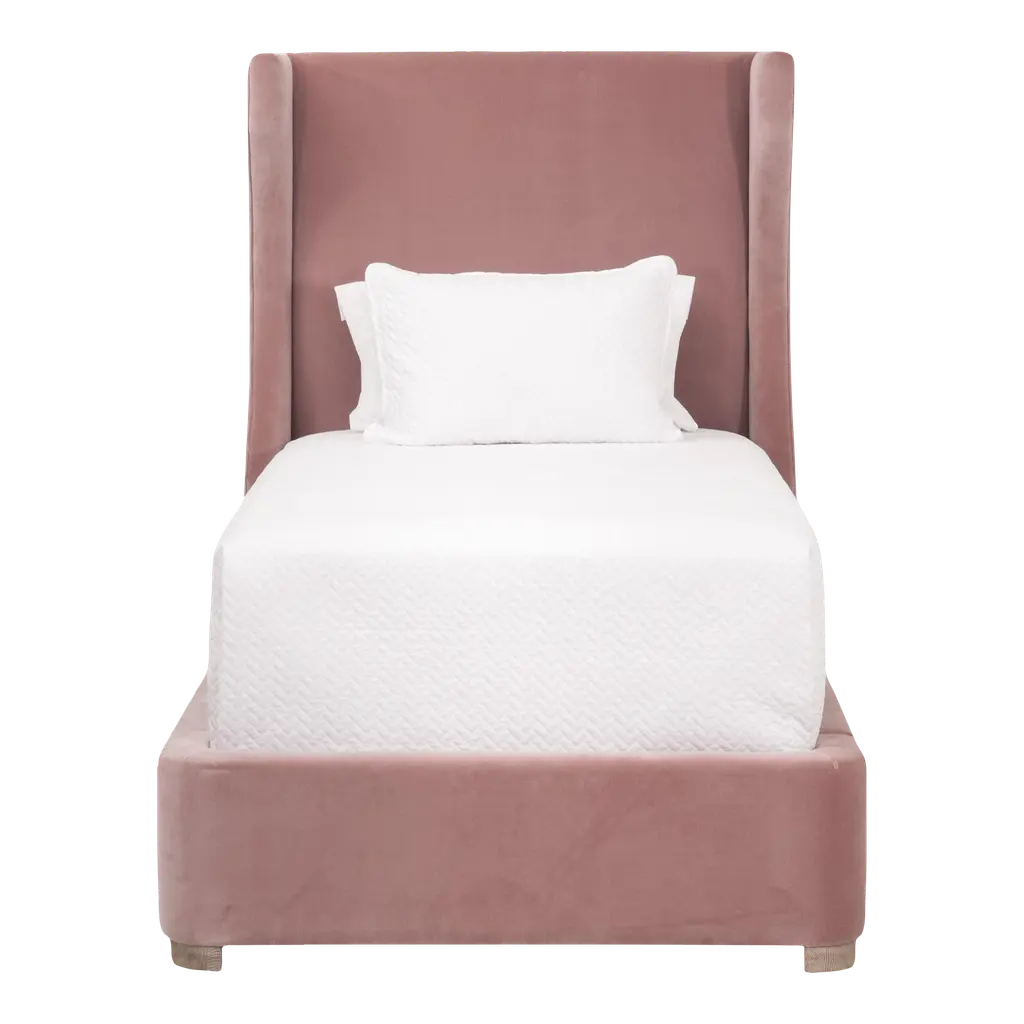 Balboa Twin Bed Transform your bedroom into a haven of style and comfort with the Balboa Twin Bed by Essentials For Living. This transitional-style upholstered bed features a wood frame with exposed natural gray oak feet, which adds a touch of sophistication to its classic look. The Petal Velvet upholstery, a blend of cotton and polyester, enhances the bed's plush and regal design. Additionally, the elegant headboard is constructed with a wingback design and edge piping detail, while the curved footboard rounds out the silhouette and complements the winged back. This bed stands at 60" high and measures 45" wide and 83.5" deep, making it an ideal fit for a twin bed and box spring, if desired. The removable metal frame European slat system ensures stability and support, making this twin bed a perfect blend of aesthetics and functionality for a restful night's sleep. Balboa Twin Bed Features: Dimensions: W 45 x D 83.5 x H 60 Weight (lbs): 147.9 Colors: Natural Gray Oak Materials: Solid Oak Wood, Plywood, Metal Unique Headboard Wing Shape Edge Piping Detail Curved Footboard Design Solid Oak Legs
