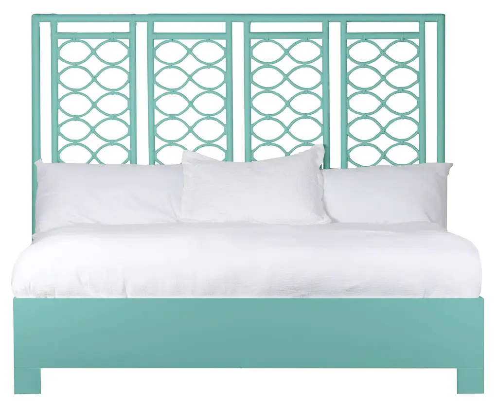 Leather-wrapped bent rattan on the headboard and footboard and woven raffia panels framed by bamboo carvings on the side rails define this elegant island bed. The sophistication of the design evokes the look of extravagant resort living.