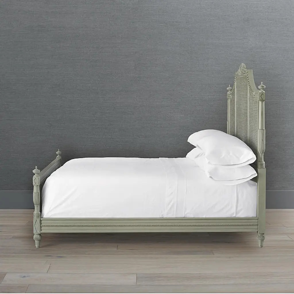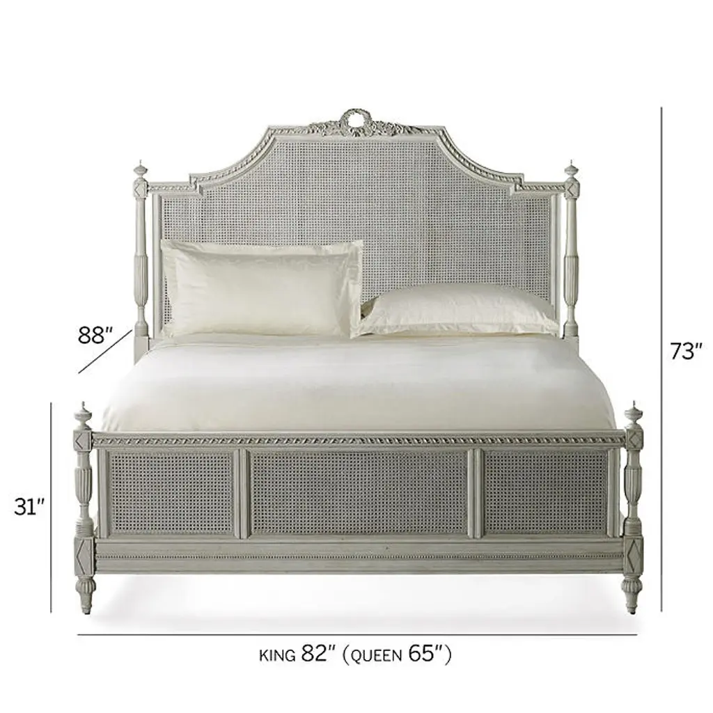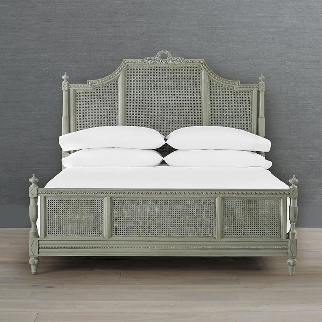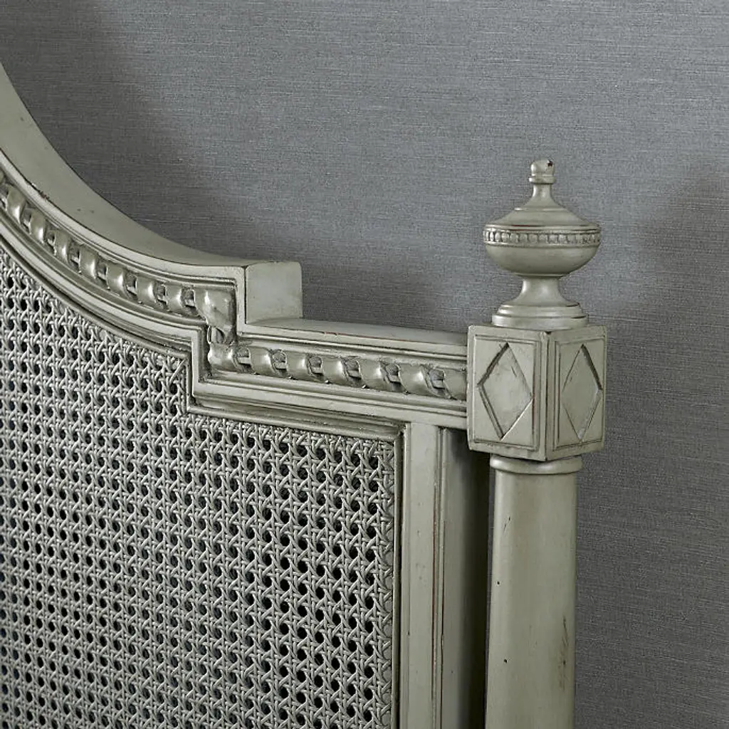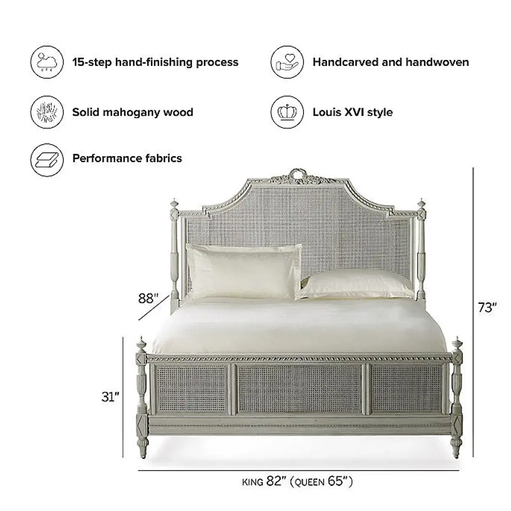 Intricate handcarved detail and handwoven cane panels distinguish our solid mahogany Beauvier Cane Bed. Crafted in the style of Louis XVI, with straight lines and classic Greco-Roman ornamentation, the bed features an exquisite, twisted ribbon carving leading up to floral swag and laurel wreath. Natural cane is double woven Each item has a 15-step hand-finishing process and aged patina; finishes may slightly vary Beaded detailing along rails and finials Seven support slats are solid mahogany and finished to match French Patina finish is a light blue/green with an antiqued glaze Back of headboard is fully finished Designed to be used with a mattress and box spring To prevent injuries or damage to item, recommended team lift (two or more people) for furniture placement Assembly Required A Frontgate exclusive. At Frontgate, our primary focus is quality. We guarantee that every product we sell will stand up to the supreme test – our customers' satisfaction. To learn more about our policies, visit our Shipping & Processing, Returns & Exchanges and Warranty & Price Guarantee pages.