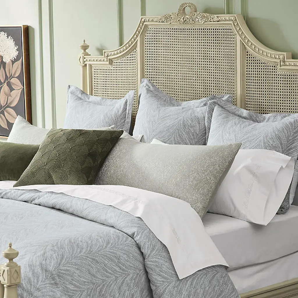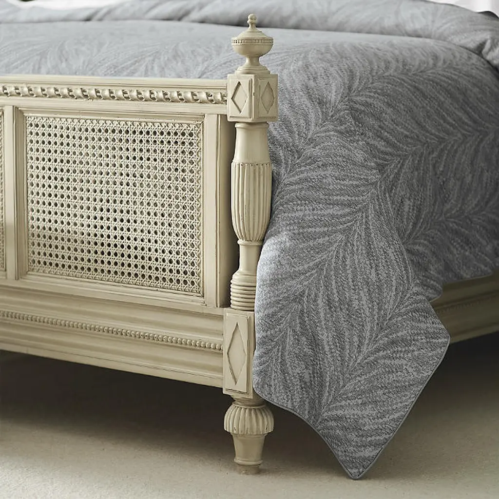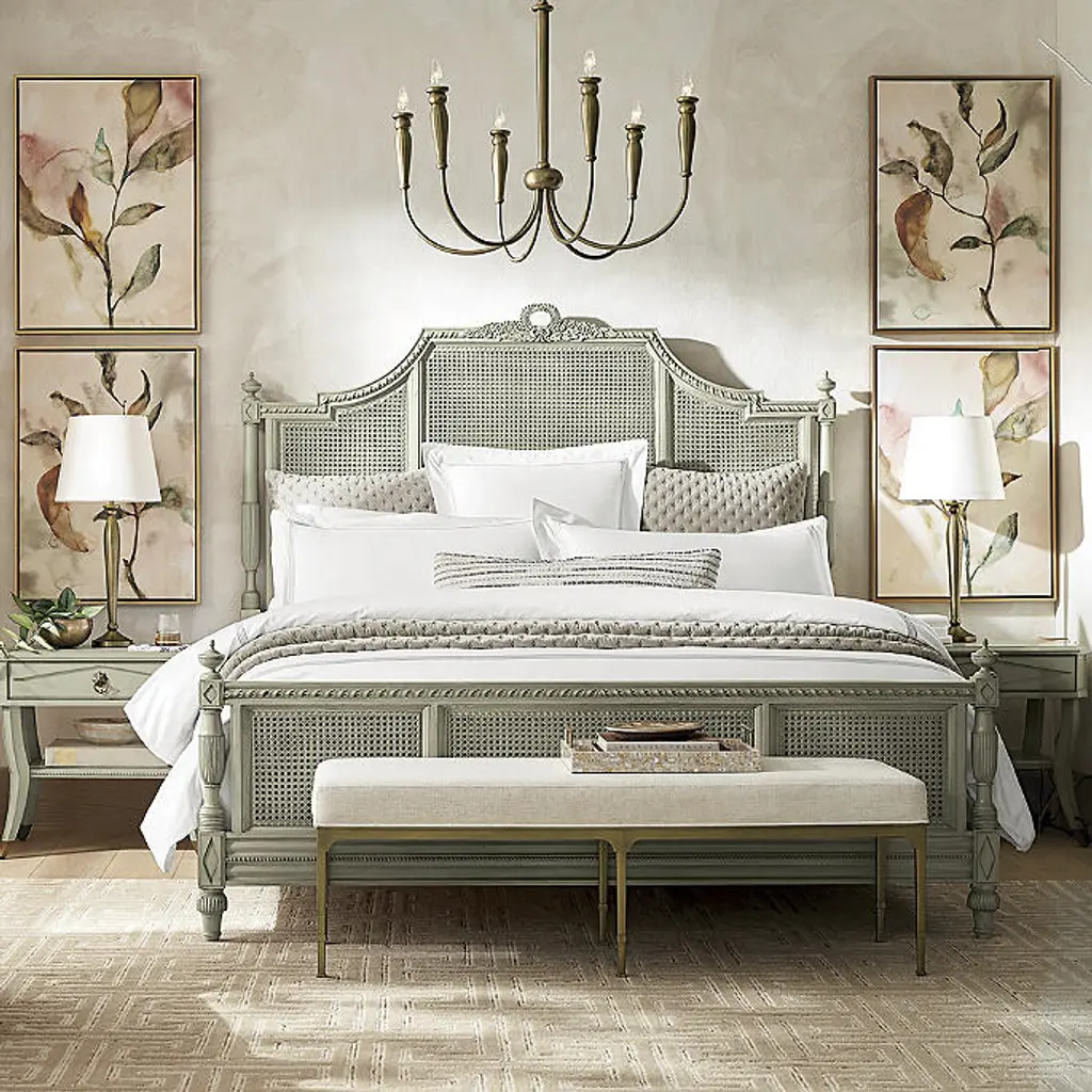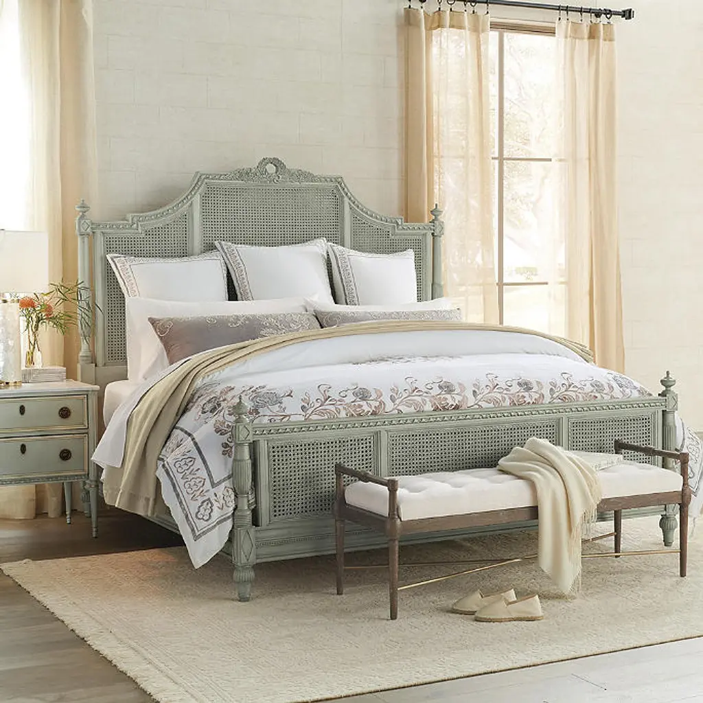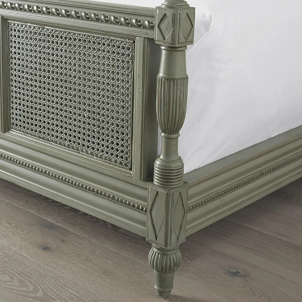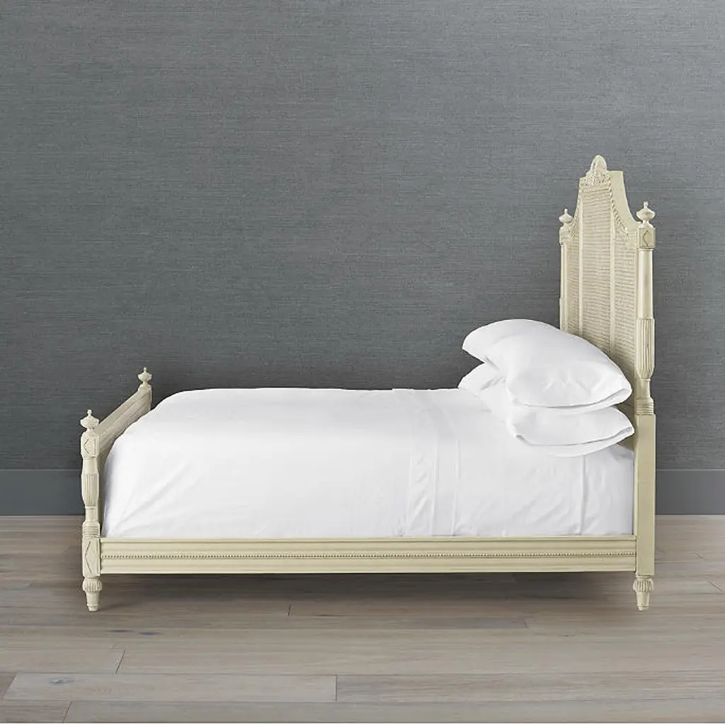 Intricate handcarved detail and handwoven cane panels distinguish our solid mahogany Beauvier Cane Bed. Crafted in the style of Louis XVI, with straight lines and classic Greco-Roman ornamentation, the bed features an exquisite, twisted ribbon carving leading up to floral swag and laurel wreath. Natural cane is double woven Each item has a 15-step hand-finishing process and aged patina; finishes may slightly vary Beaded detailing along rails and finials Seven support slats are solid mahogany and finished to match French Patina finish is a light blue/green with an antiqued glaze Back of headboard is fully finished Designed to be used with a mattress and box spring To prevent injuries or damage to item, recommended team lift (two or more people) for furniture placement Assembly Required A Frontgate exclusive. At Frontgate, our primary focus is quality. We guarantee that every product we sell will stand up to the supreme test – our customers' satisfaction. To learn more about our policies, visit our Shipping & Processing, Returns & Exchanges and Warranty & Price Guarantee pages.