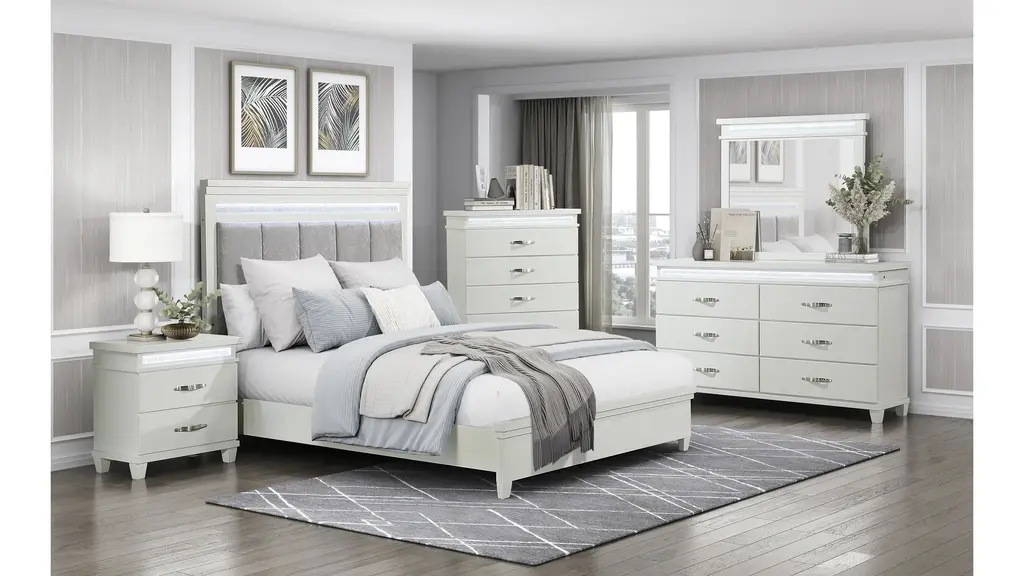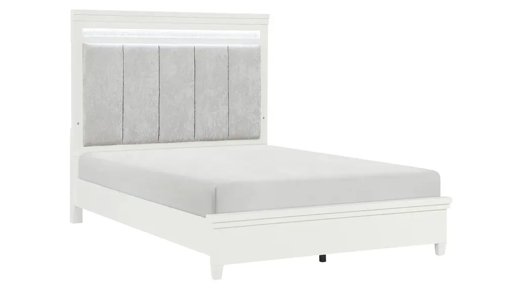 Elegance is beautifully captured in the design of the Bellamy Bed. Velvet fabric upholstery covers the panel headboard, with LED backlighting providing dramatic illumination to the collection's design. Inset faux crystal banding provides accent to each piece of the collection creating a reflective glow against the white finish.
