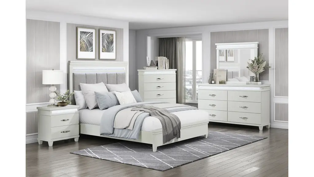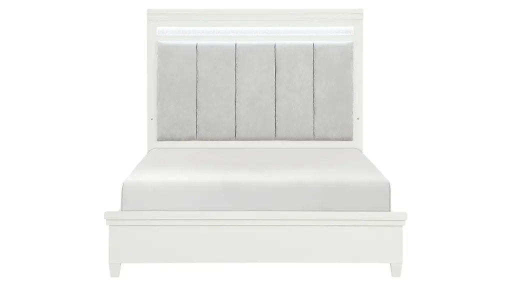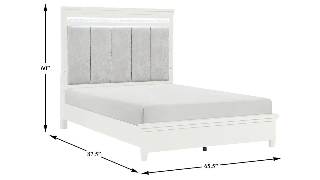 Elegance is beautifully captured in the design of the Bellamy Bed. Velvet fabric upholstery covers the panel headboard, with LED backlighting providing dramatic illumination to the collection's design. Inset faux crystal banding provides accent to each piece of the collection creating a reflective glow against the white finish.