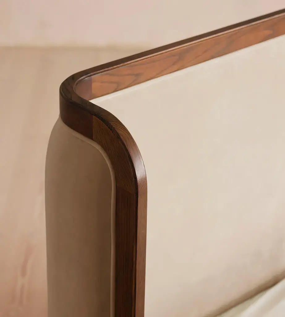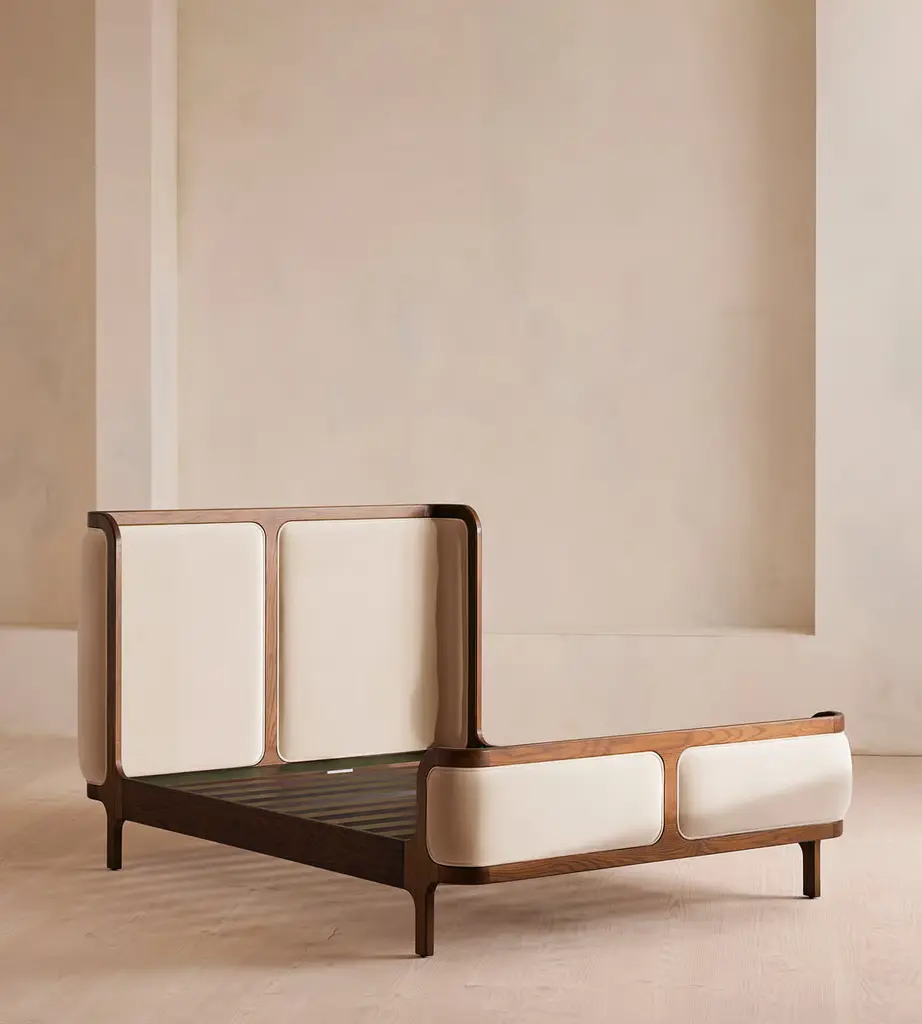 Our Belsa bed creates an enveloping feel with a wraparound headboard and footboard in solid oak and rich velvet upholstery. Taking cues from the mid-century-style beds at White City House, layer with a mix of textiles for a cozy and inviting set-up.